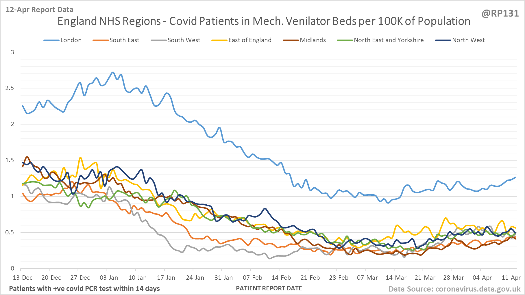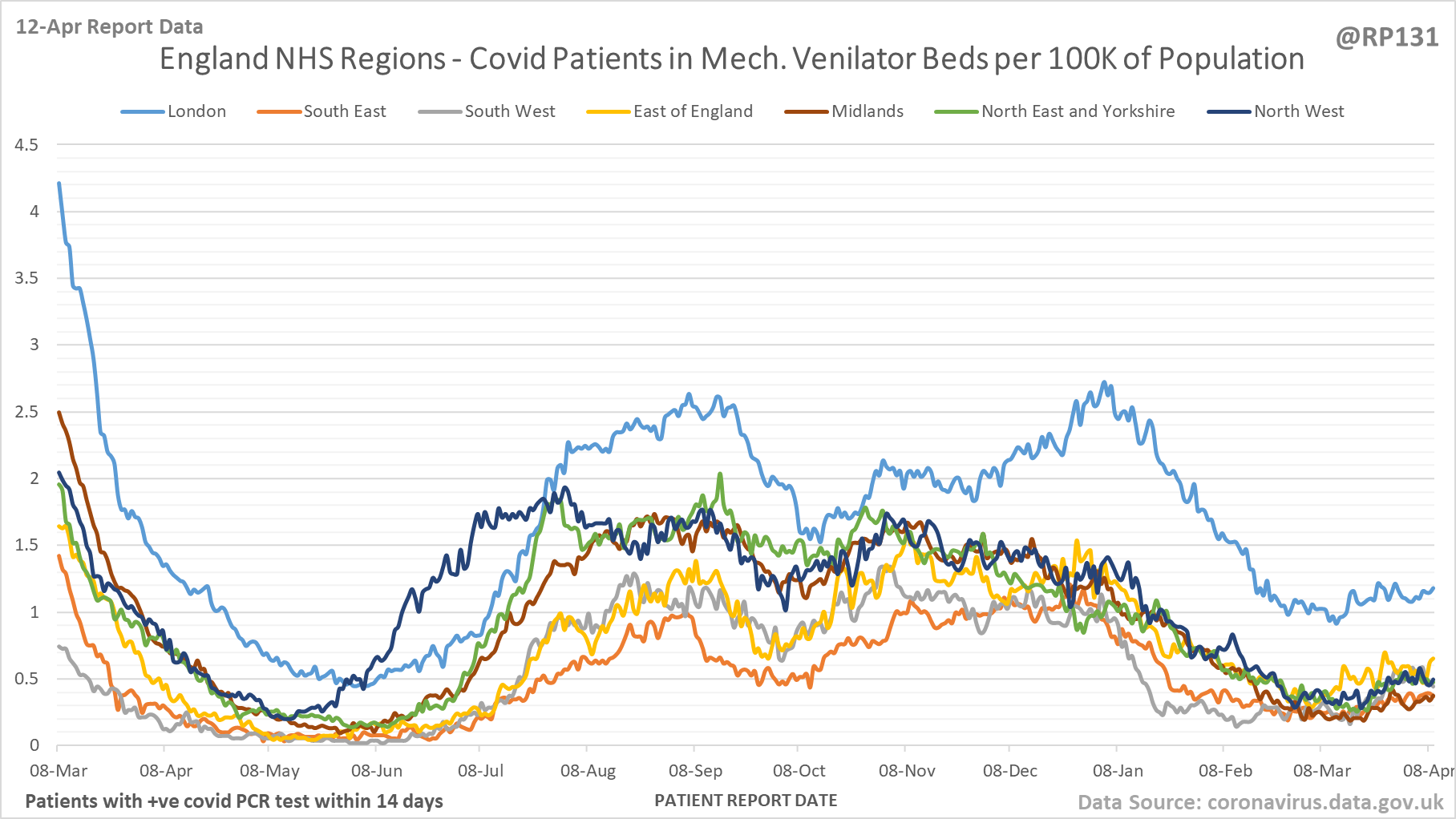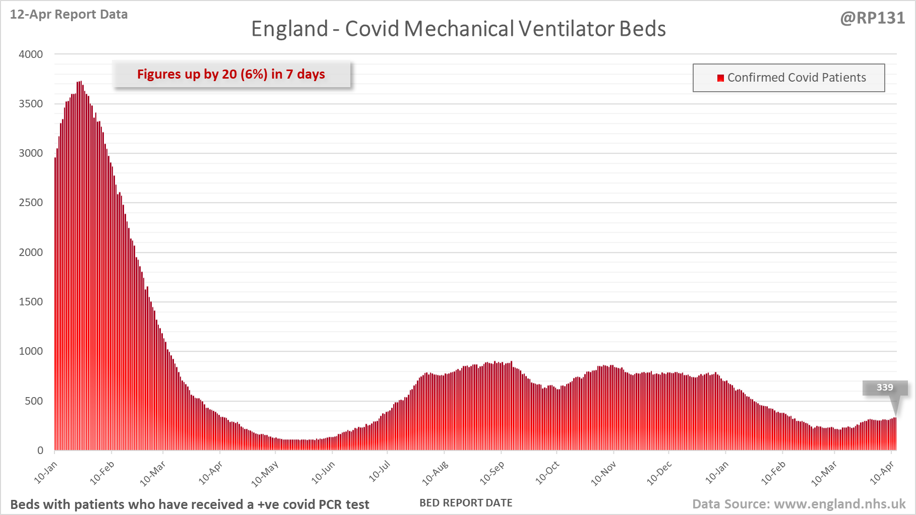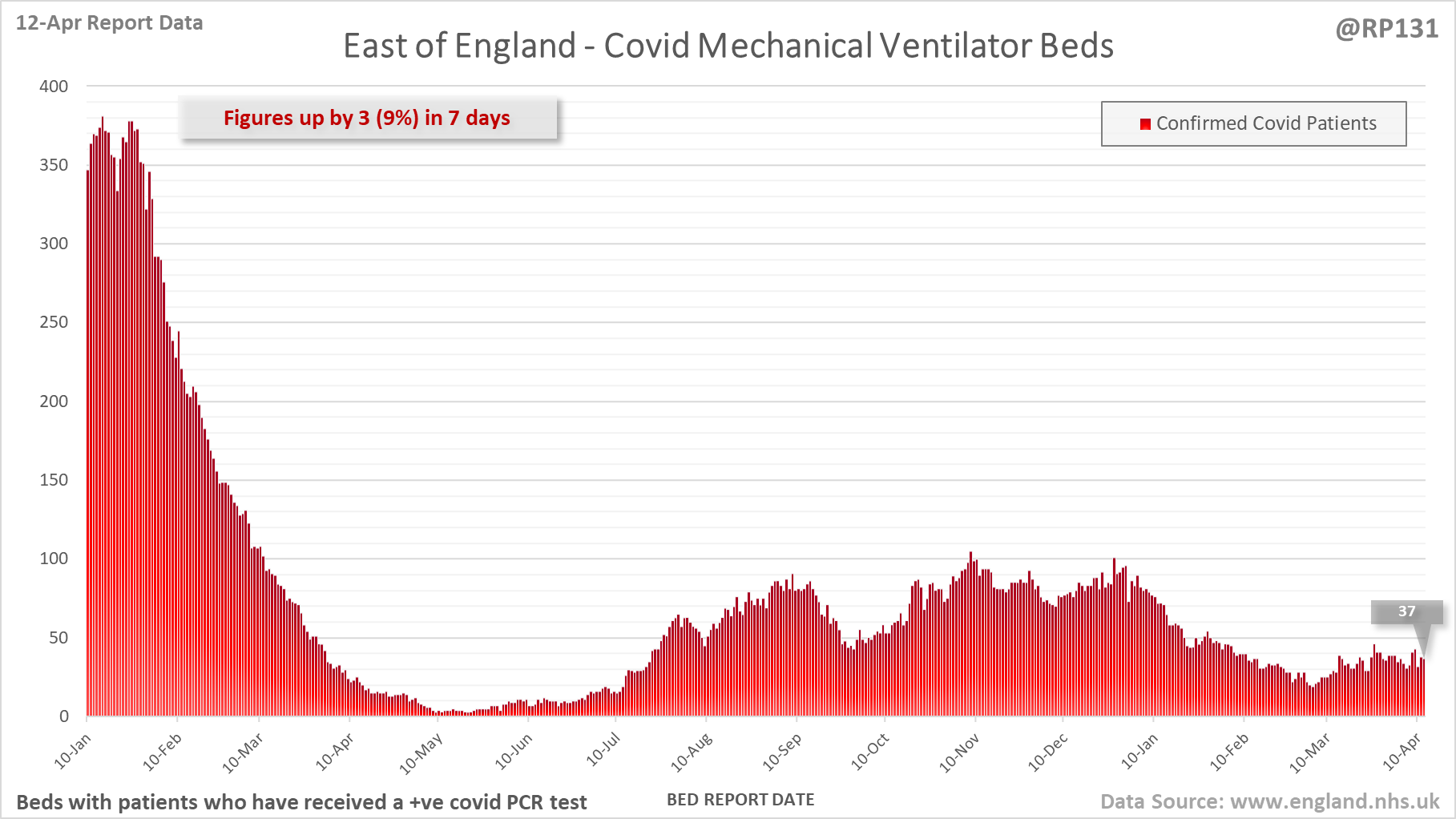 [7/27] Latest view on England mechanical ventilator beds (with a positive covid test), as of 8am on 12-Apr.