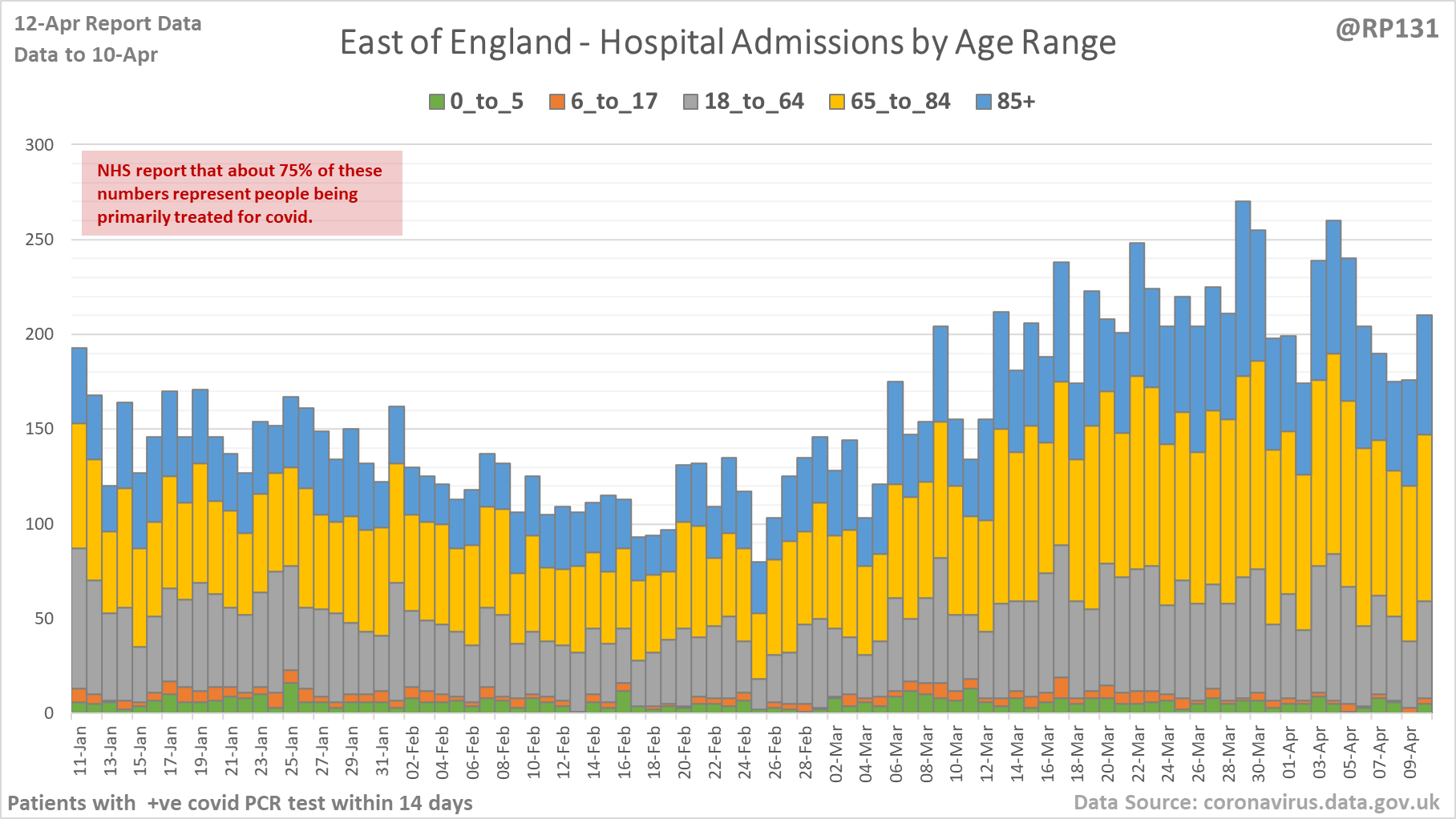 [12/27] Age ranges of England hospital admissions. Note this age-range data lags a day or so behind the above totals data.