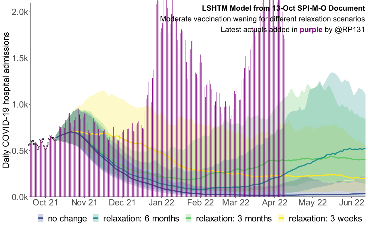 [20/27] Closer look at current hospital occupancy actuals against Imperial/Warwick models for scenarios 2 and 3, which I think are the closest to the gov't adopted roadmap.