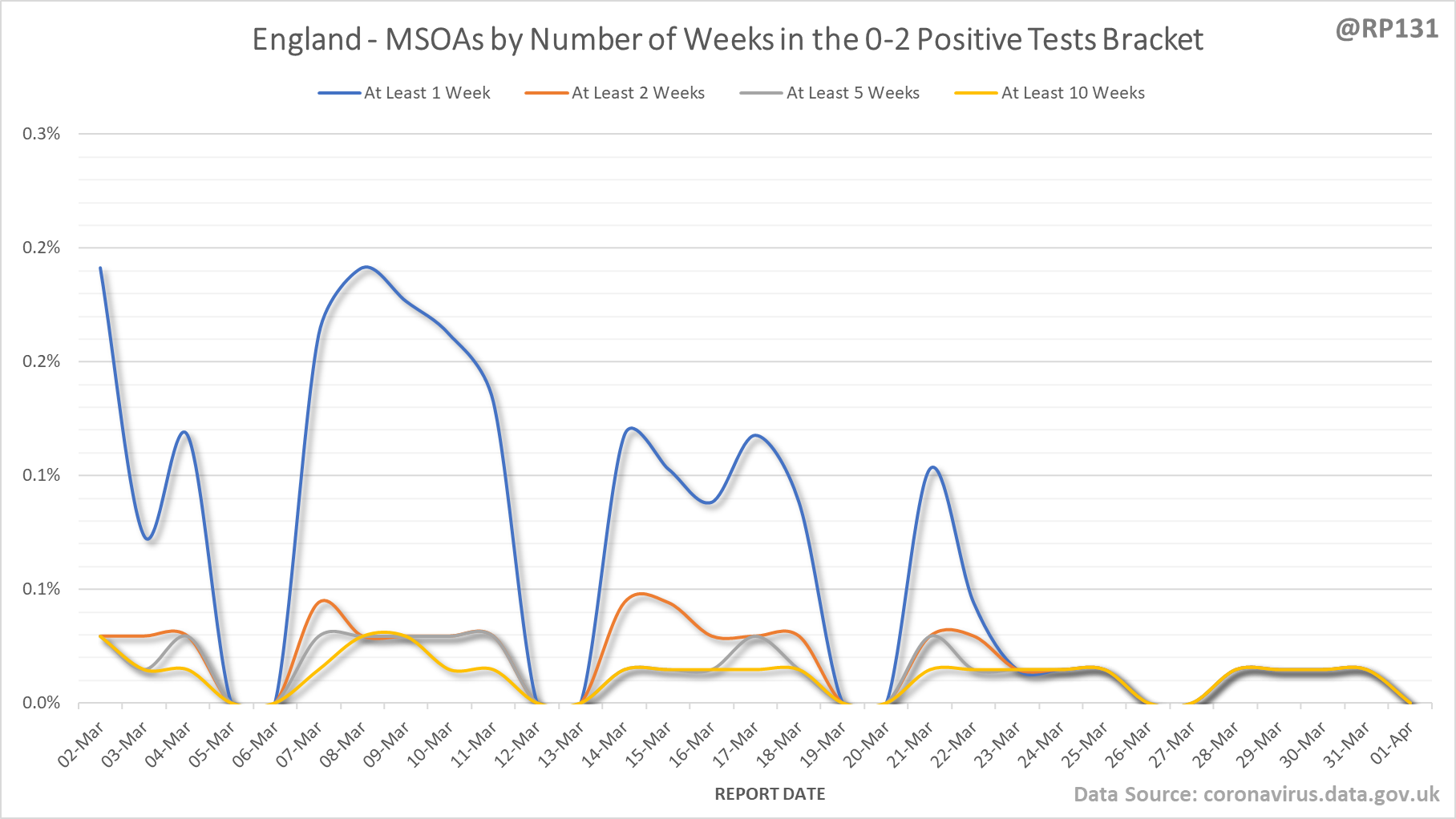 E.g. up to 27-Mar, 0% of England MSOAs have gone at least a week with fewer than 3 new positive tests per week.