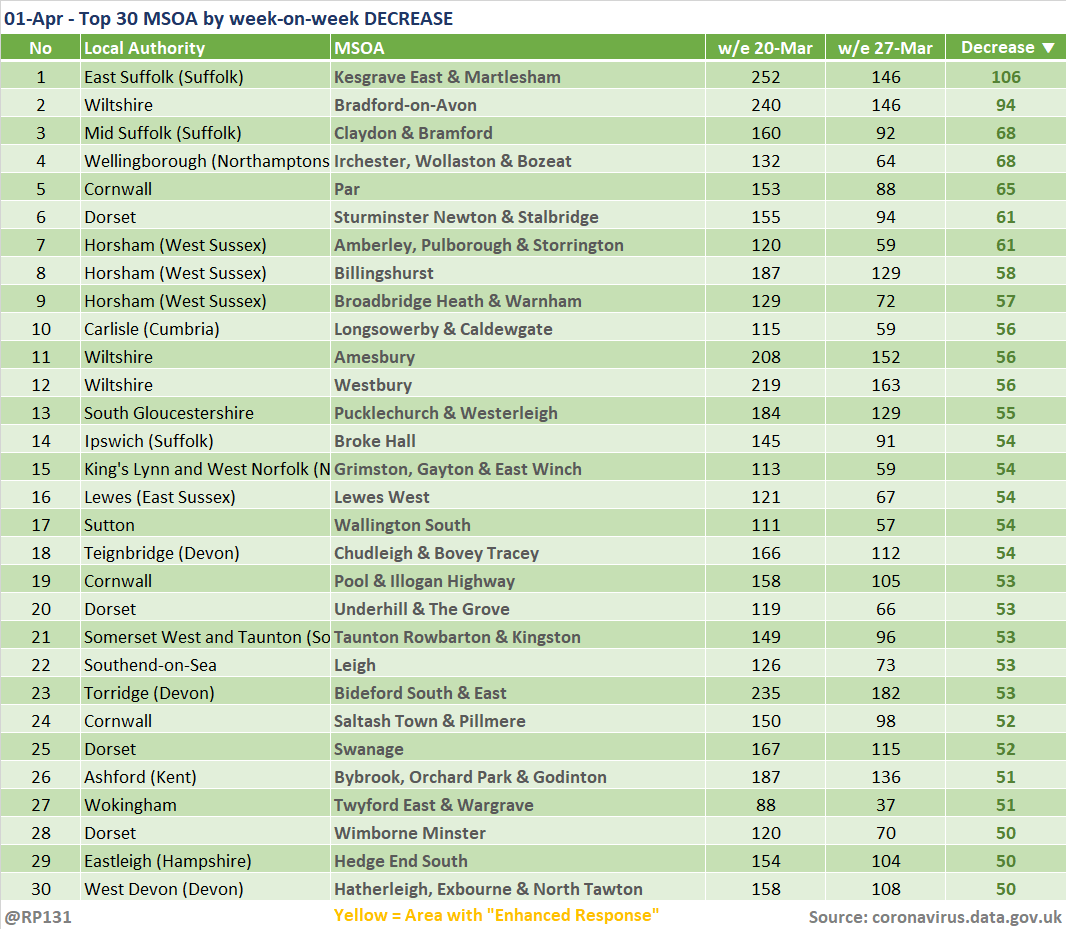 [1/6] Updated (01-Apr) table of top 30 MSOAs (by rate) based on latest numbers in today's report.