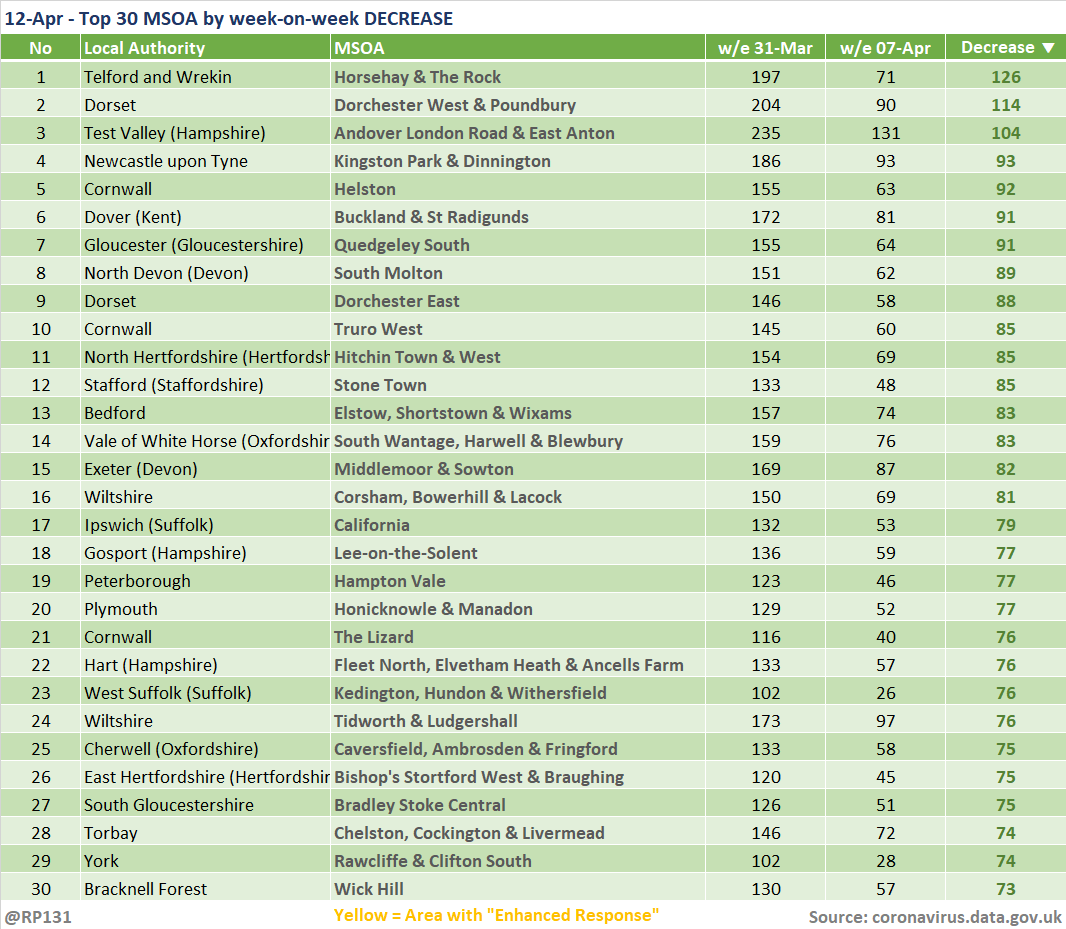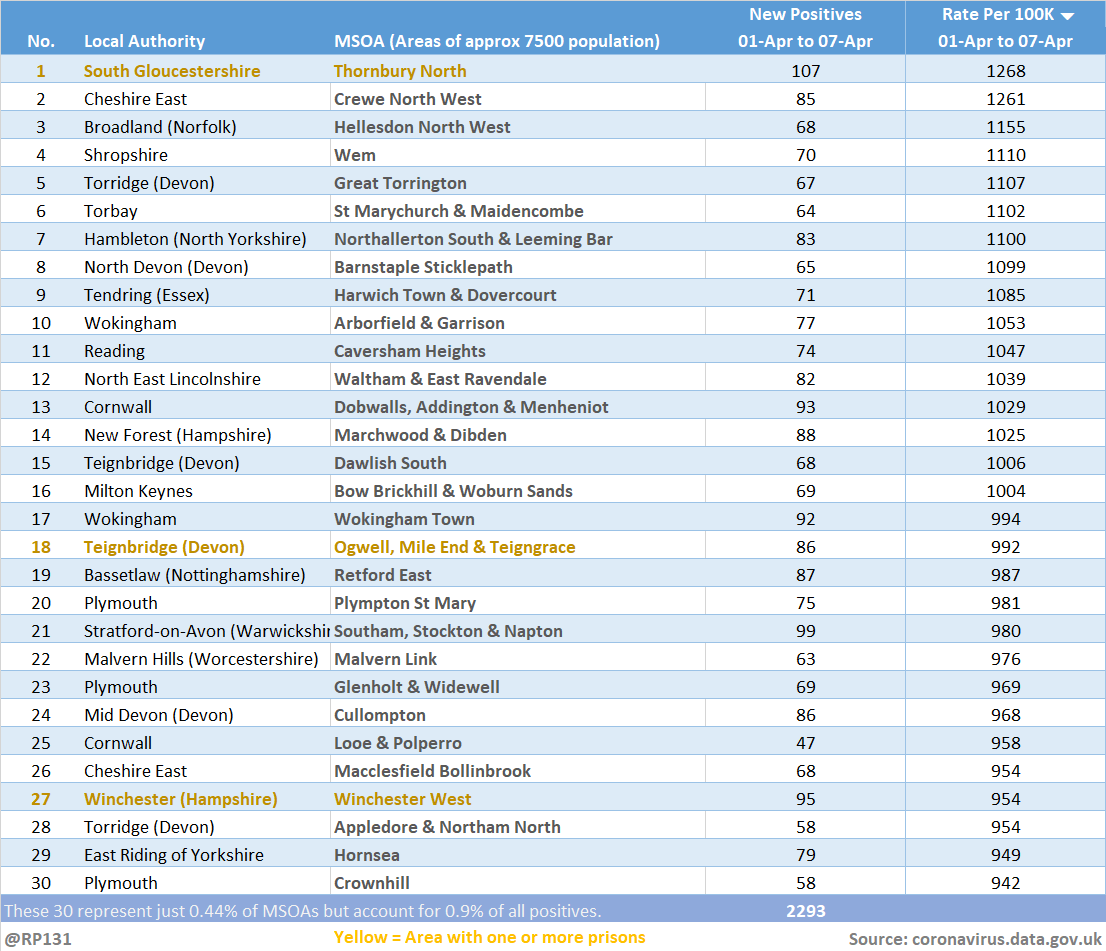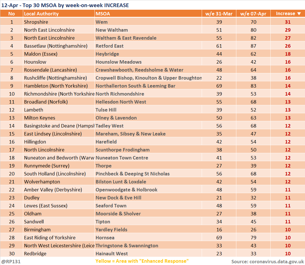 [1/6] Updated (12-Apr) table of top 30 MSOAs (by rate) based on latest numbers in today's report.