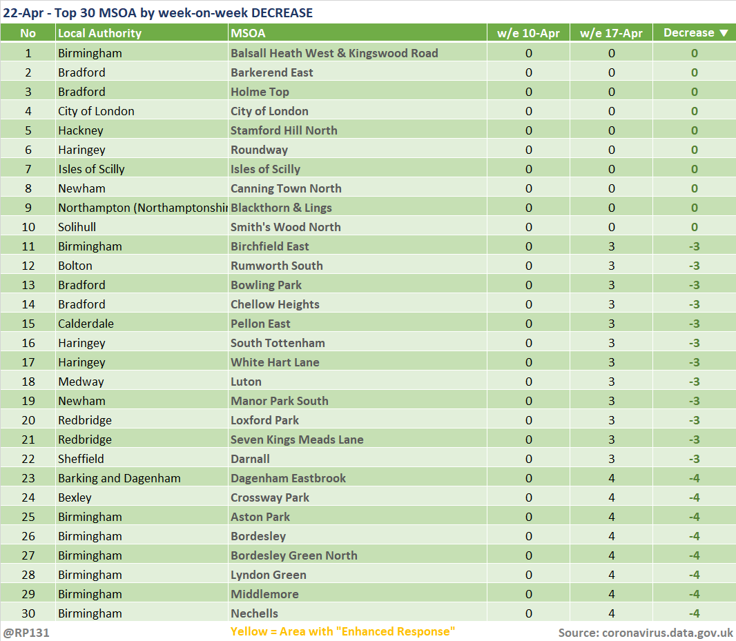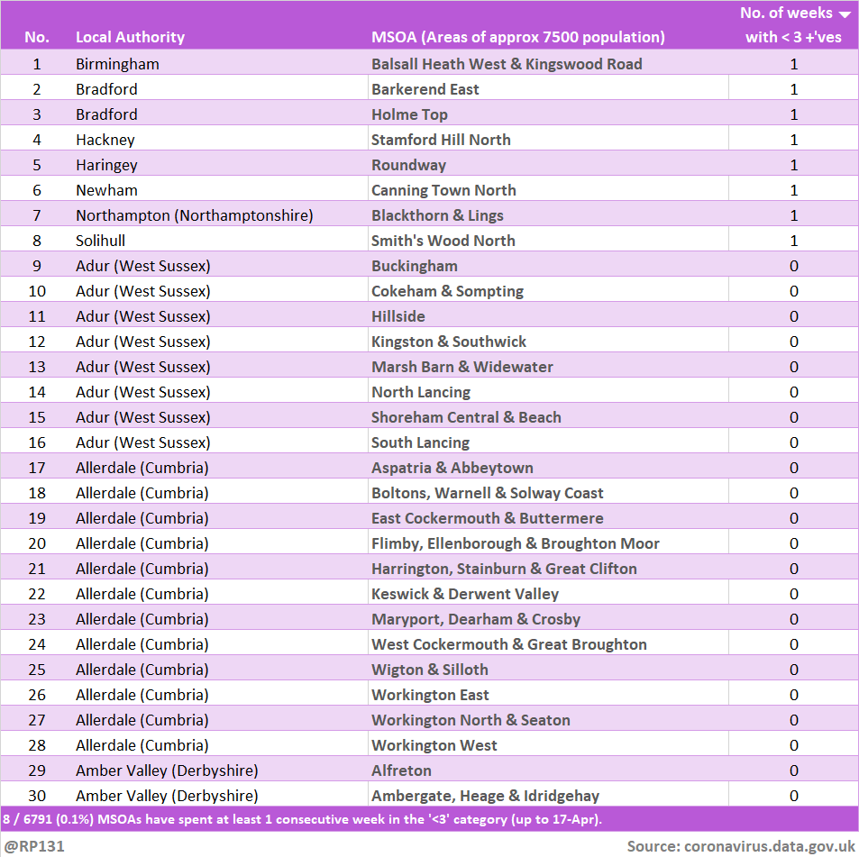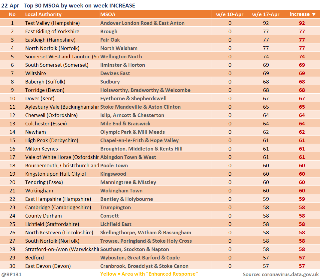 [1/6] Updated (22-Apr) table of top 30 MSOAs (by rate) based on latest numbers in today's report.