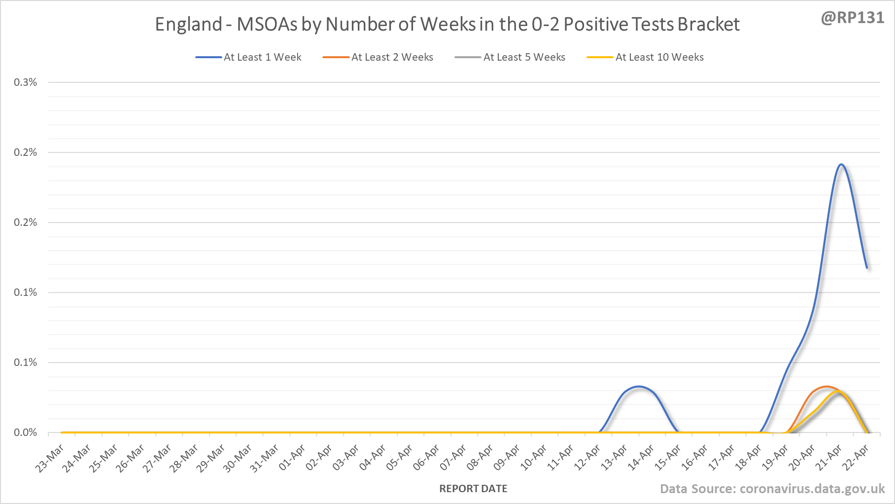 E.g. up to 17-Apr, 0.1% of England MSOAs have gone at least a week with fewer than 3 new positive tests per week.
