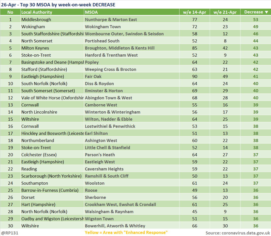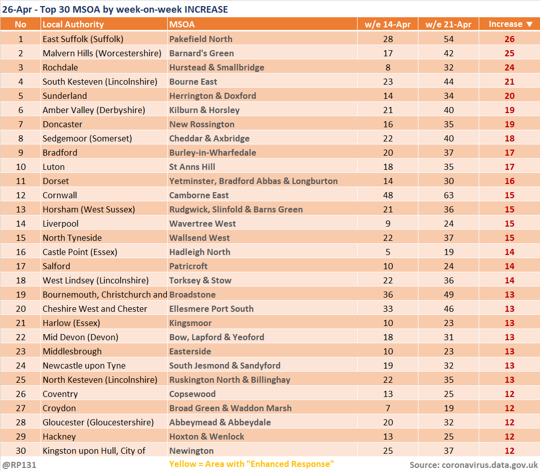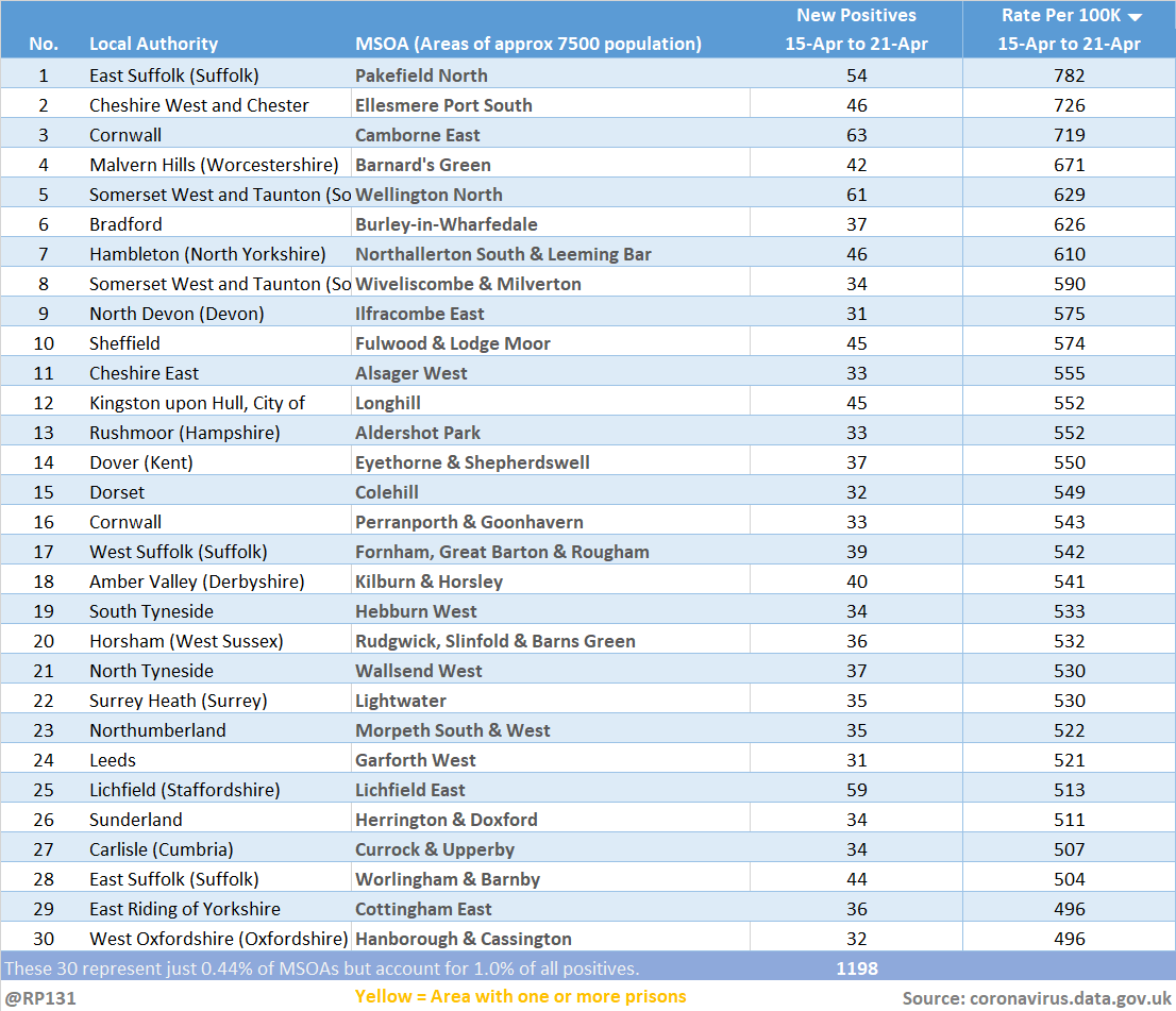 [1/6] Updated (26-Apr) table of top 30 MSOAs (by rate) based on latest numbers in today's report.