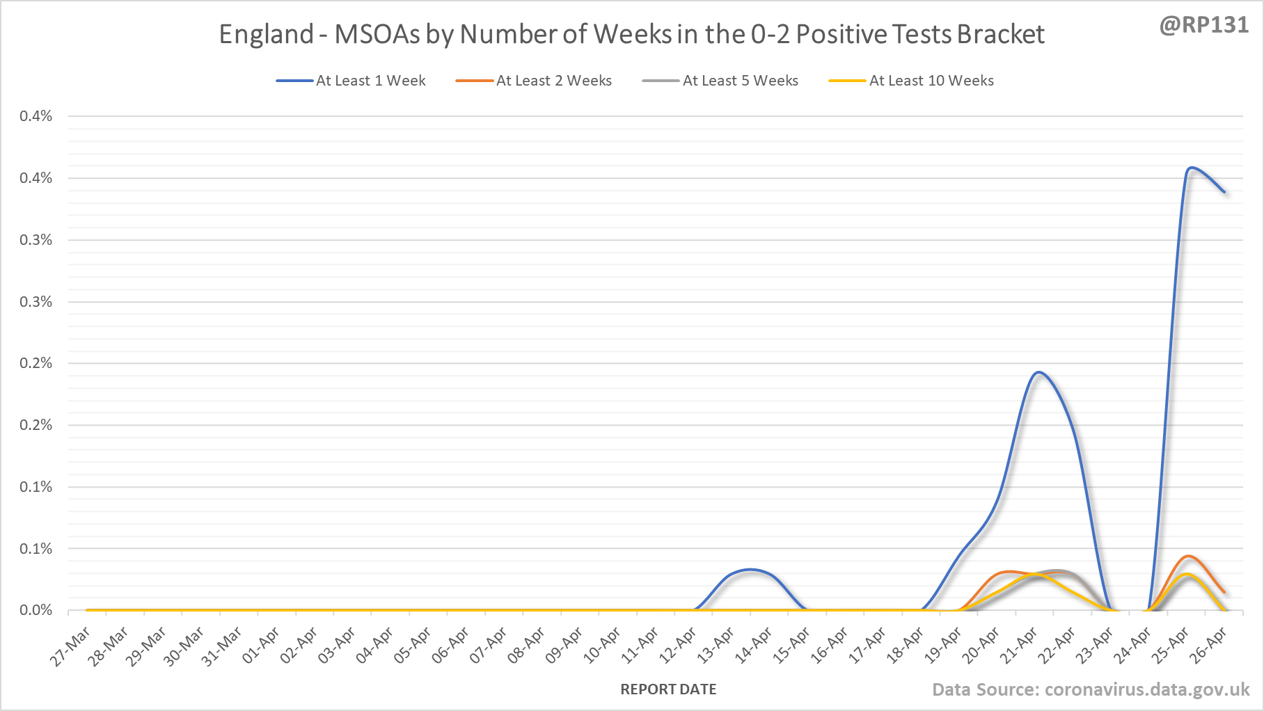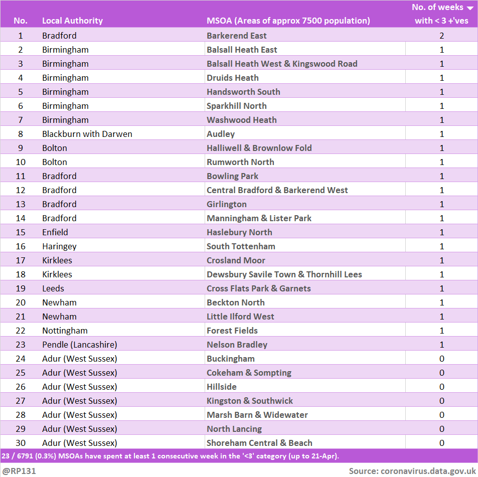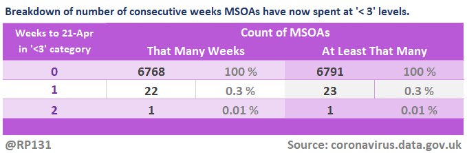 E.g. up to 21-Apr, 0.3% of England MSOAs have gone at least a week with fewer than 3 new positive tests per week.