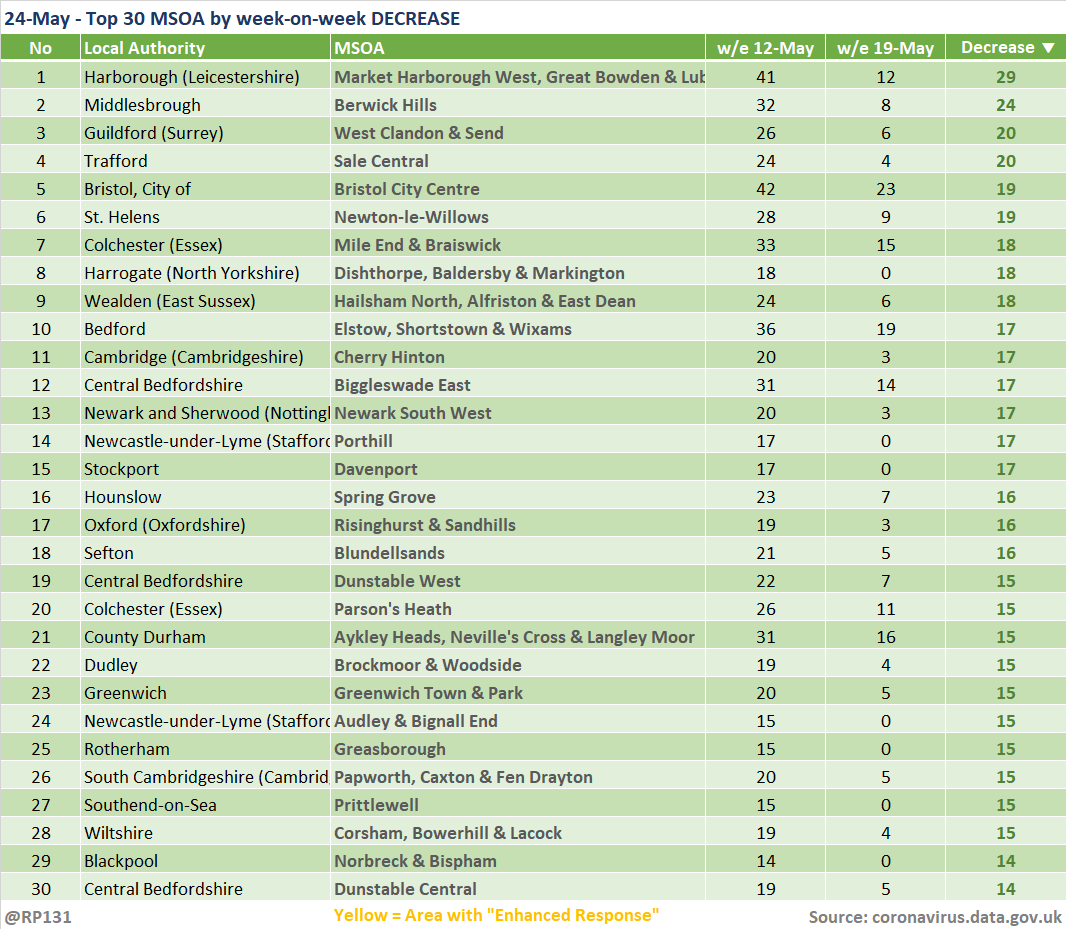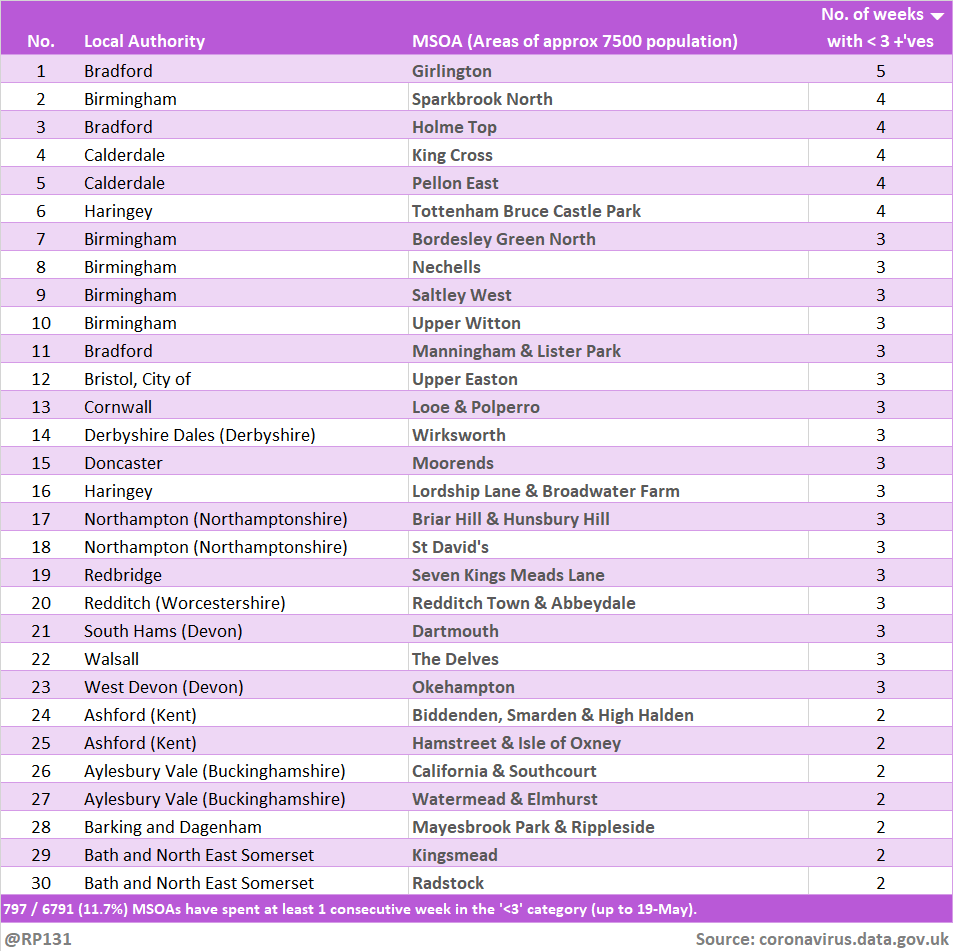 [1/6] Updated (24-May) table of top 30 MSOAs (by rate) based on latest numbers in today's report.