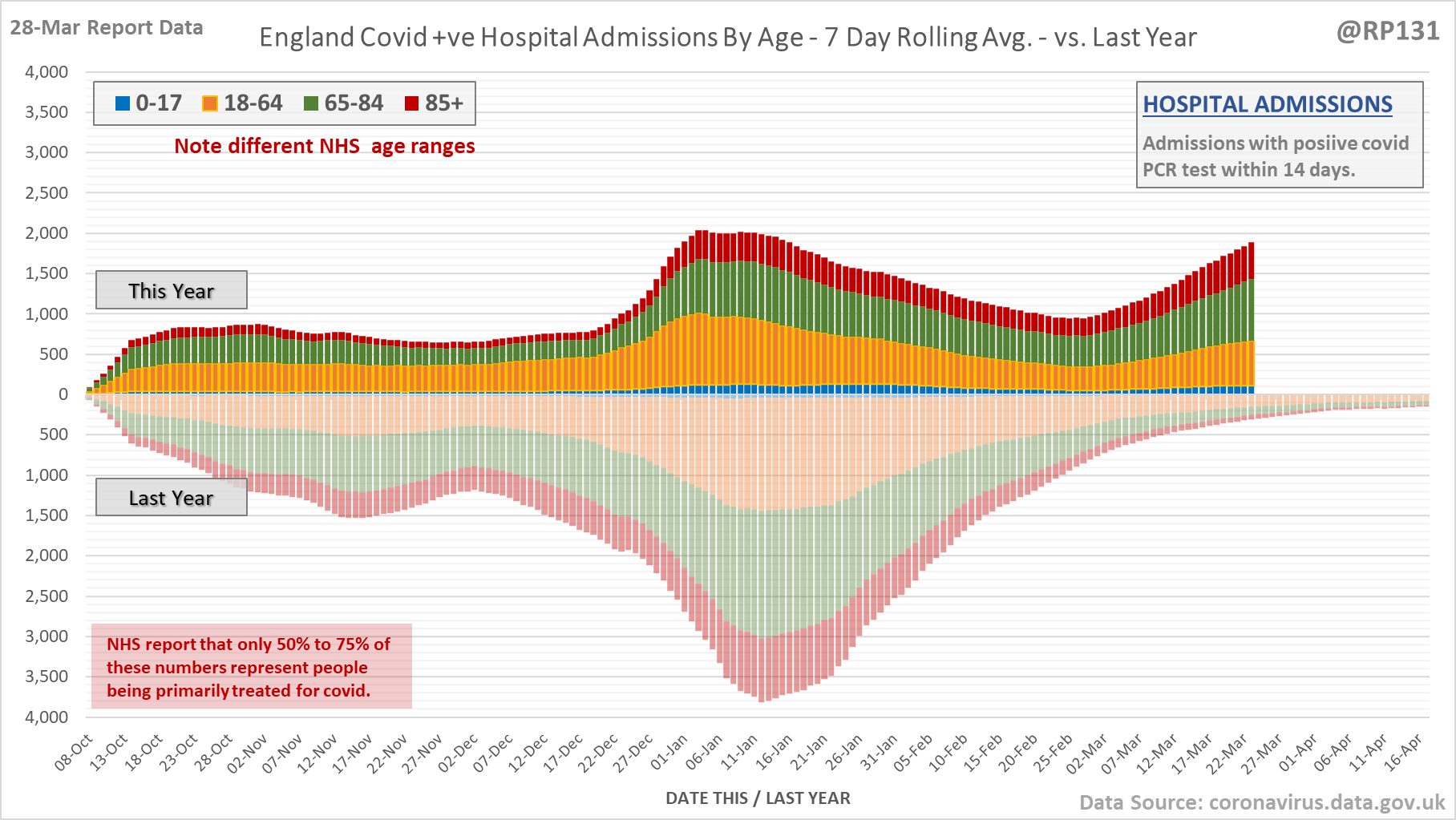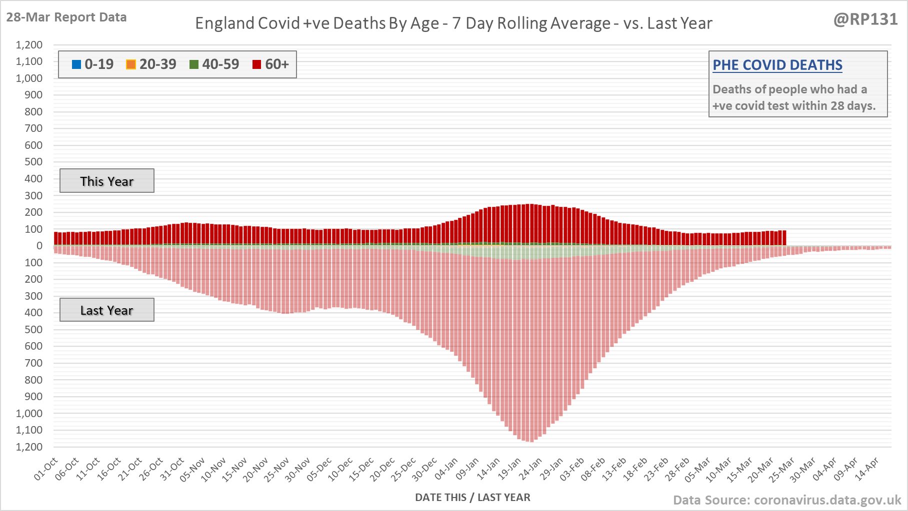 [1/1] Updated mirror charts based on latest (28-Mar) data. These show latest Positives, Deaths, Admission and Beds in comparison to same time last year. The general trend is that positives are higher but everything else is lower.