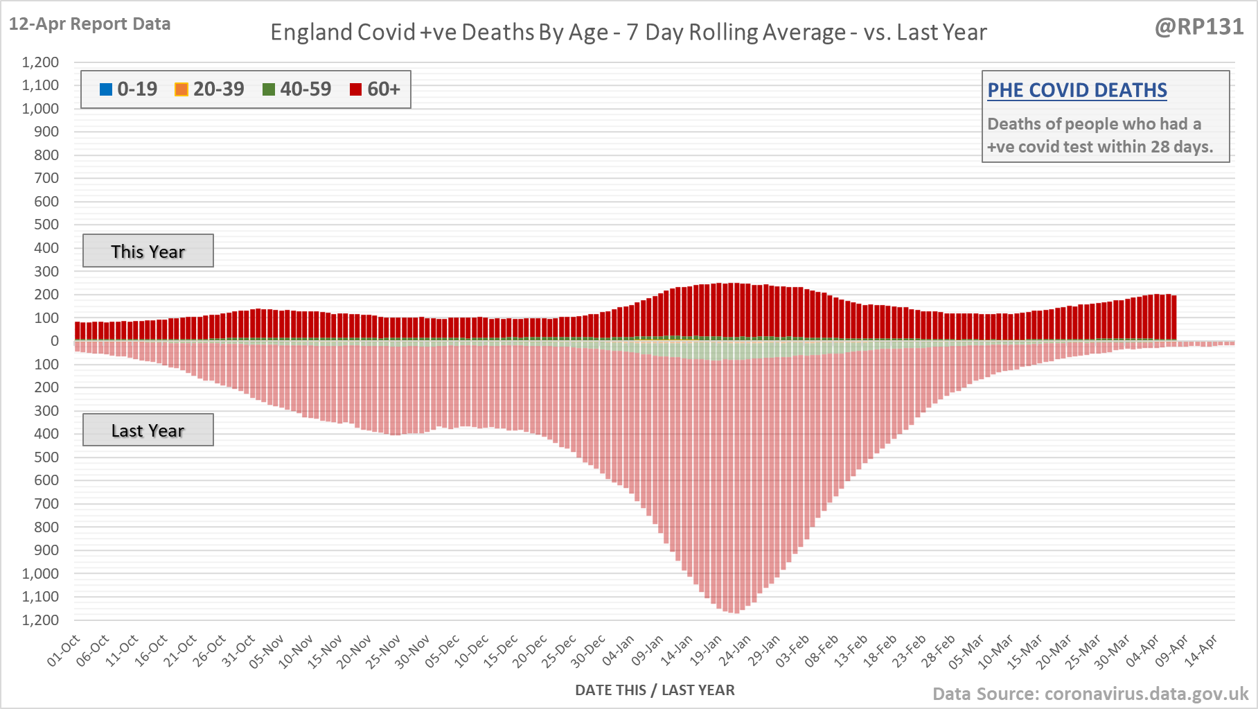 [1/1] Updated mirror charts based on latest (12-Apr) data. These show latest Positives, Deaths, Admission and Beds in comparison to same time last year. The general trend is that positives are higher but everything else is lower.