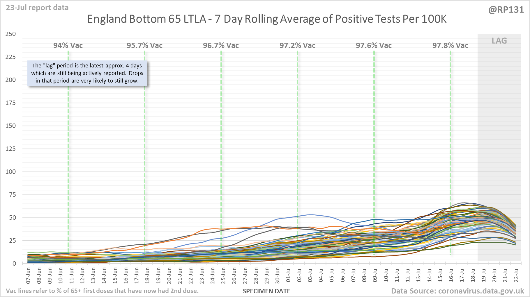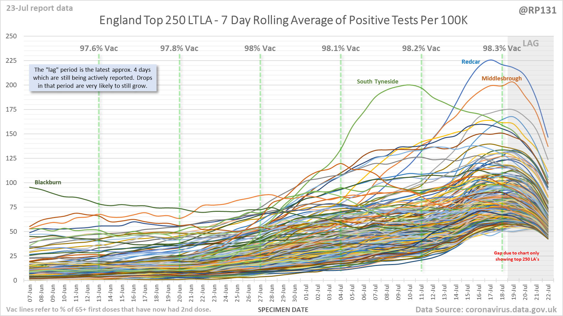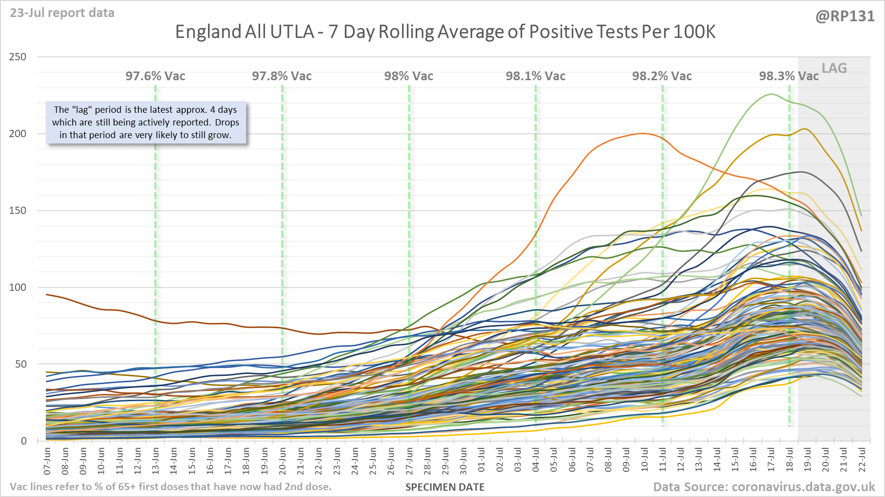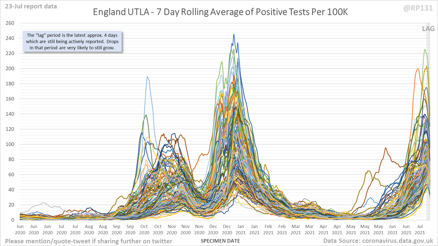 [1/13] #covid19uk - Nations level positive tests thread. Starting with "spaghetti" chart based on today's 23-Jul data. This shows positives tests by specimen date for the top 250 (of 315 total) lower tier local authorities in England: