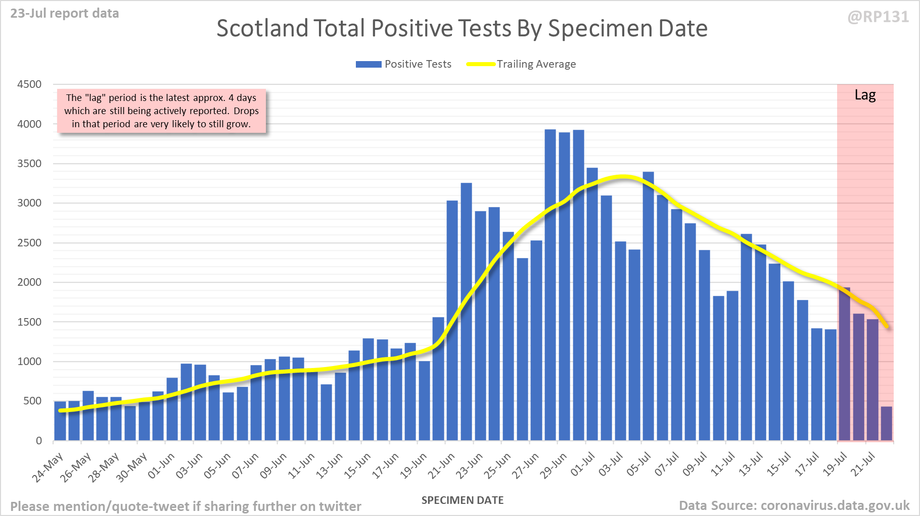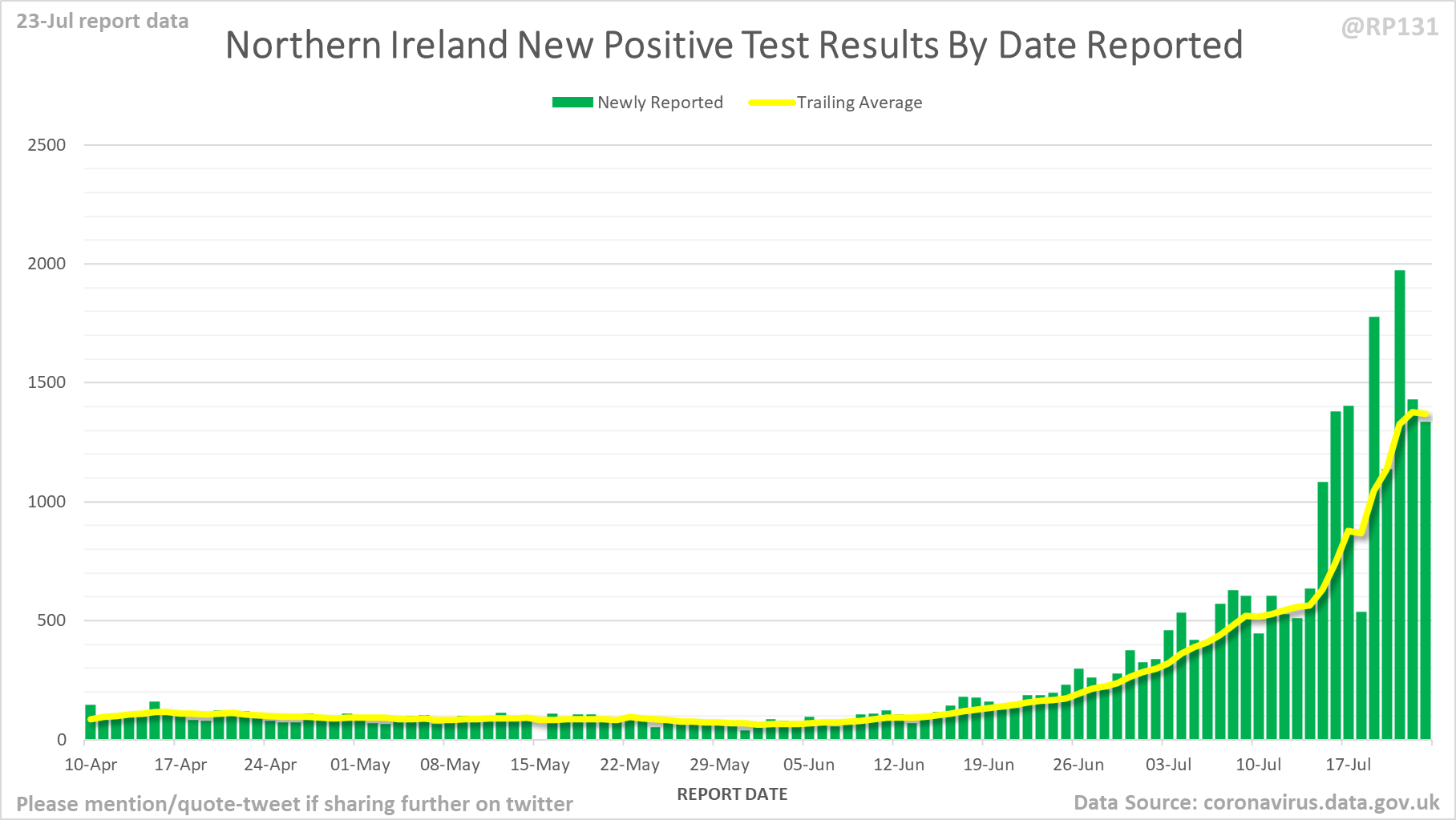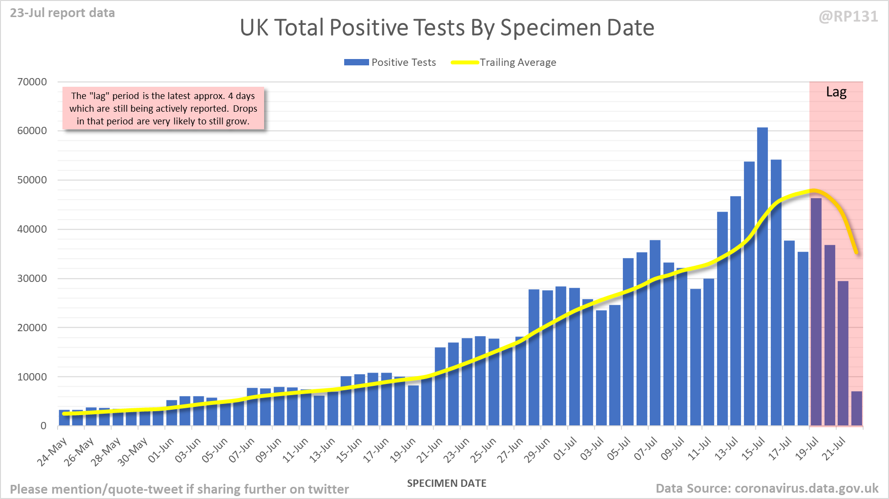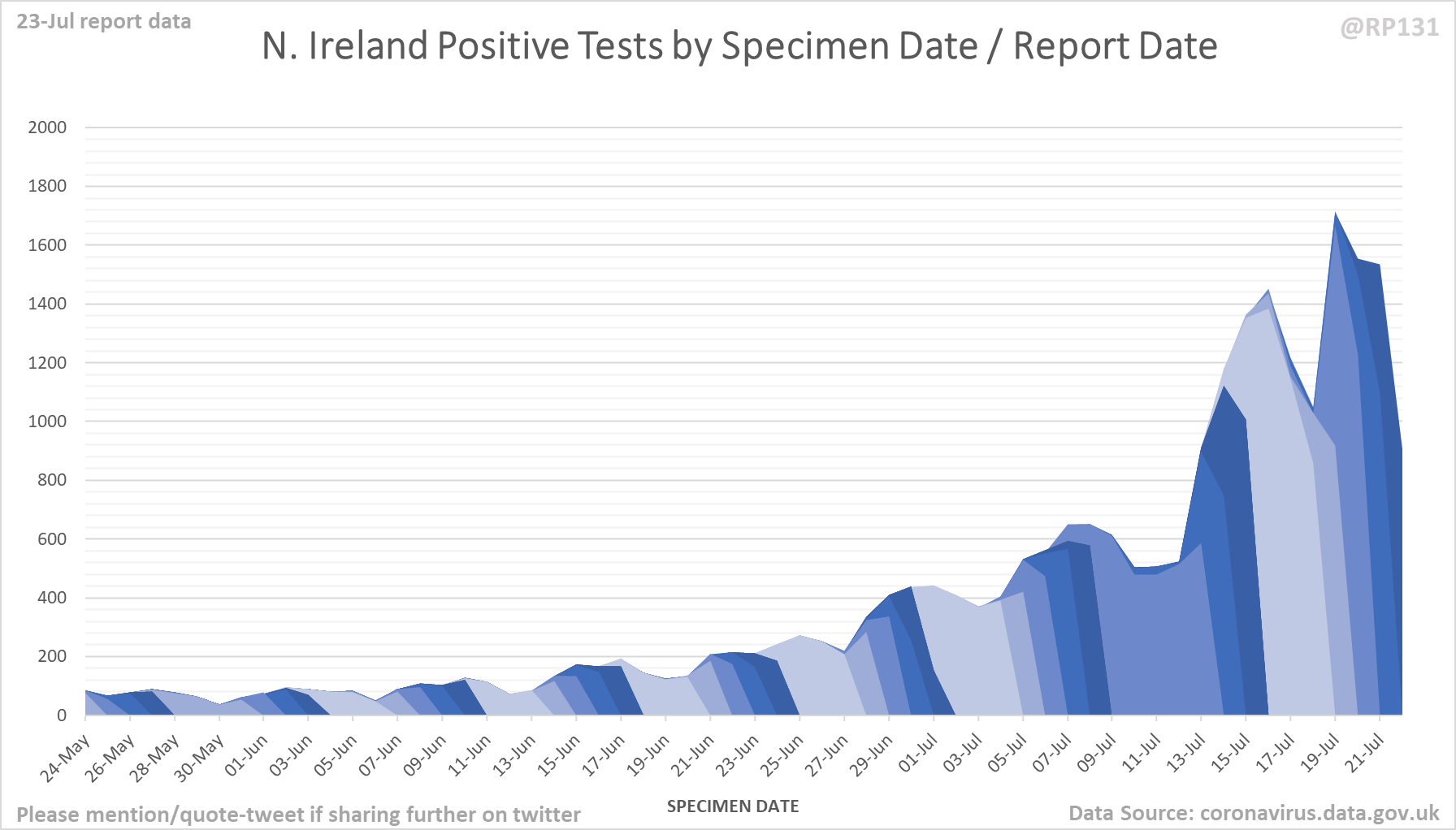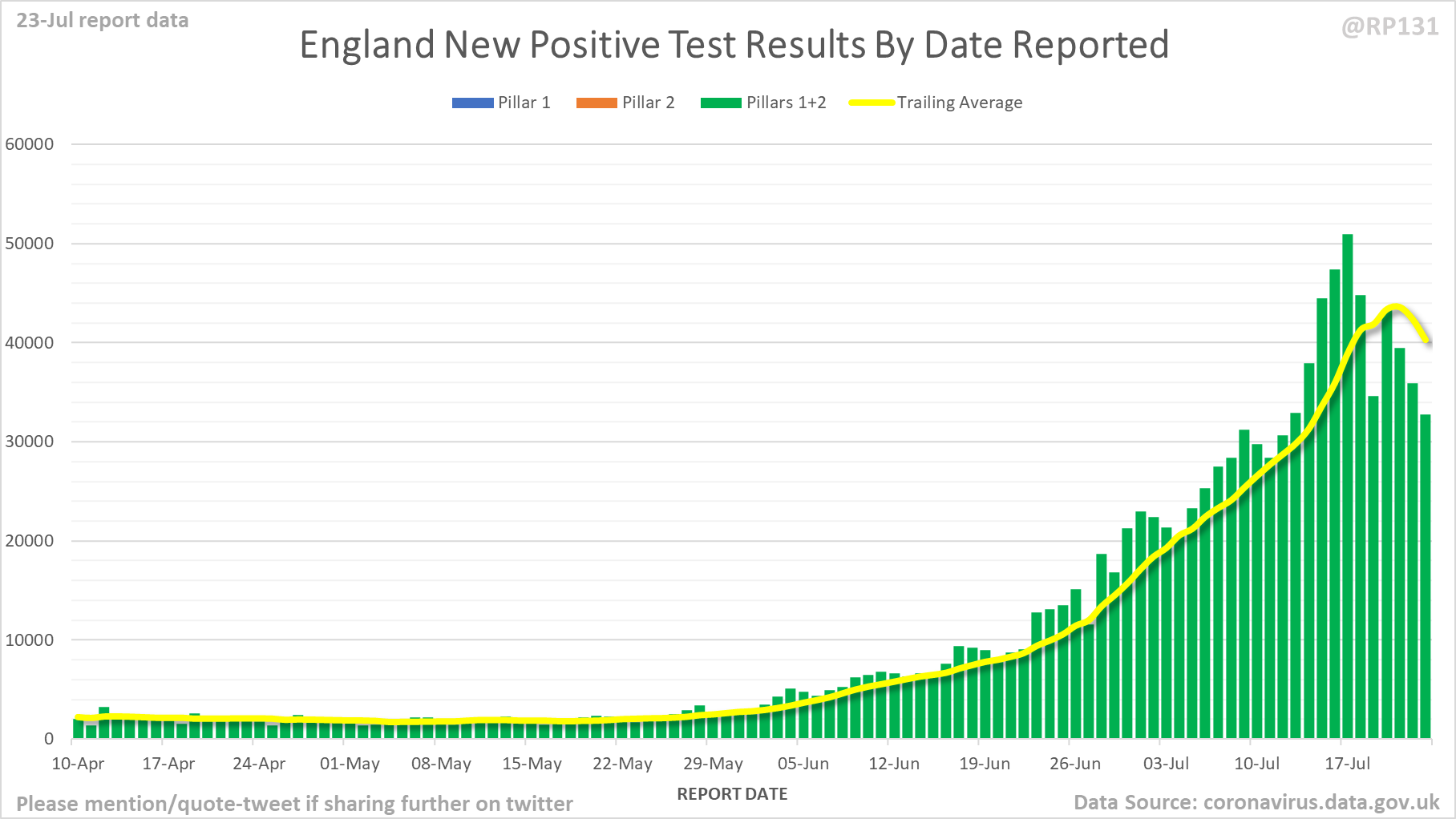 [1/13] #covid19uk - Nations level positive tests thread. Starting with "spaghetti" chart based on today's 23-Jul data. This shows positives tests by specimen date for the top 250 (of 315 total) lower tier local authorities in England: