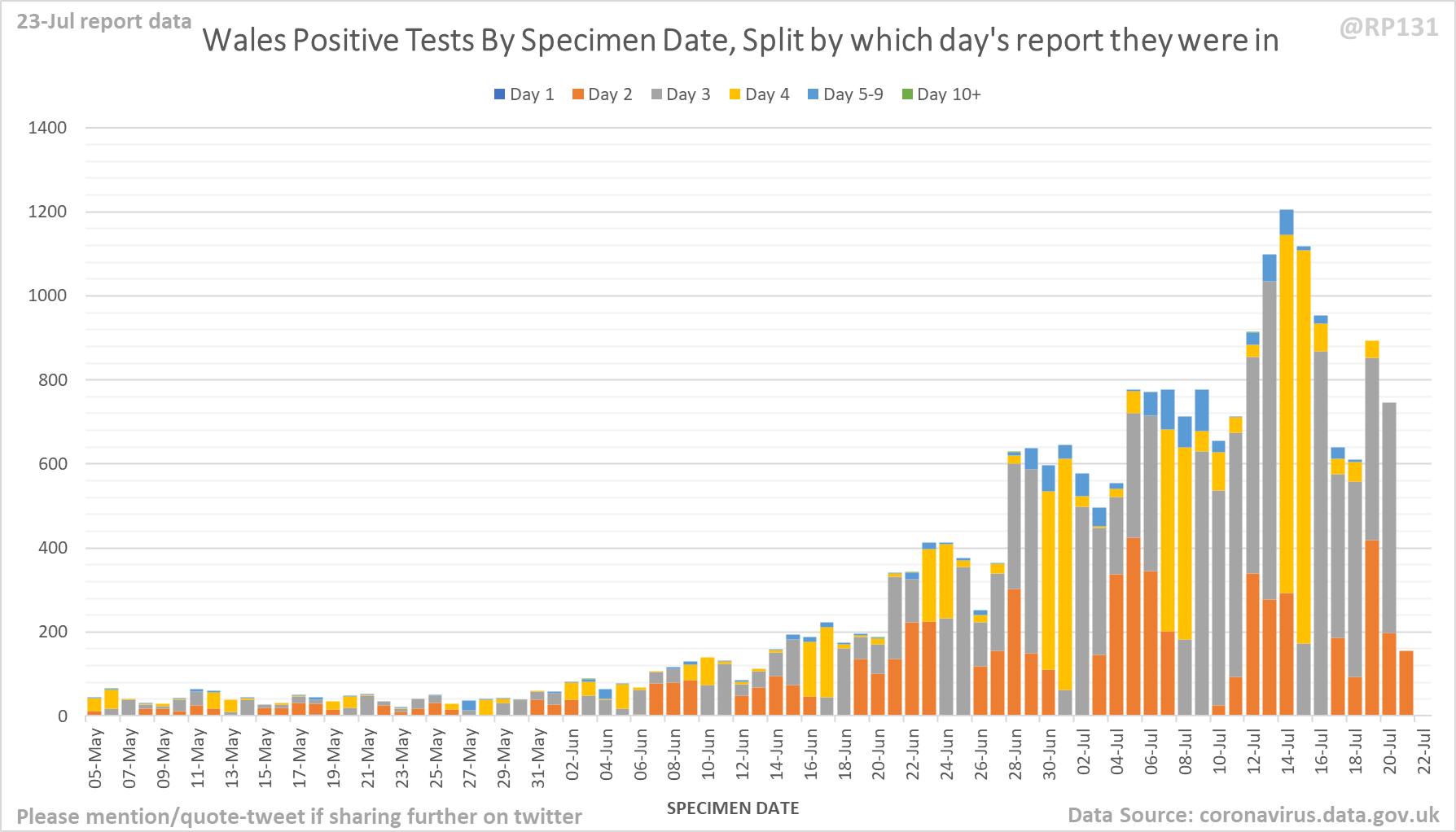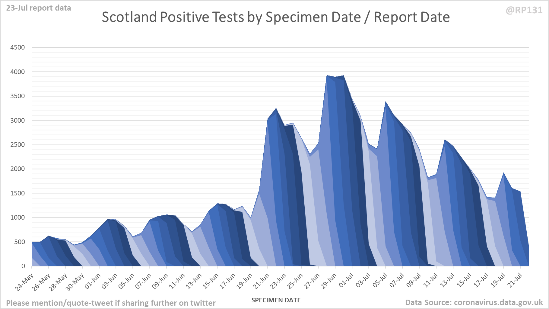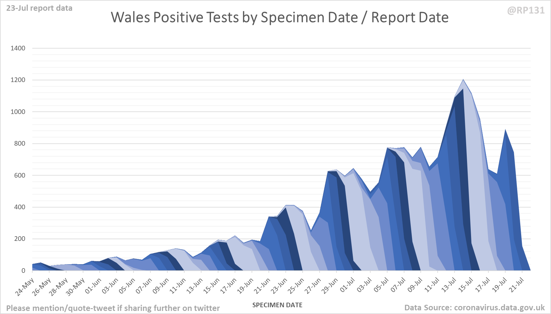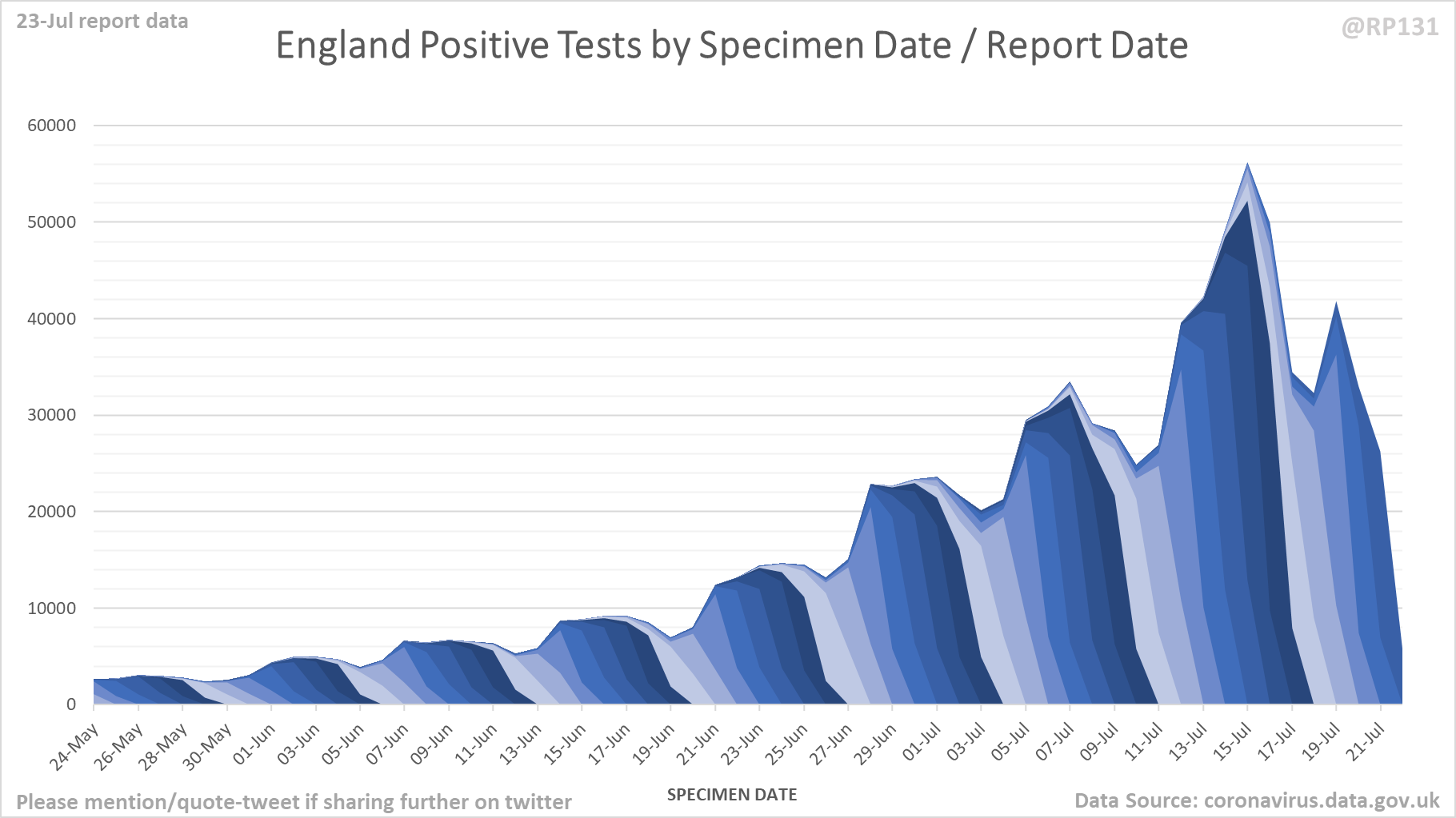 [4/13] Chart for monitoring lag in reporting of England positive test results. Each column represents a given day's report and shows which specimen dates it covers.