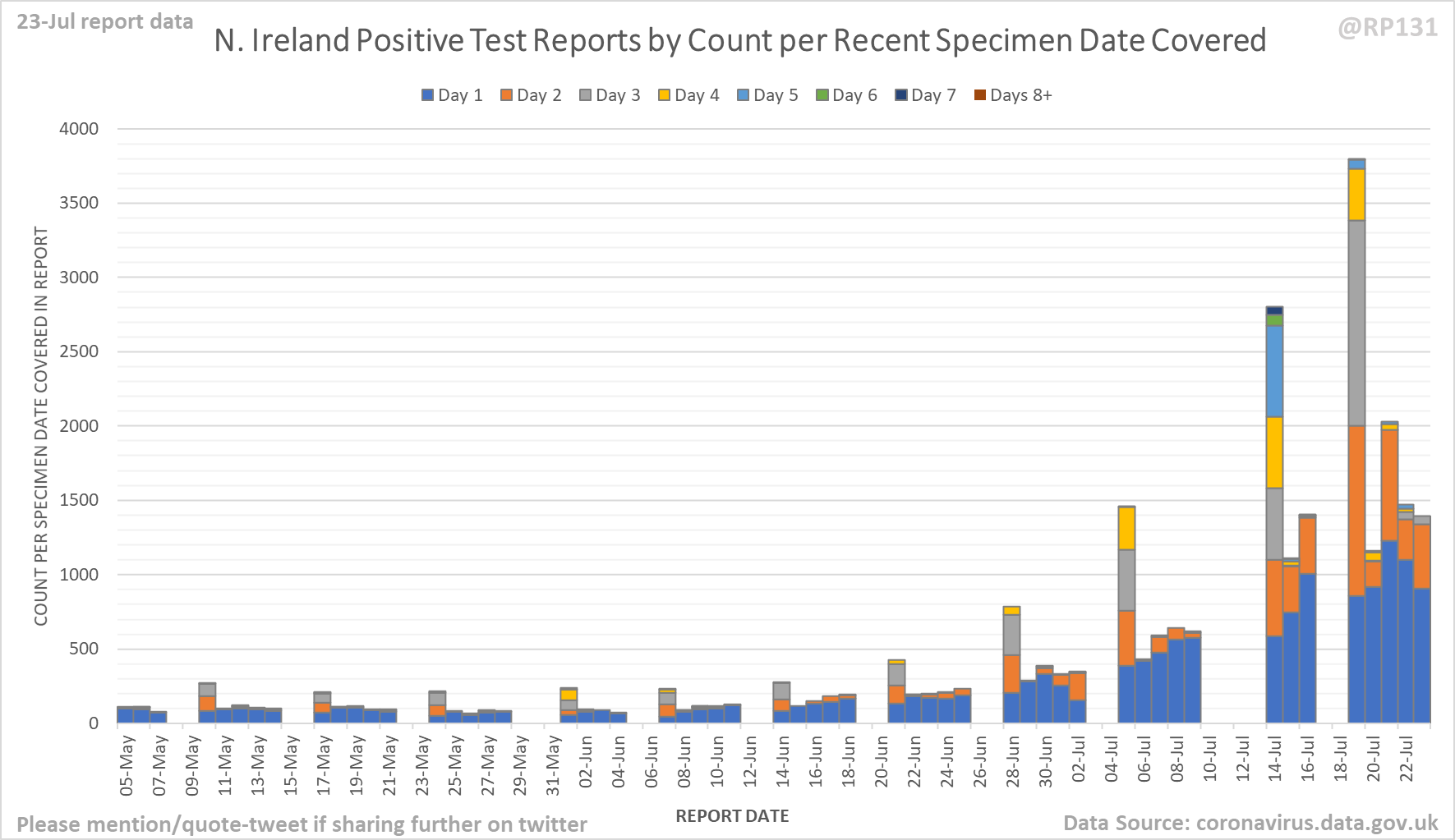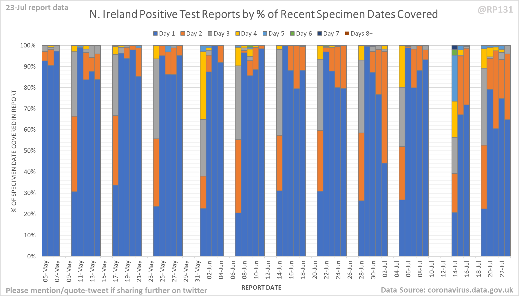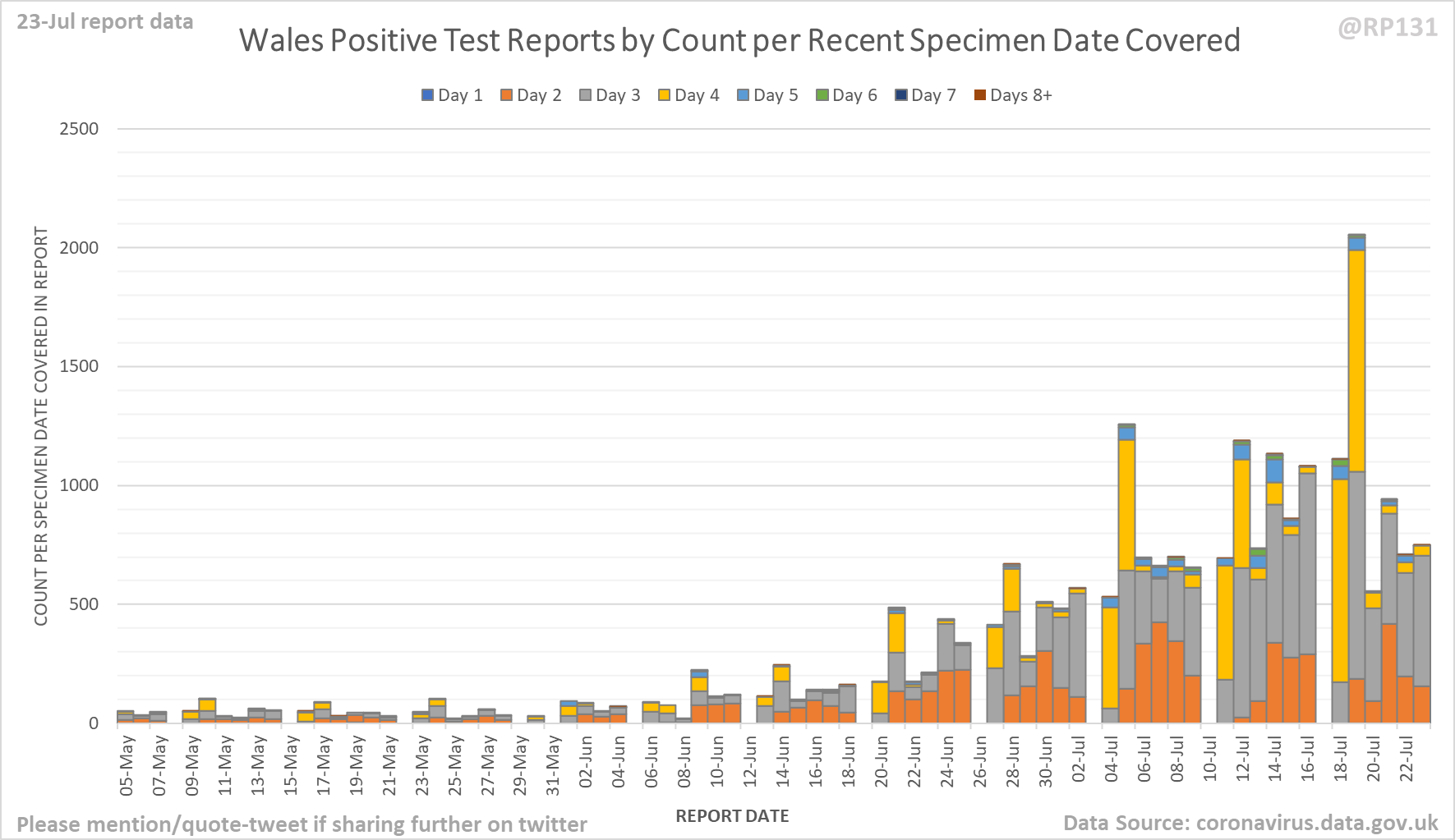 [4/13] Chart for monitoring lag in reporting of England positive test results. Each column represents a given day's report and shows which specimen dates it covers.