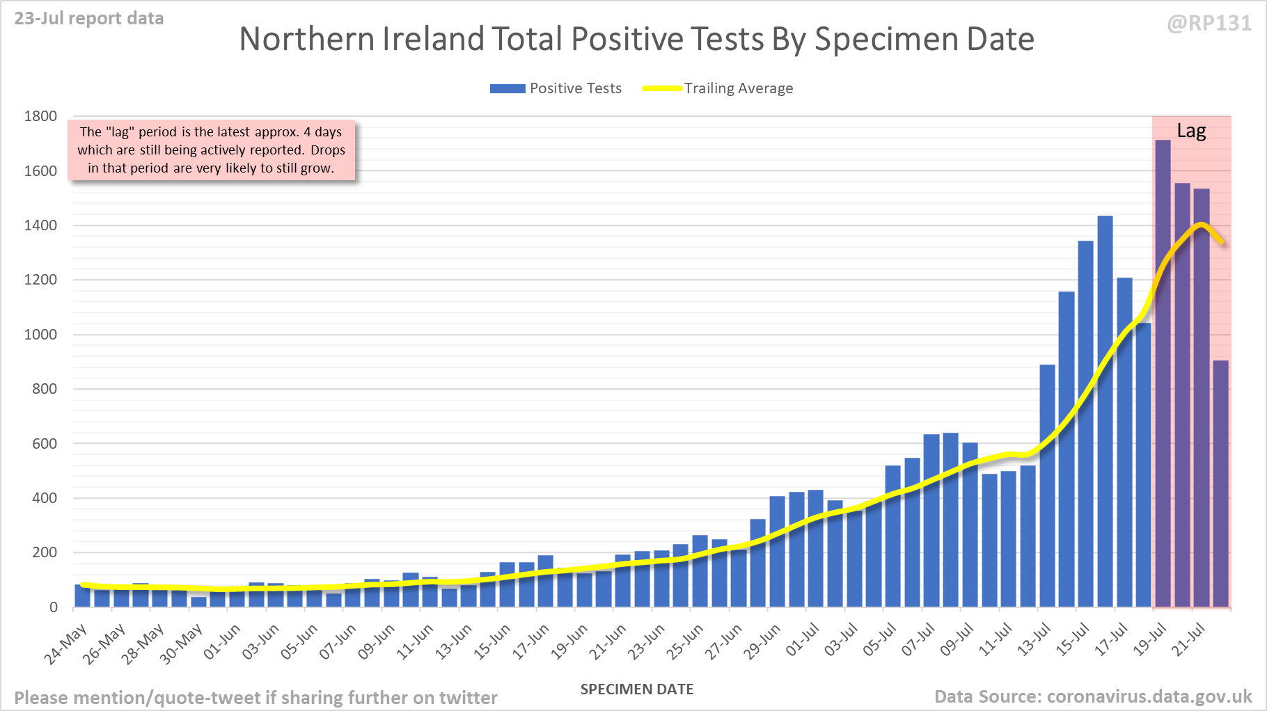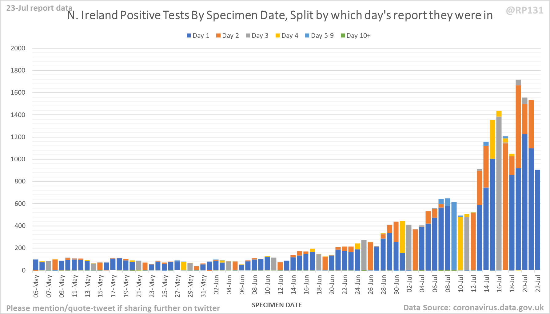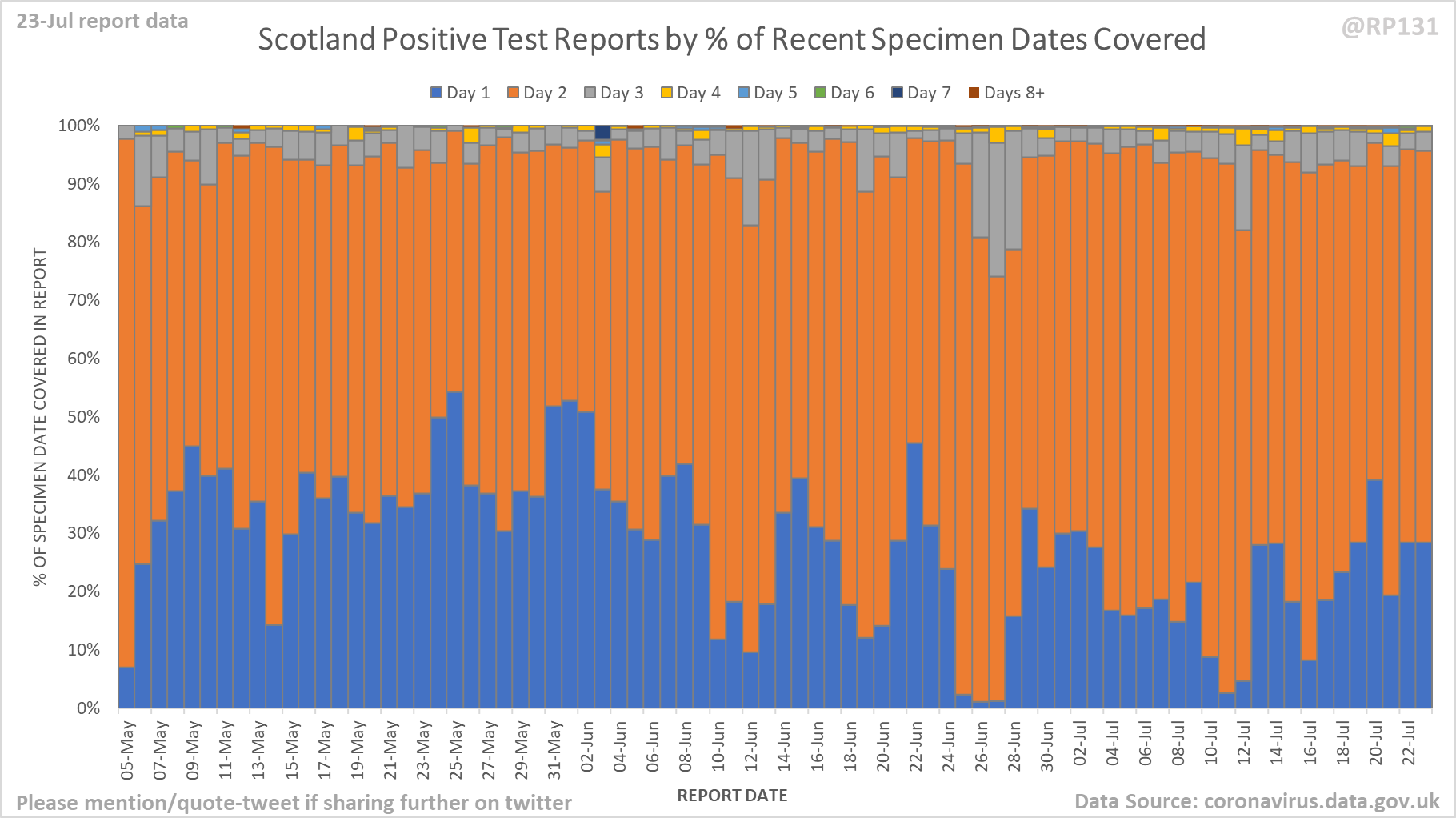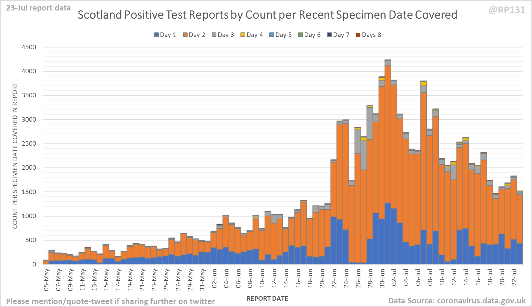[4/13] Chart for monitoring lag in reporting of England positive test results. Each column represents a given day's report and shows which specimen dates it covers.