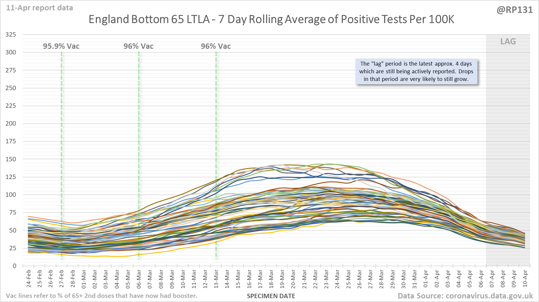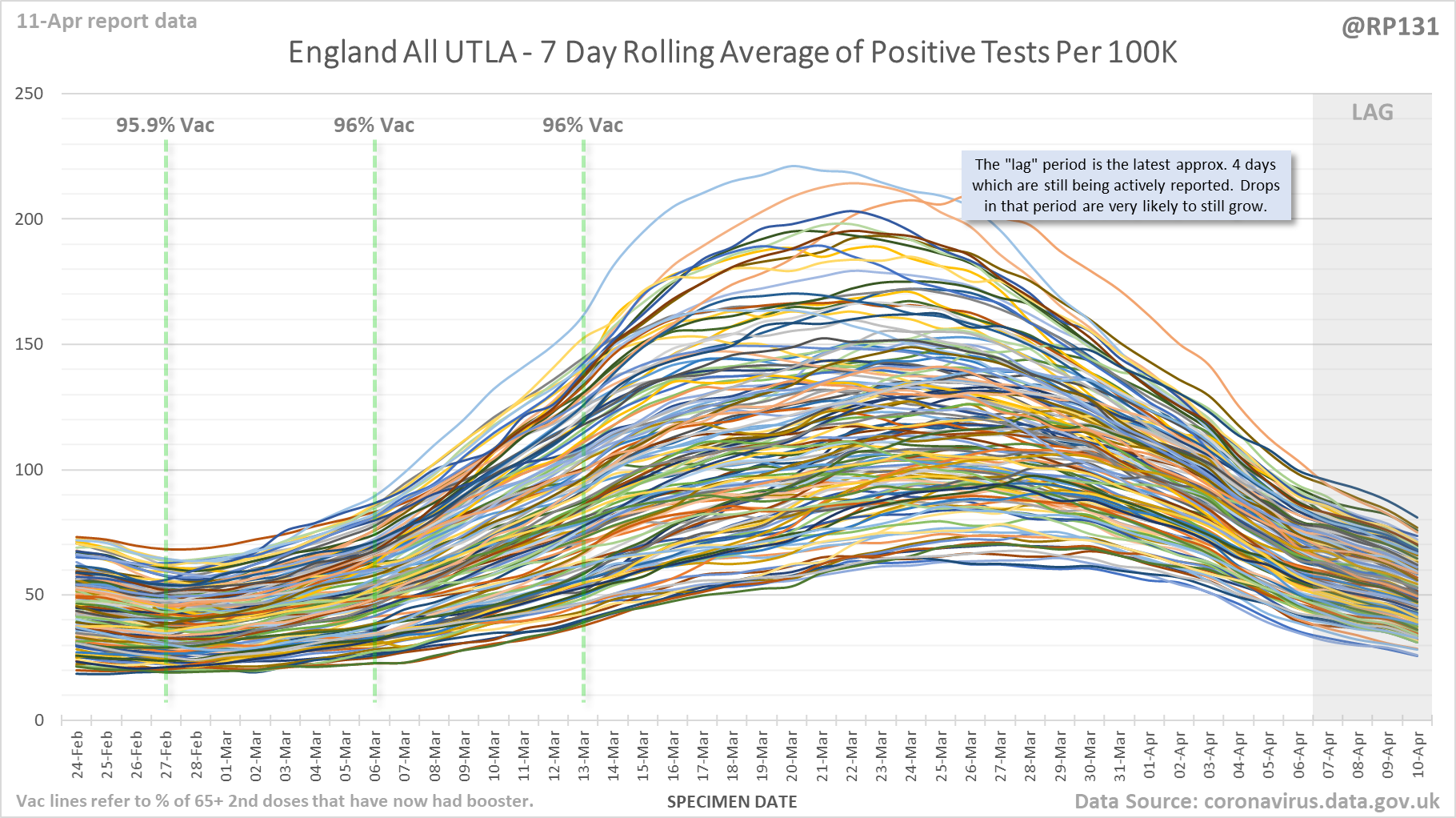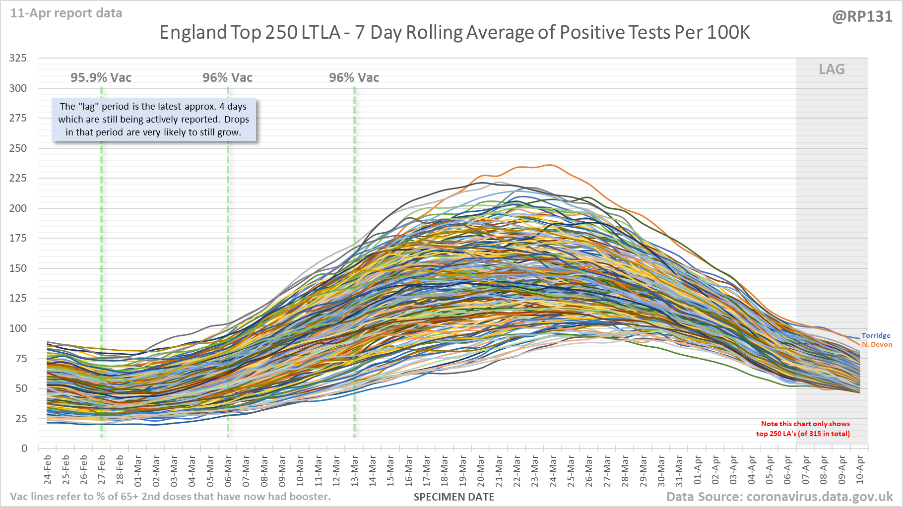 [1/9] England Local Authority "spaghetti" chart (11-Apr) which shows rolling average of positives by specimen date for the top 250 (of 315 total) lower tier local authorities in England.