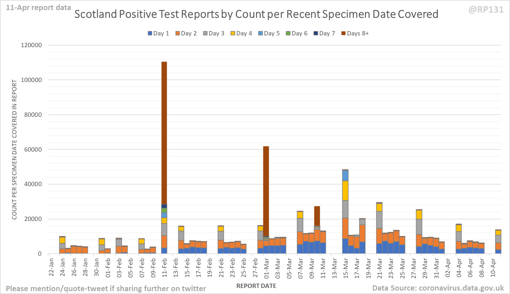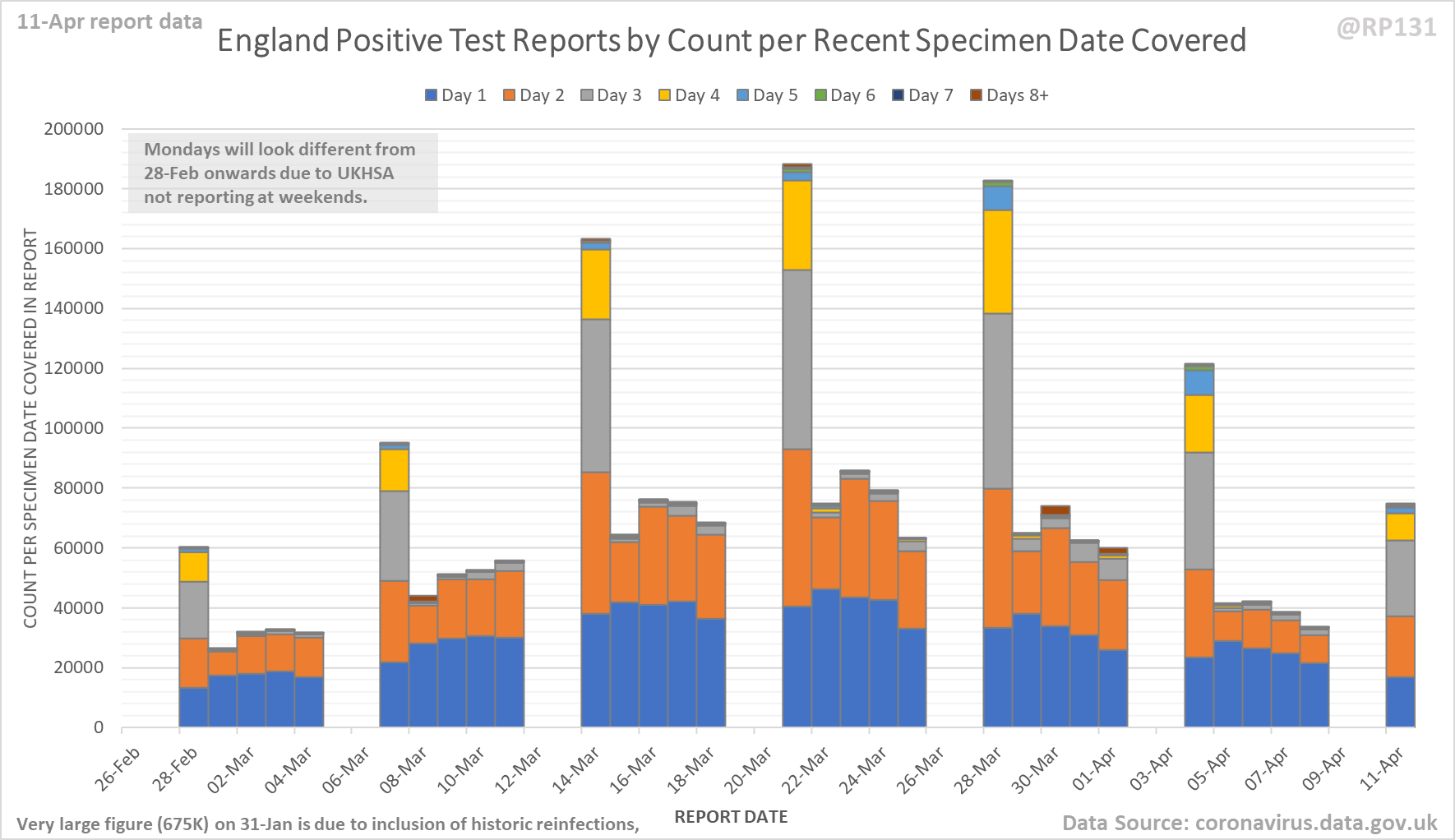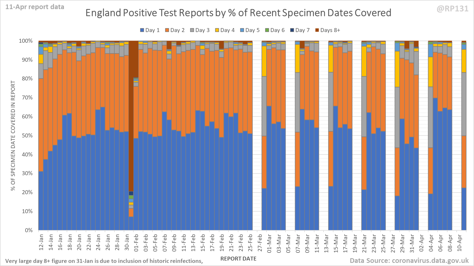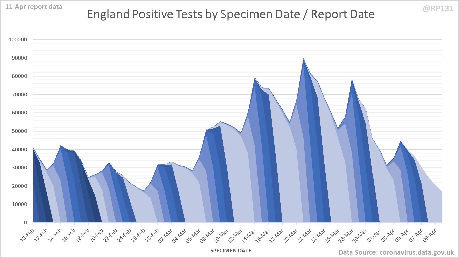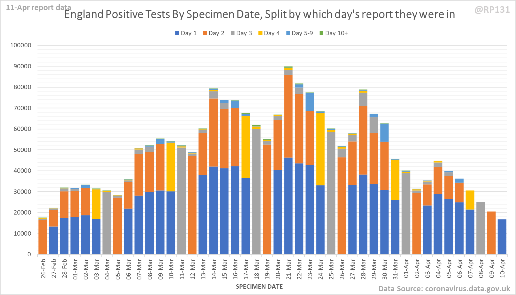 [4/9] Chart for monitoring lag in reporting of England positive test results. Each column represents a given day's report and shows which specimen dates it covers.