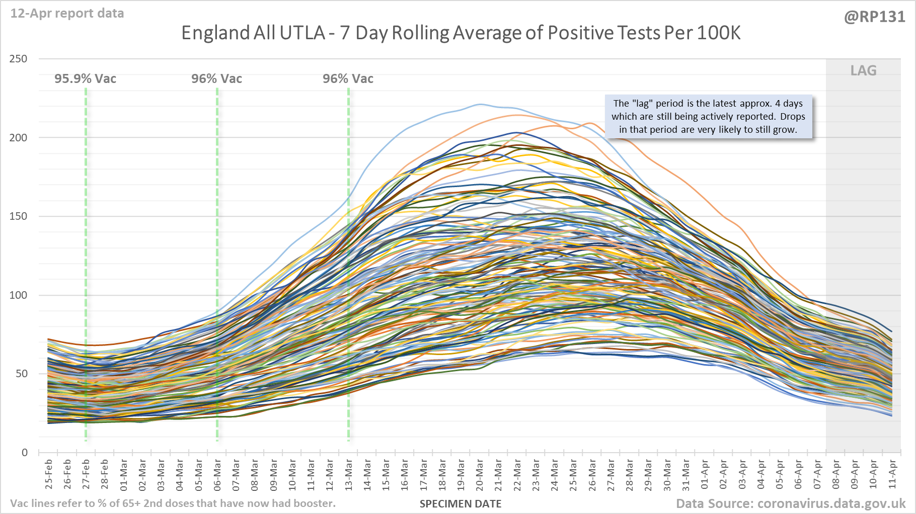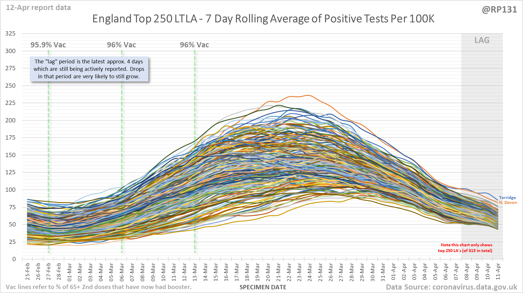 [1/9] England Local Authority "spaghetti" chart (12-Apr) which shows rolling average of positives by specimen date for the top 250 (of 315 total) lower tier local authorities in England.