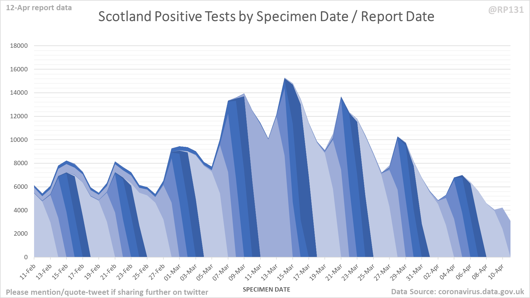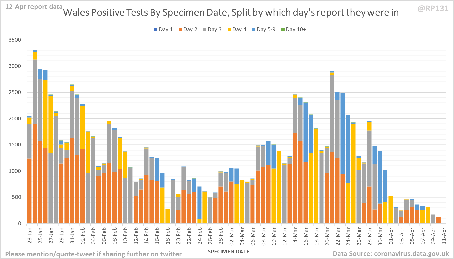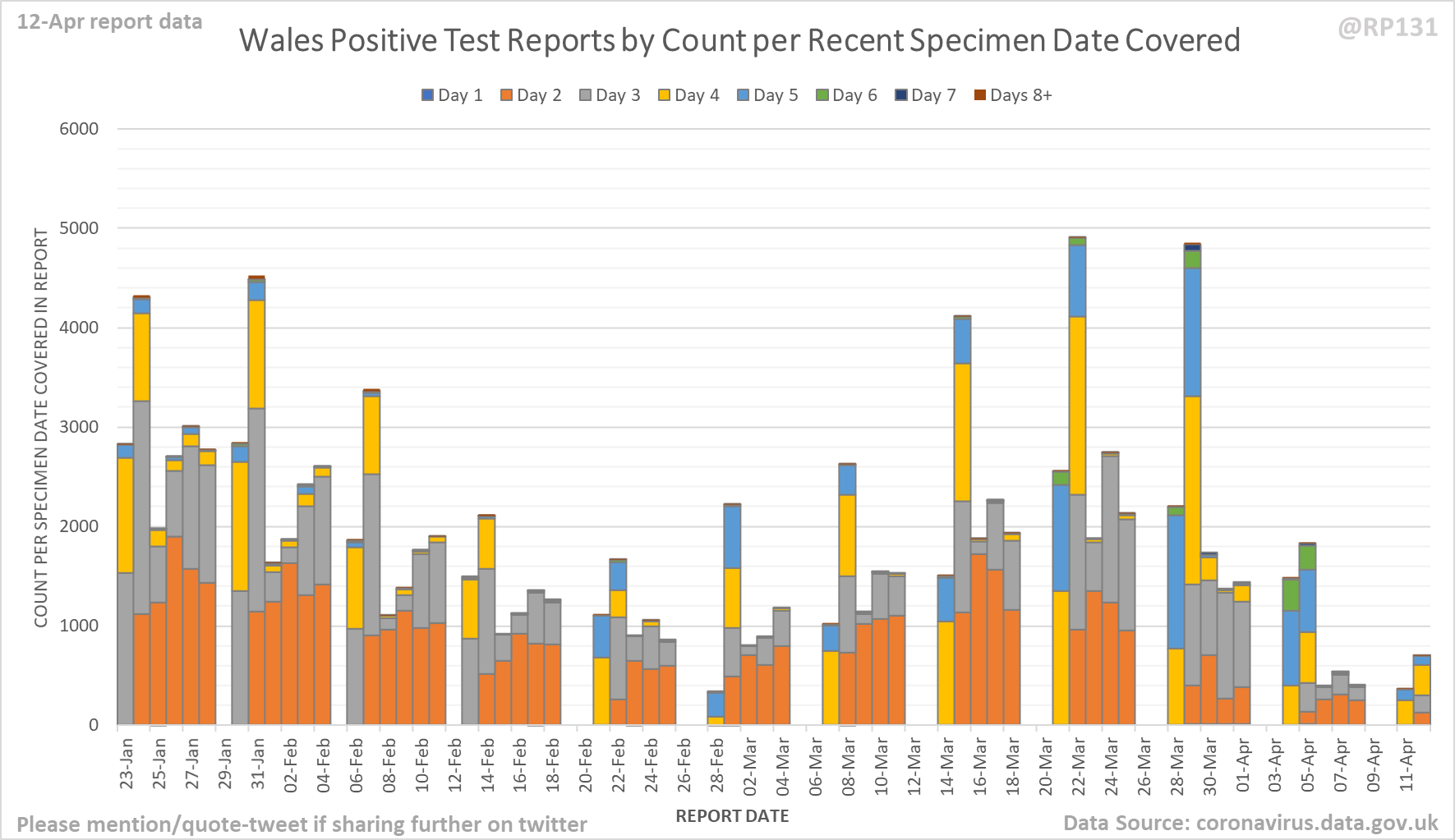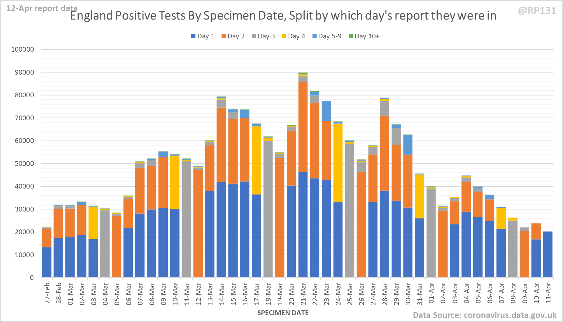 [4/9] Chart for monitoring lag in reporting of England positive test results. Each column represents a given day's report and shows which specimen dates it covers.