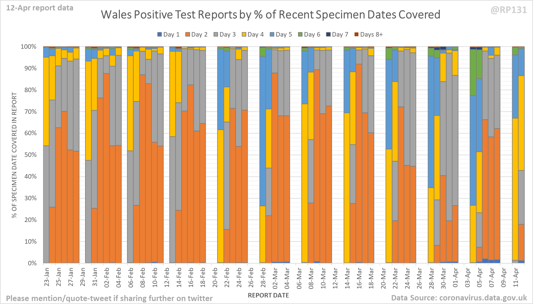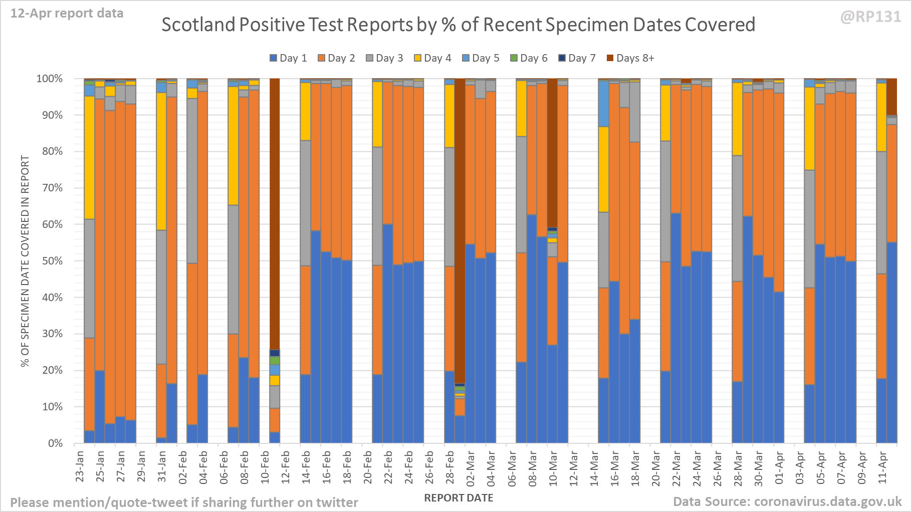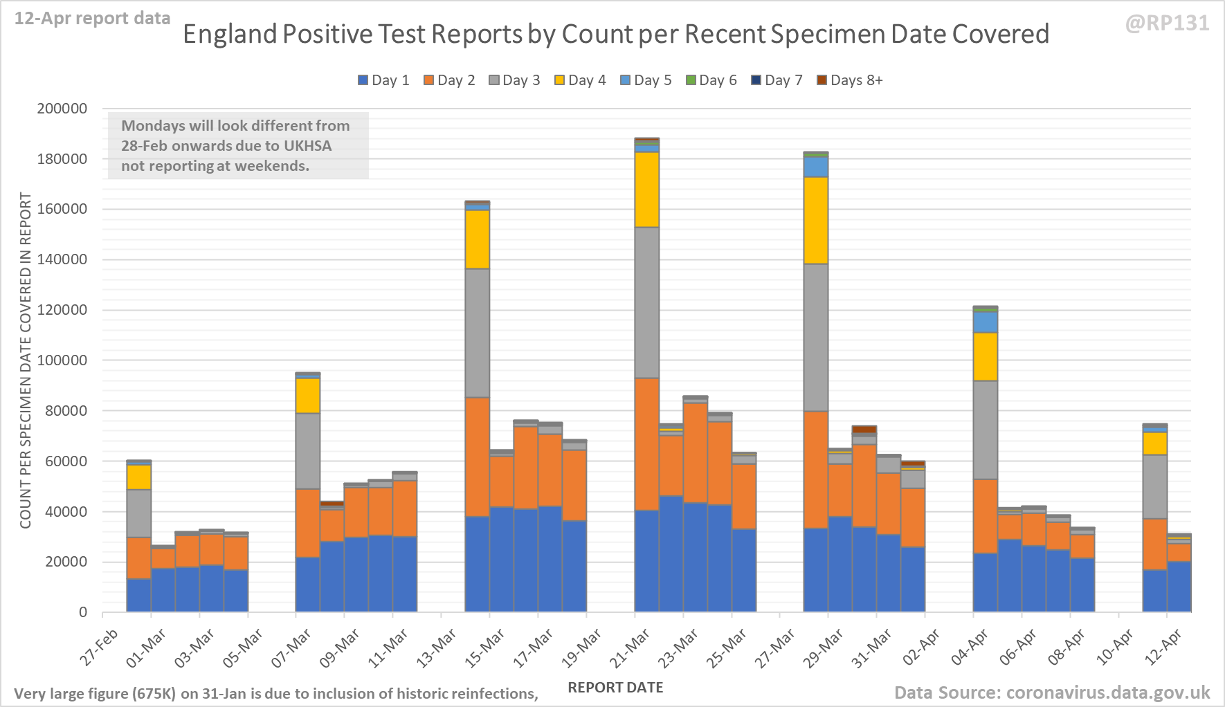 [4/9] Chart for monitoring lag in reporting of England positive test results. Each column represents a given day's report and shows which specimen dates it covers.