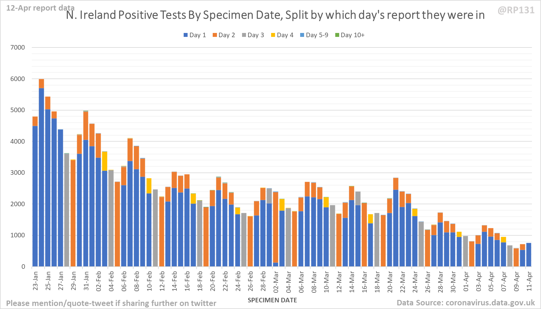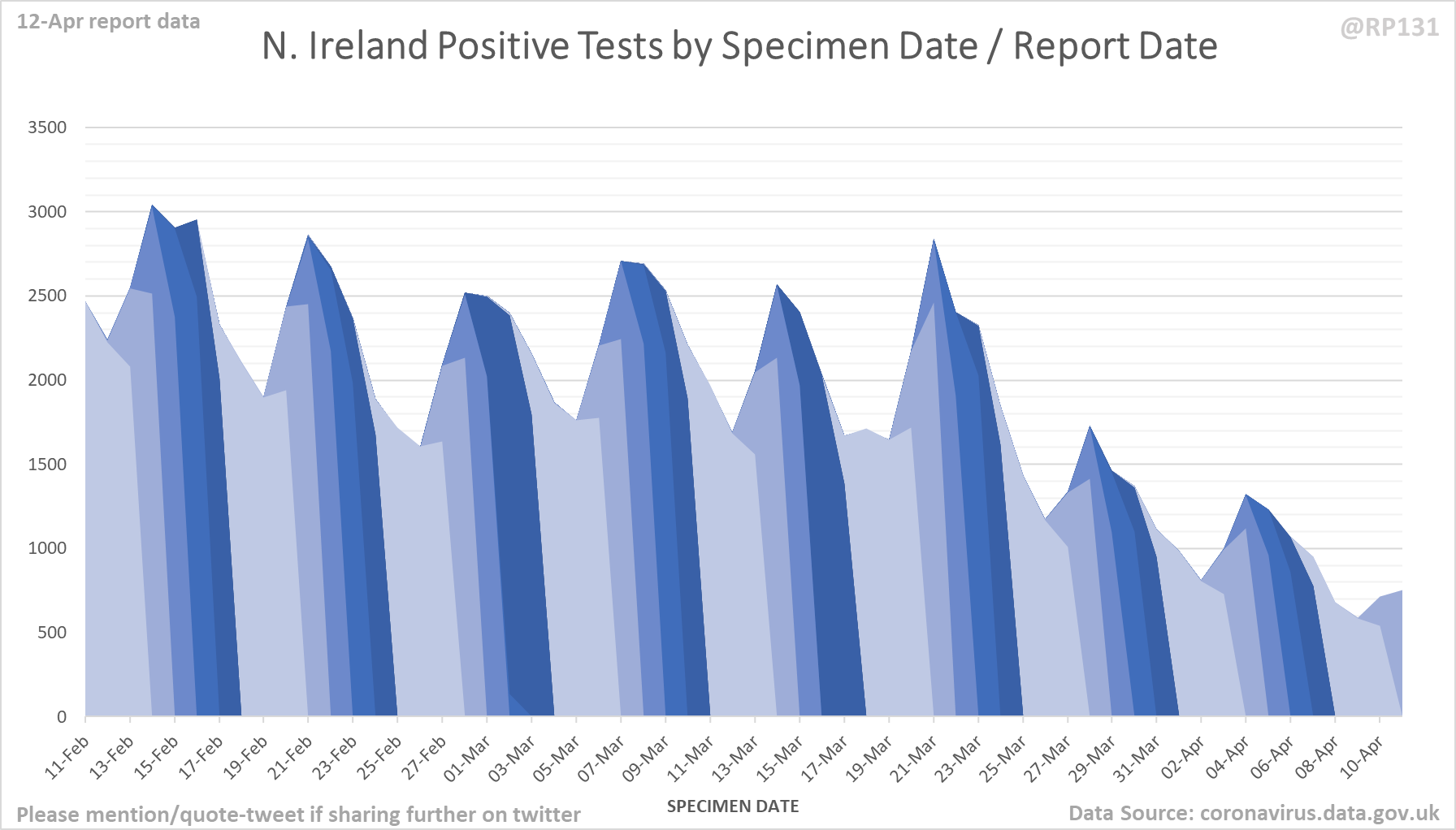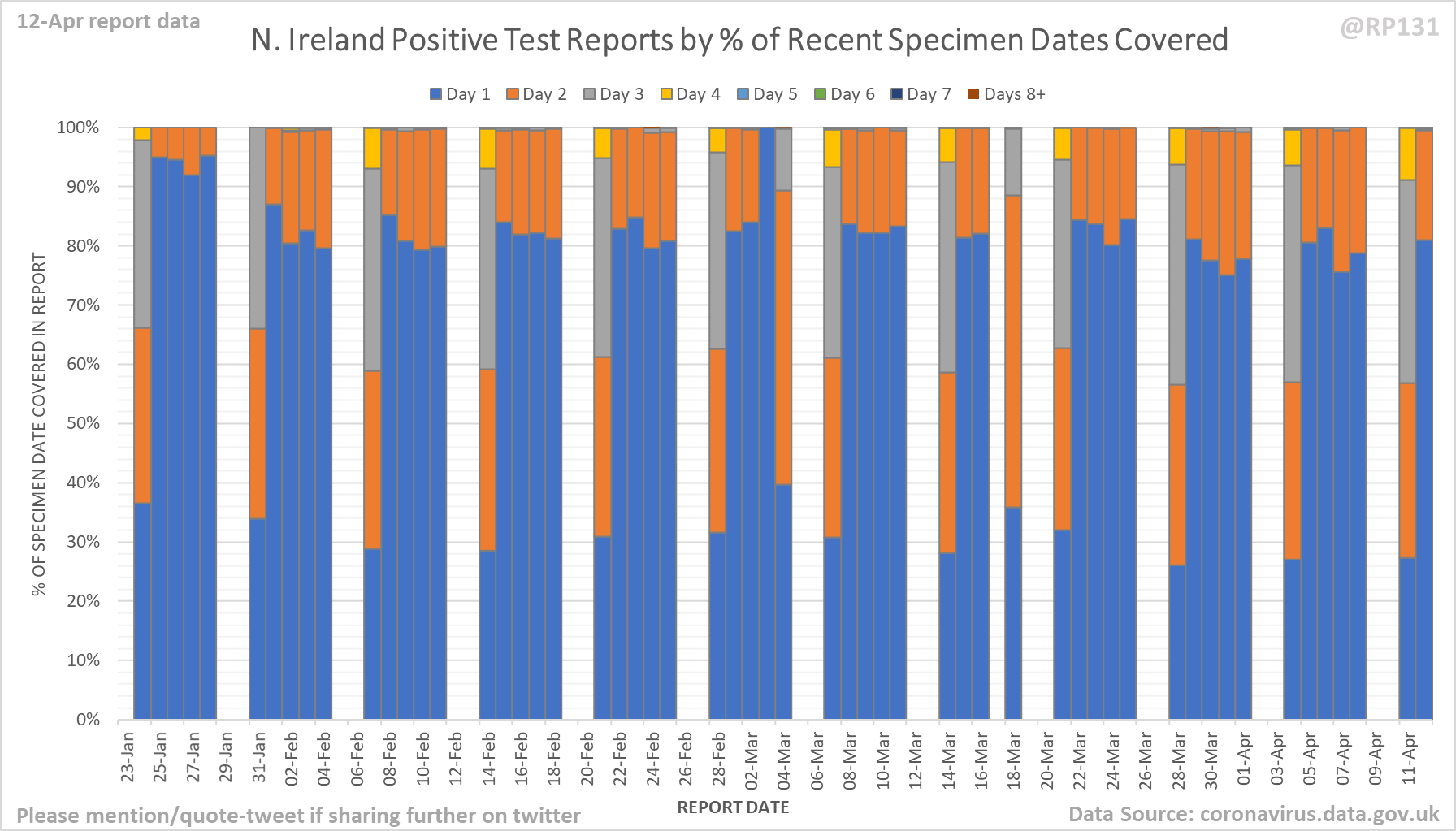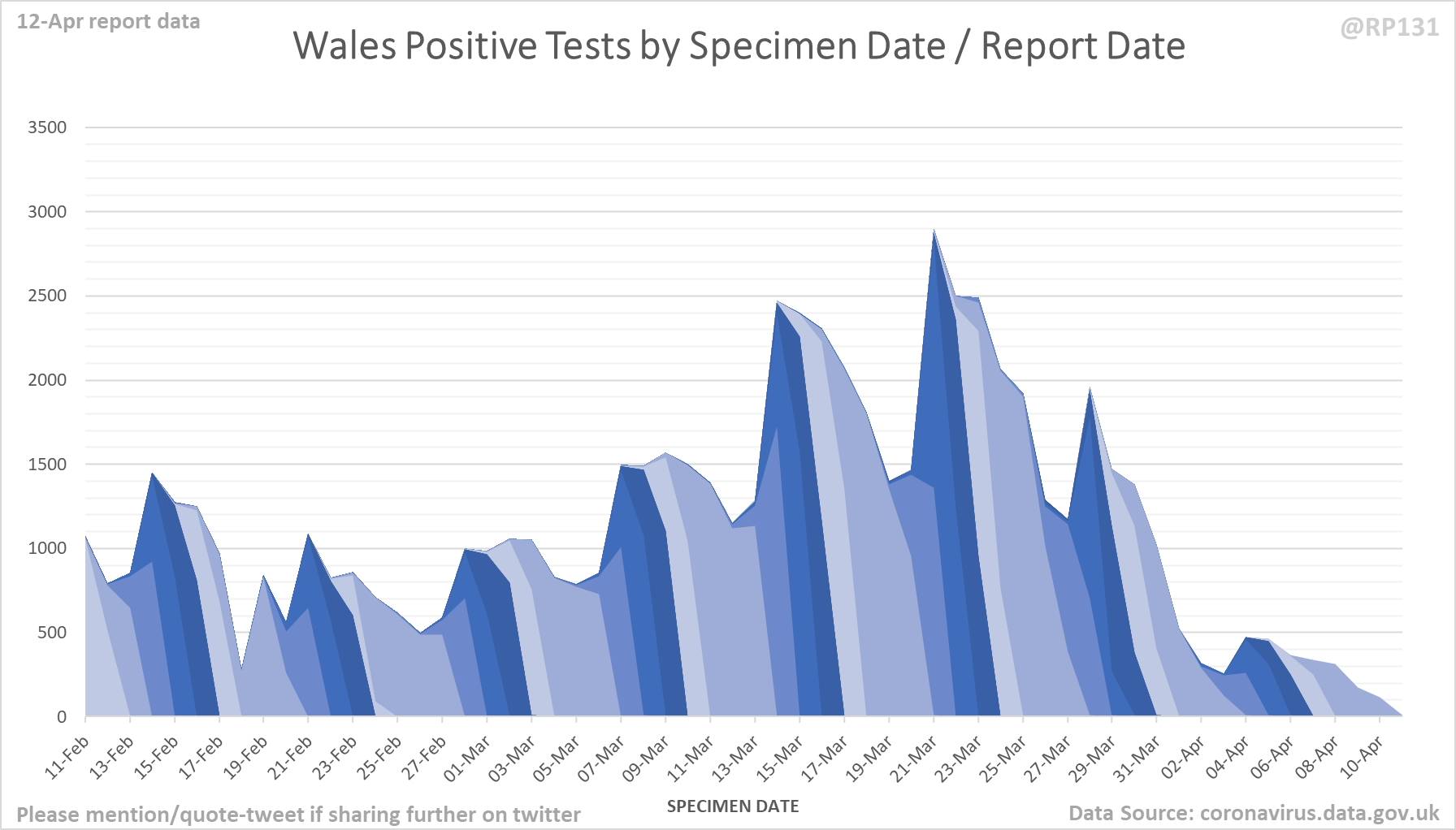 [4/9] Chart for monitoring lag in reporting of England positive test results. Each column represents a given day's report and shows which specimen dates it covers.