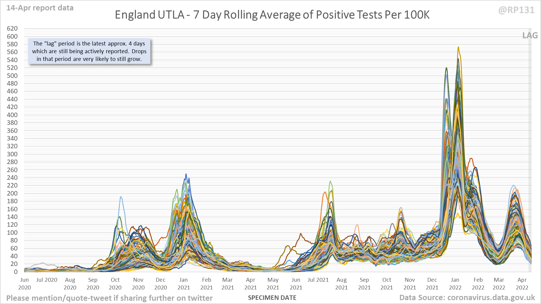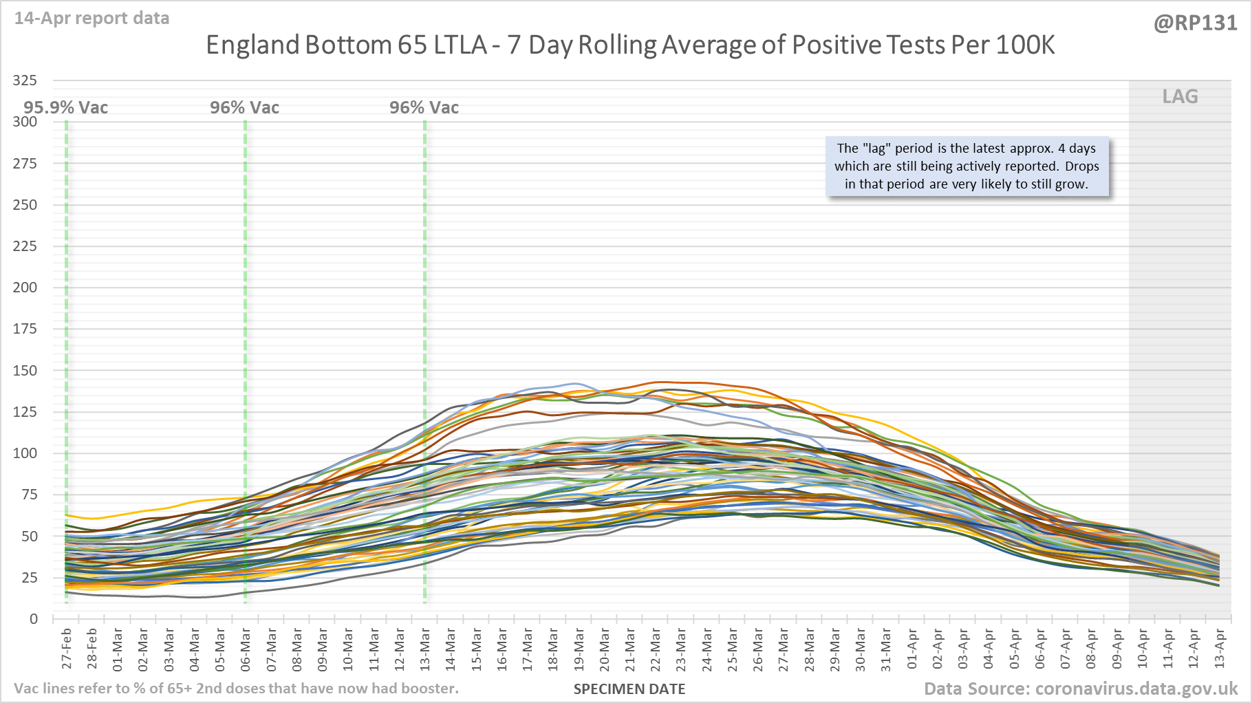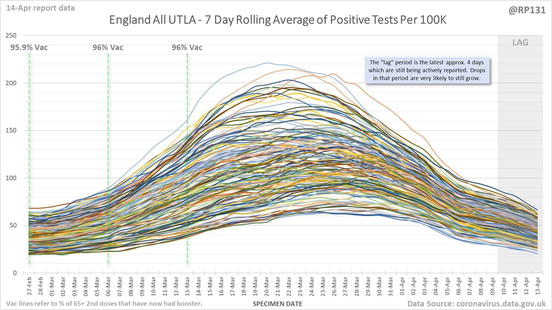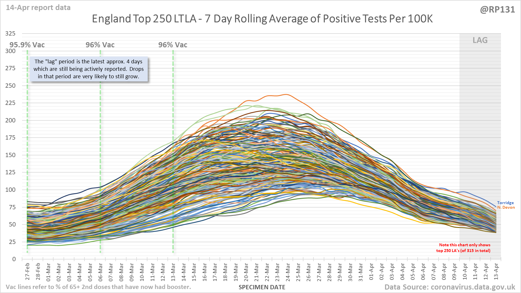 [1/9] England Local Authority "spaghetti" chart (14-Apr) which shows rolling average of positives by specimen date for the top 250 (of 315 total) lower tier local authorities in England.
