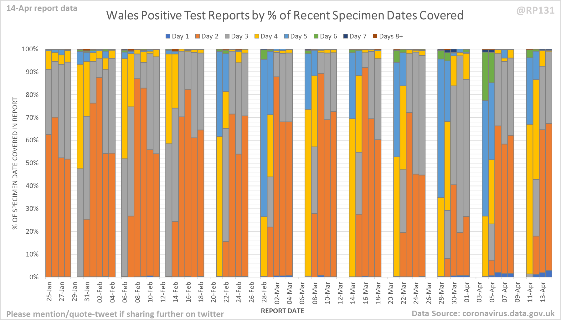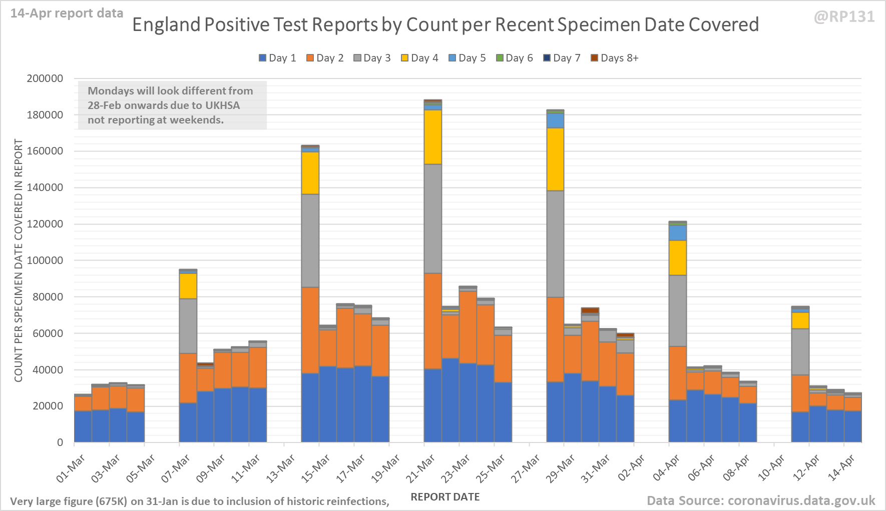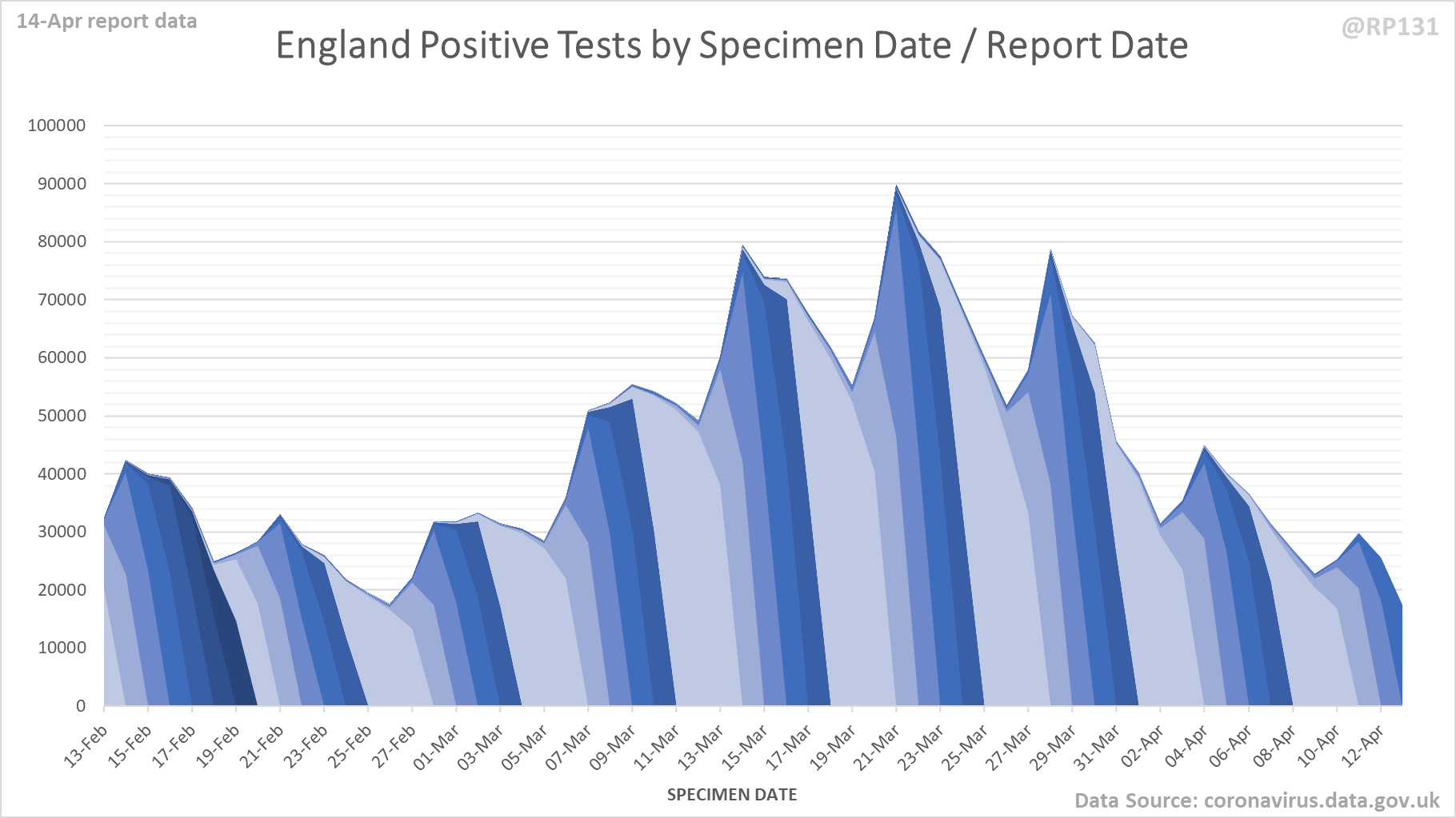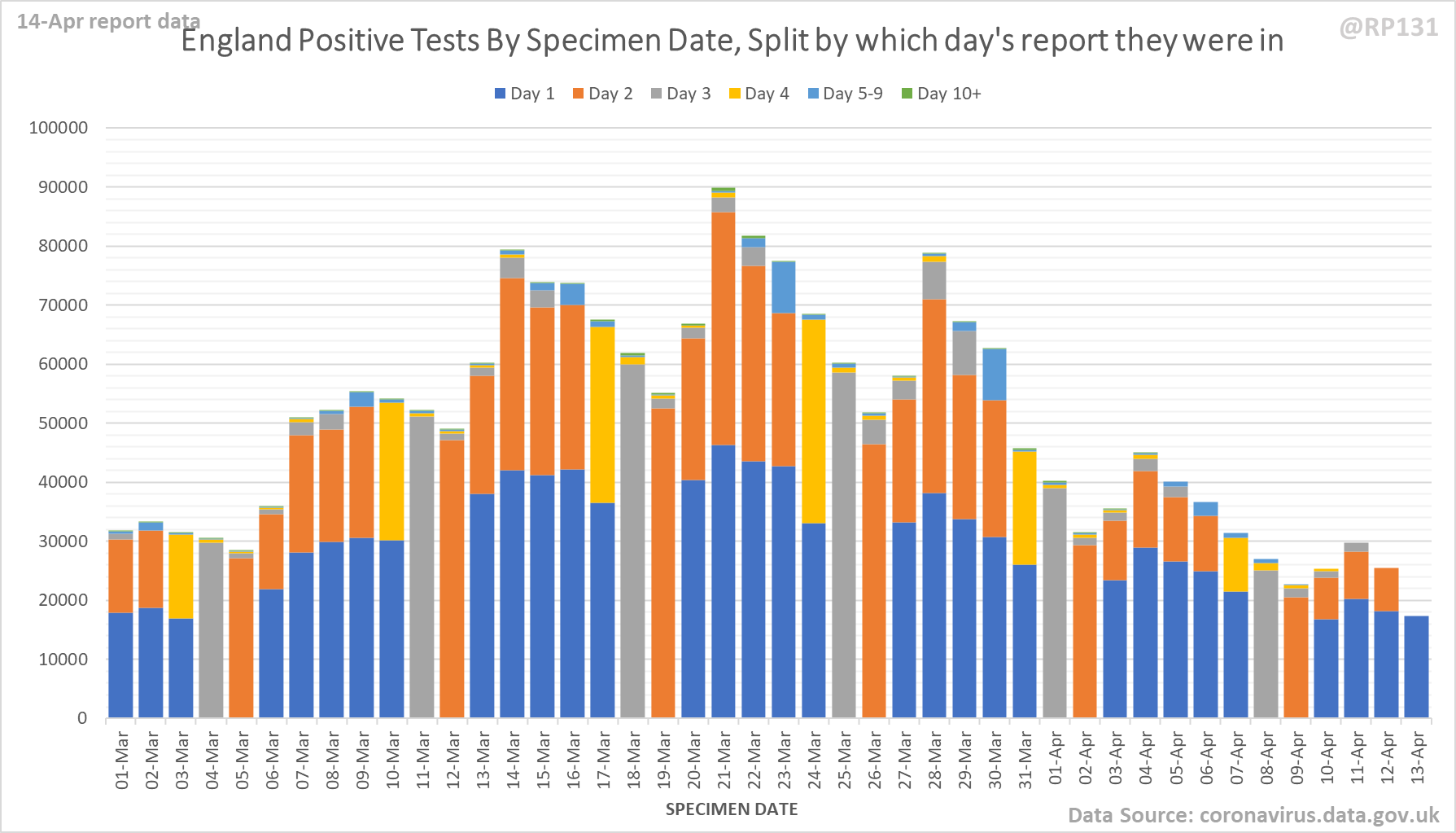 [4/9] Chart for monitoring lag in reporting of England positive test results. Each column represents a given day's report and shows which specimen dates it covers.