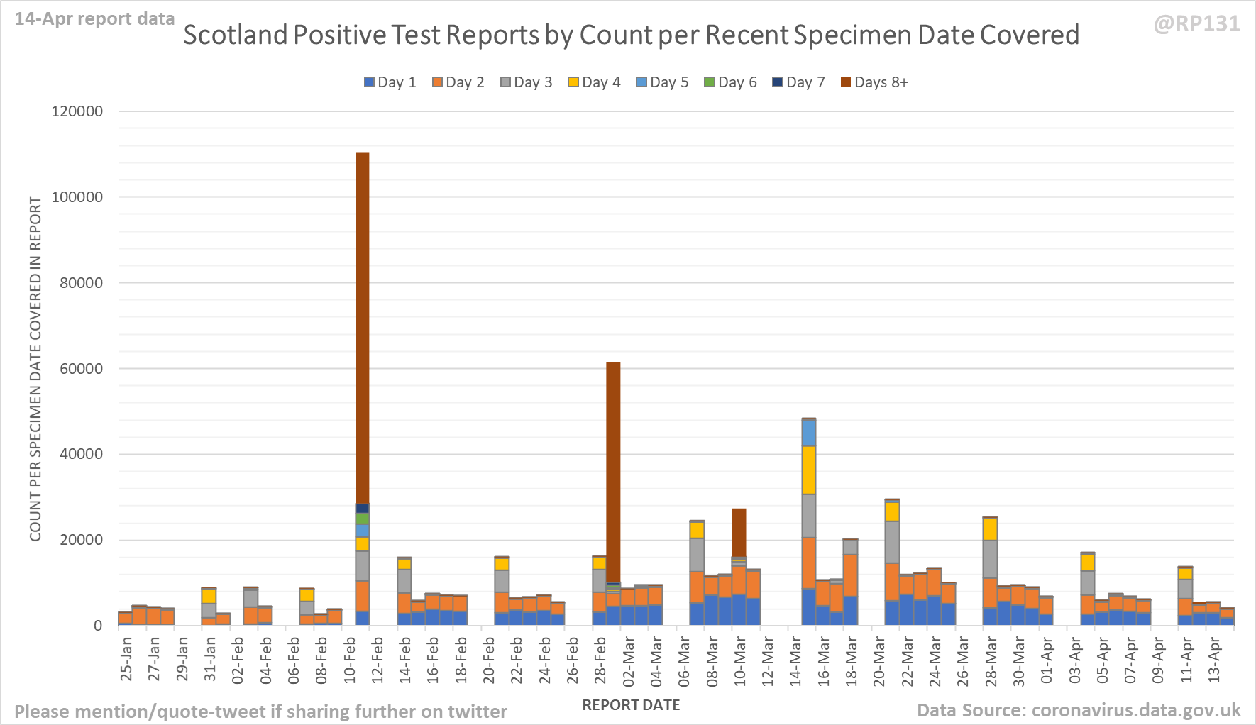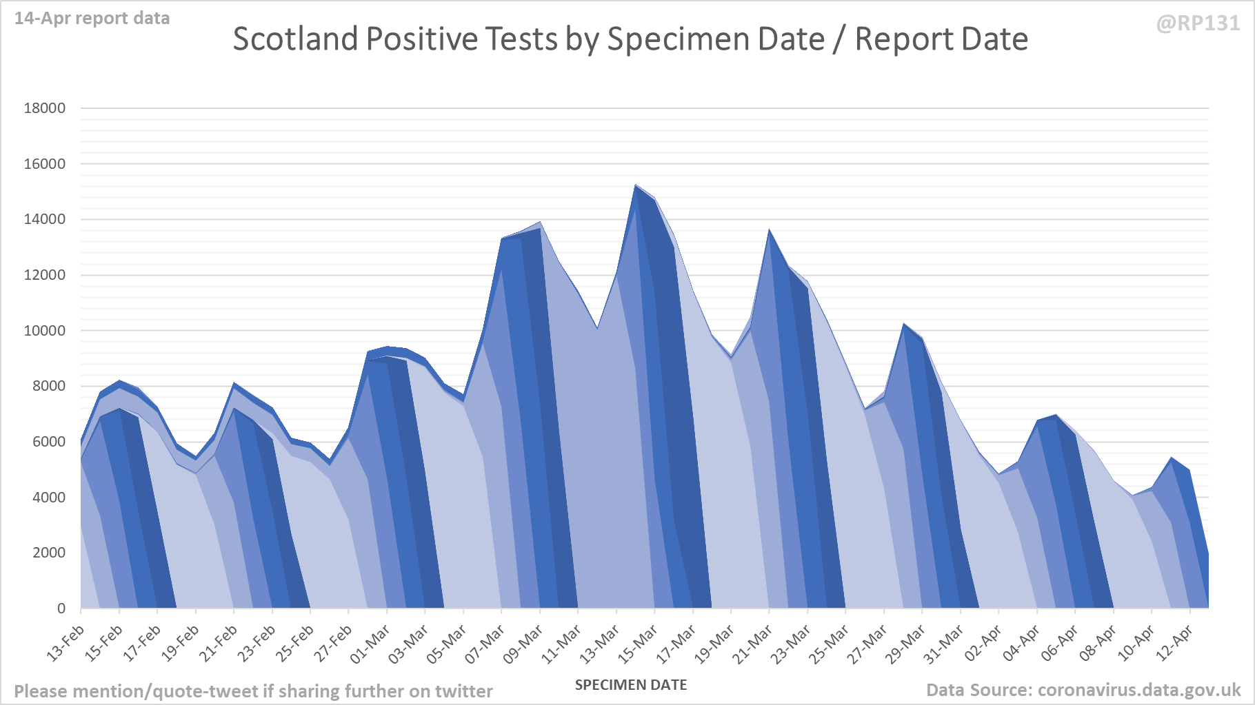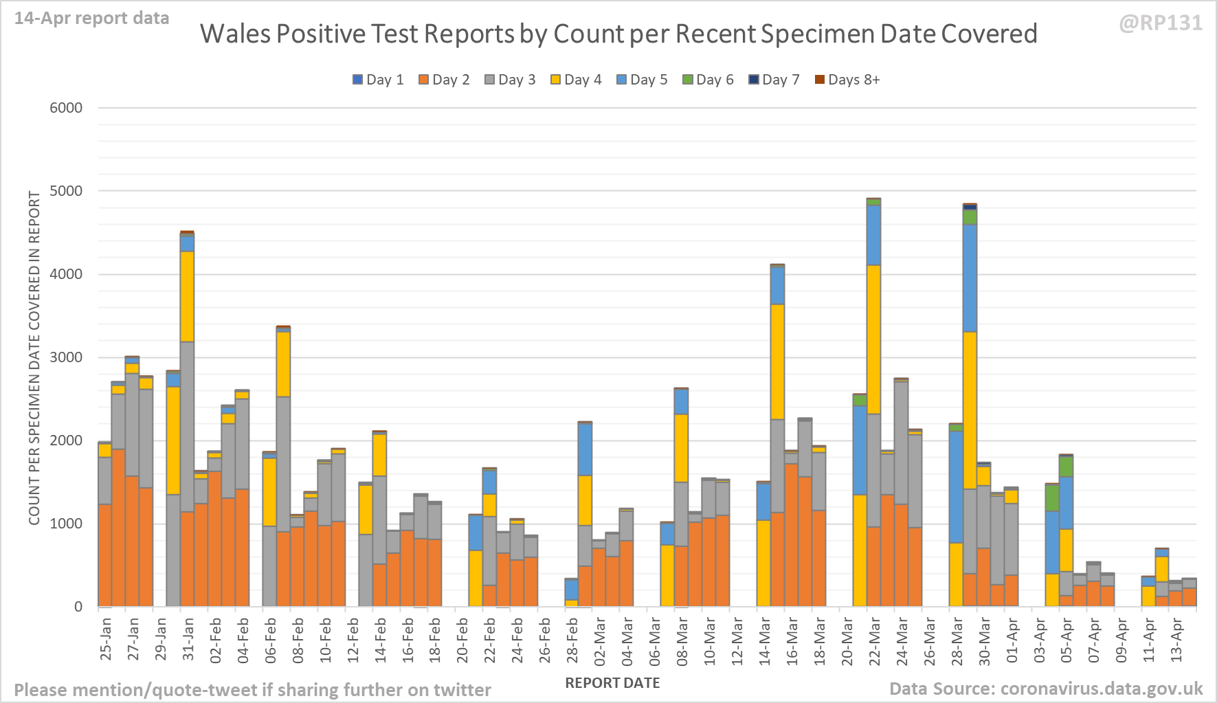 [4/9] Chart for monitoring lag in reporting of England positive test results. Each column represents a given day's report and shows which specimen dates it covers.