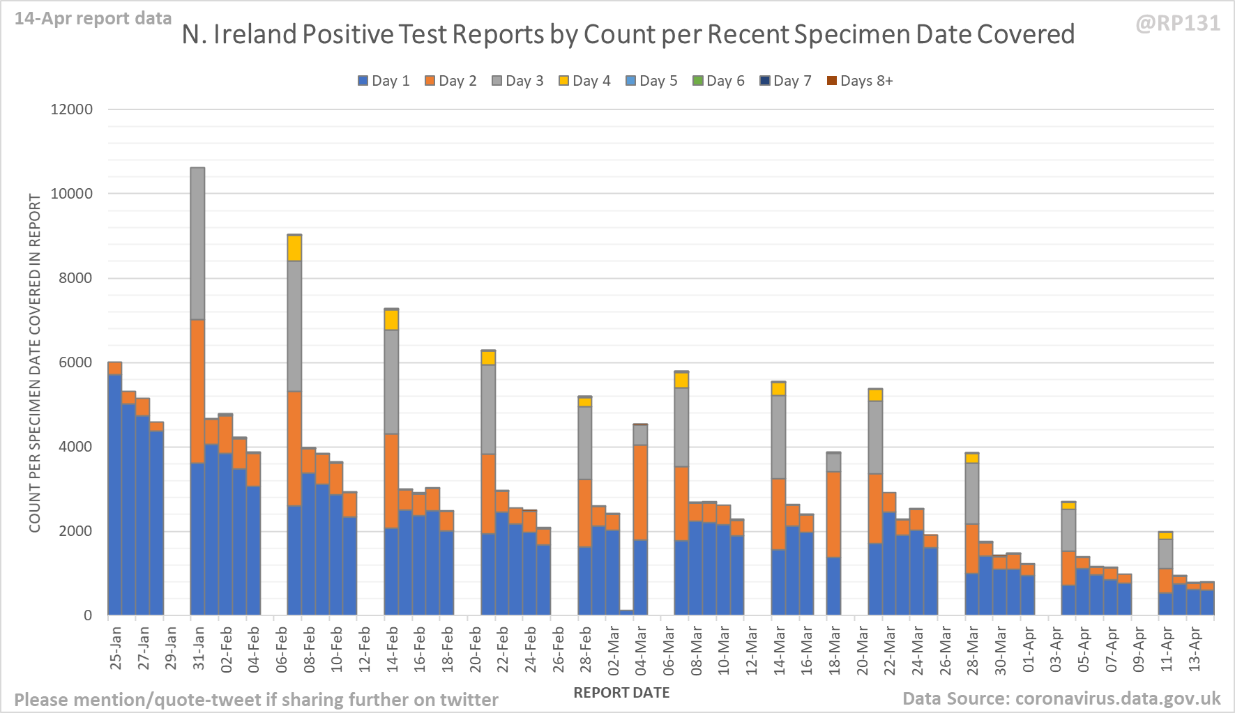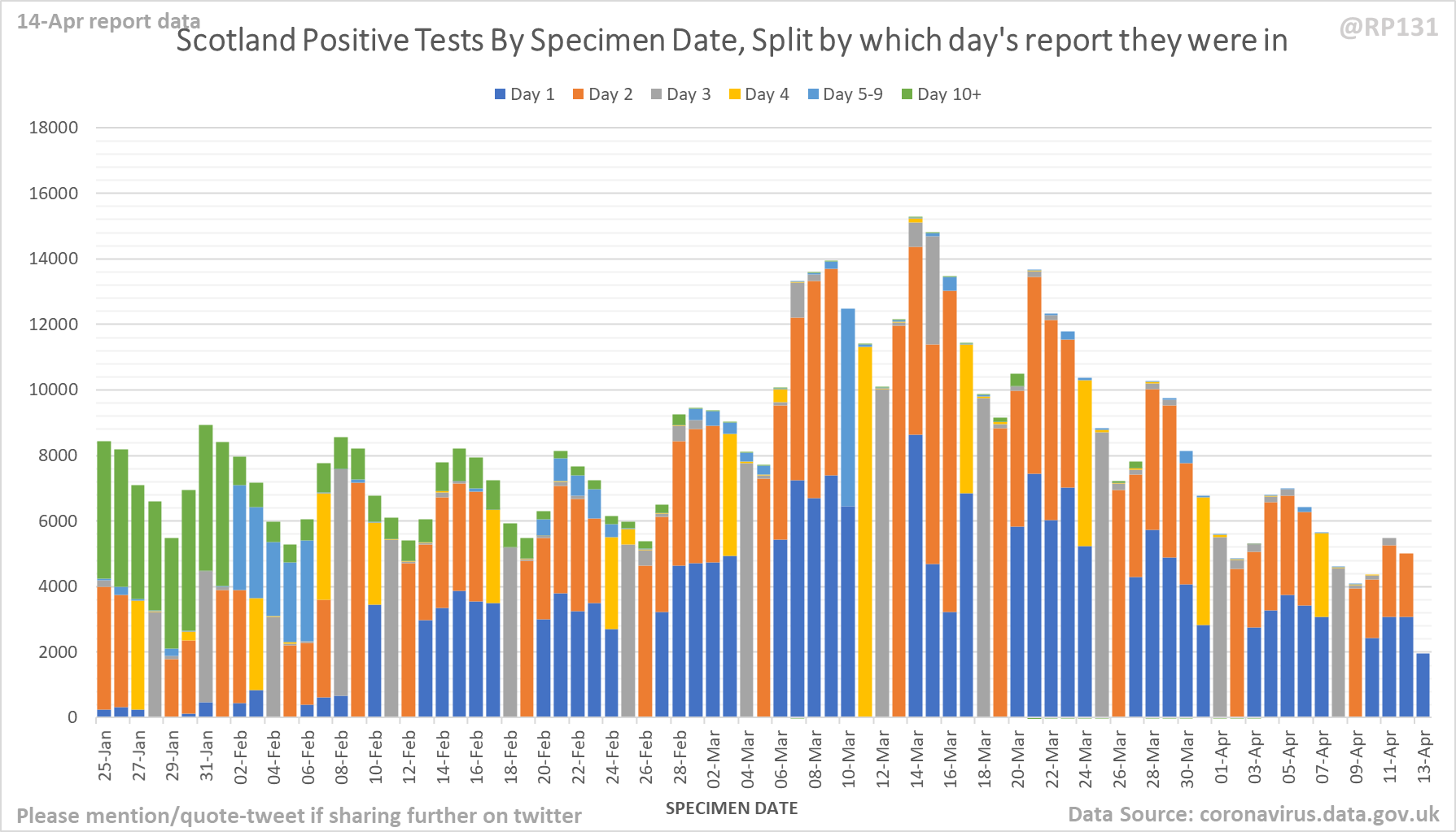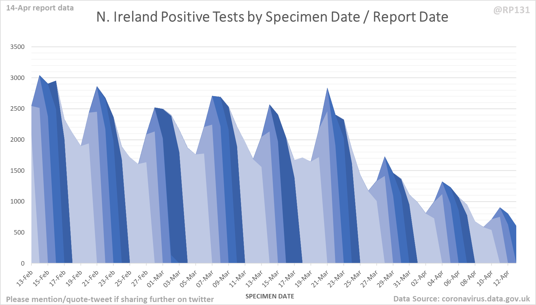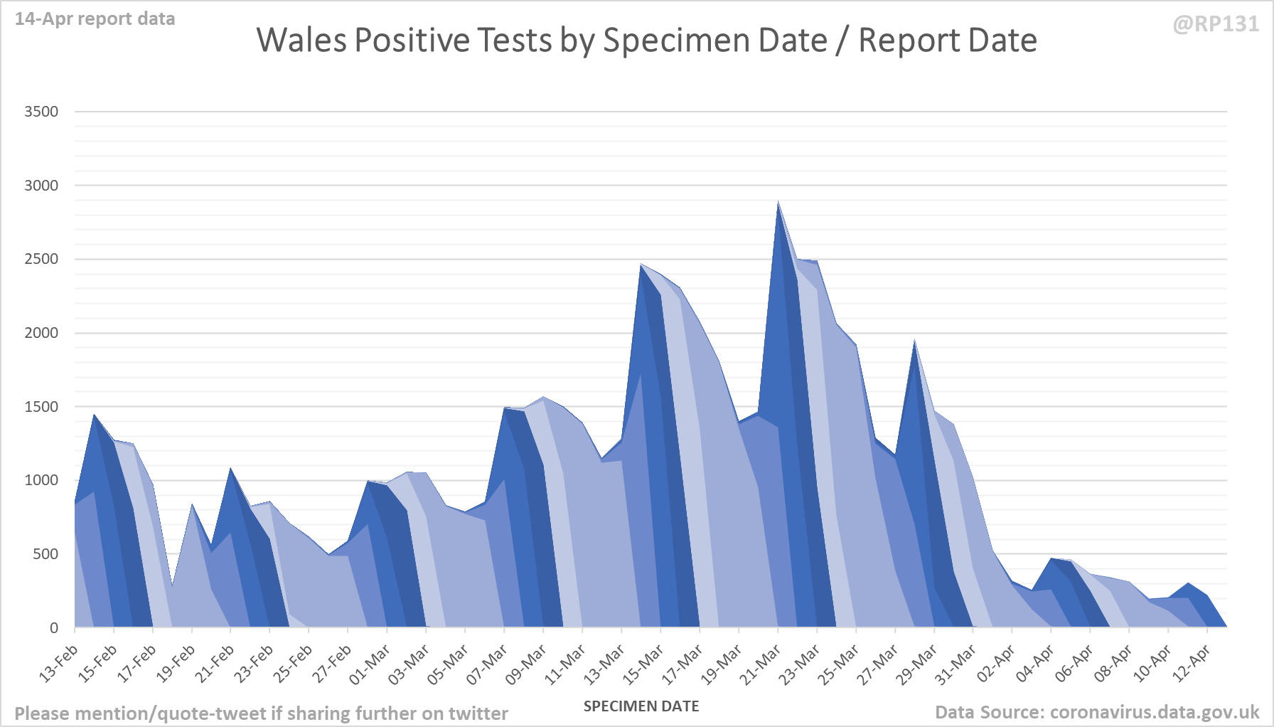 [4/9] Chart for monitoring lag in reporting of England positive test results. Each column represents a given day's report and shows which specimen dates it covers.
