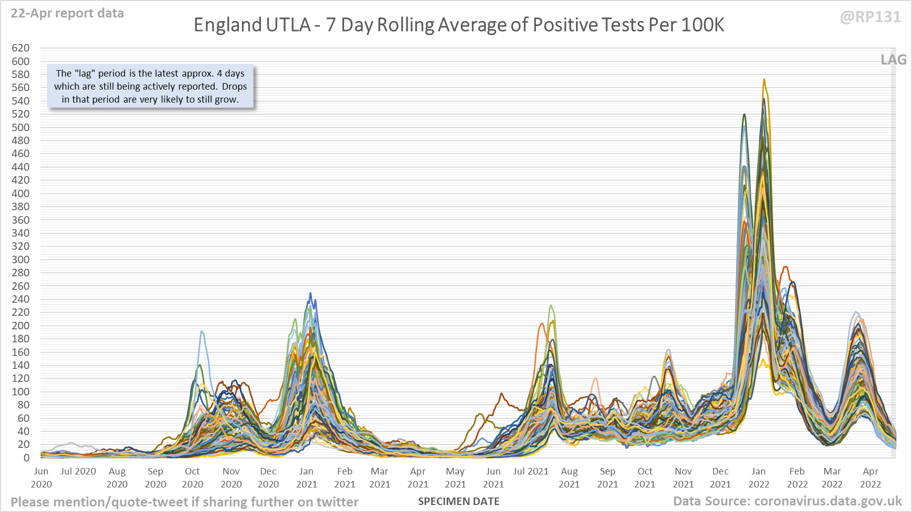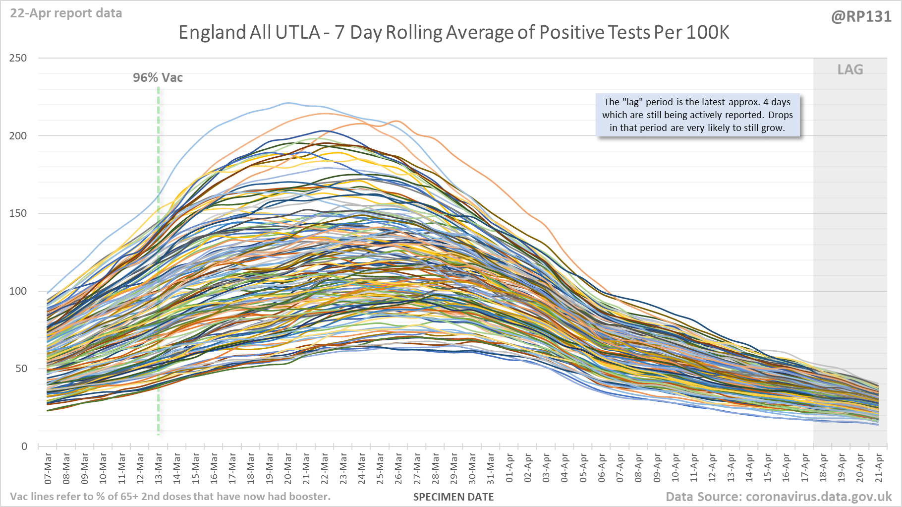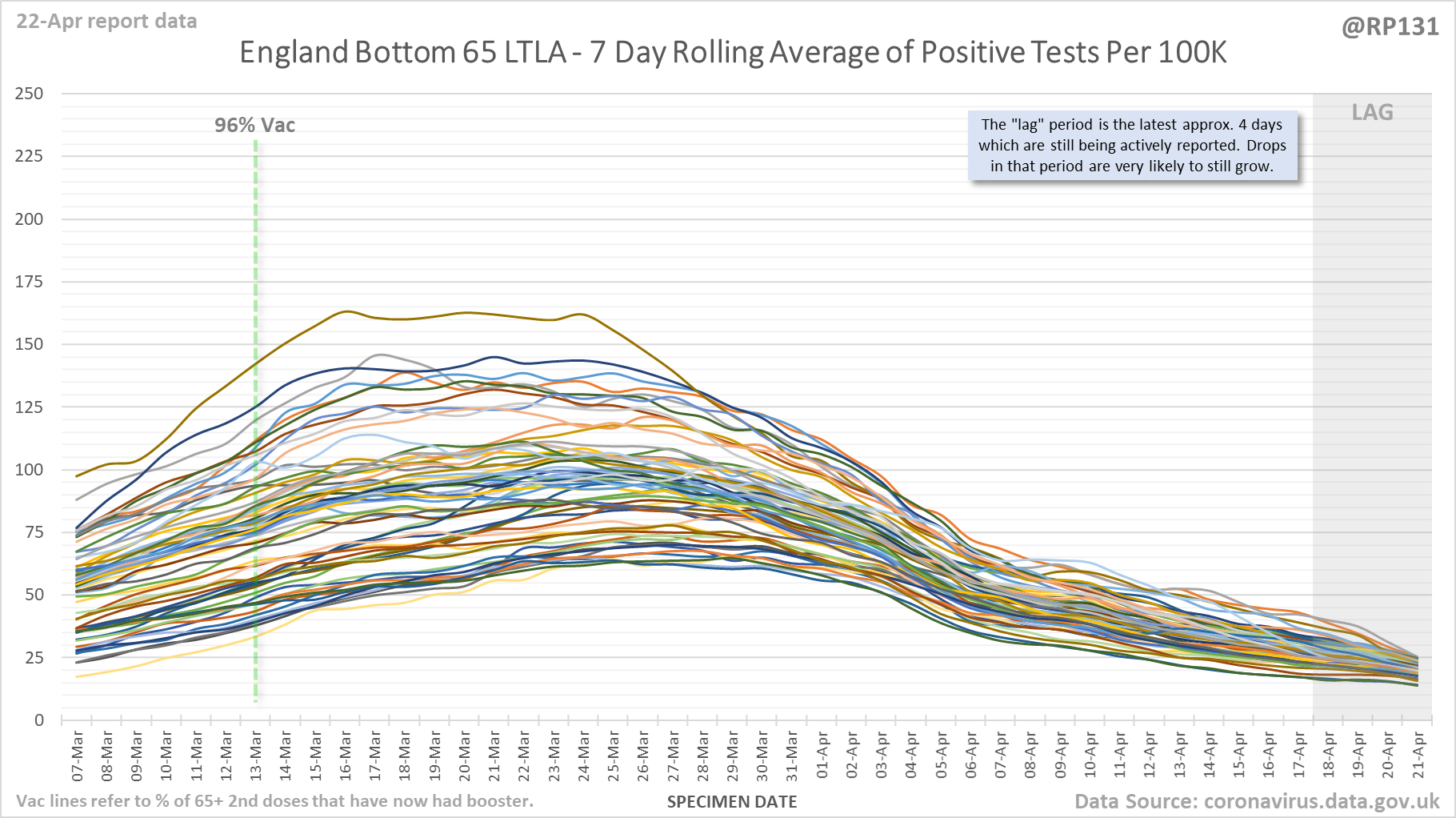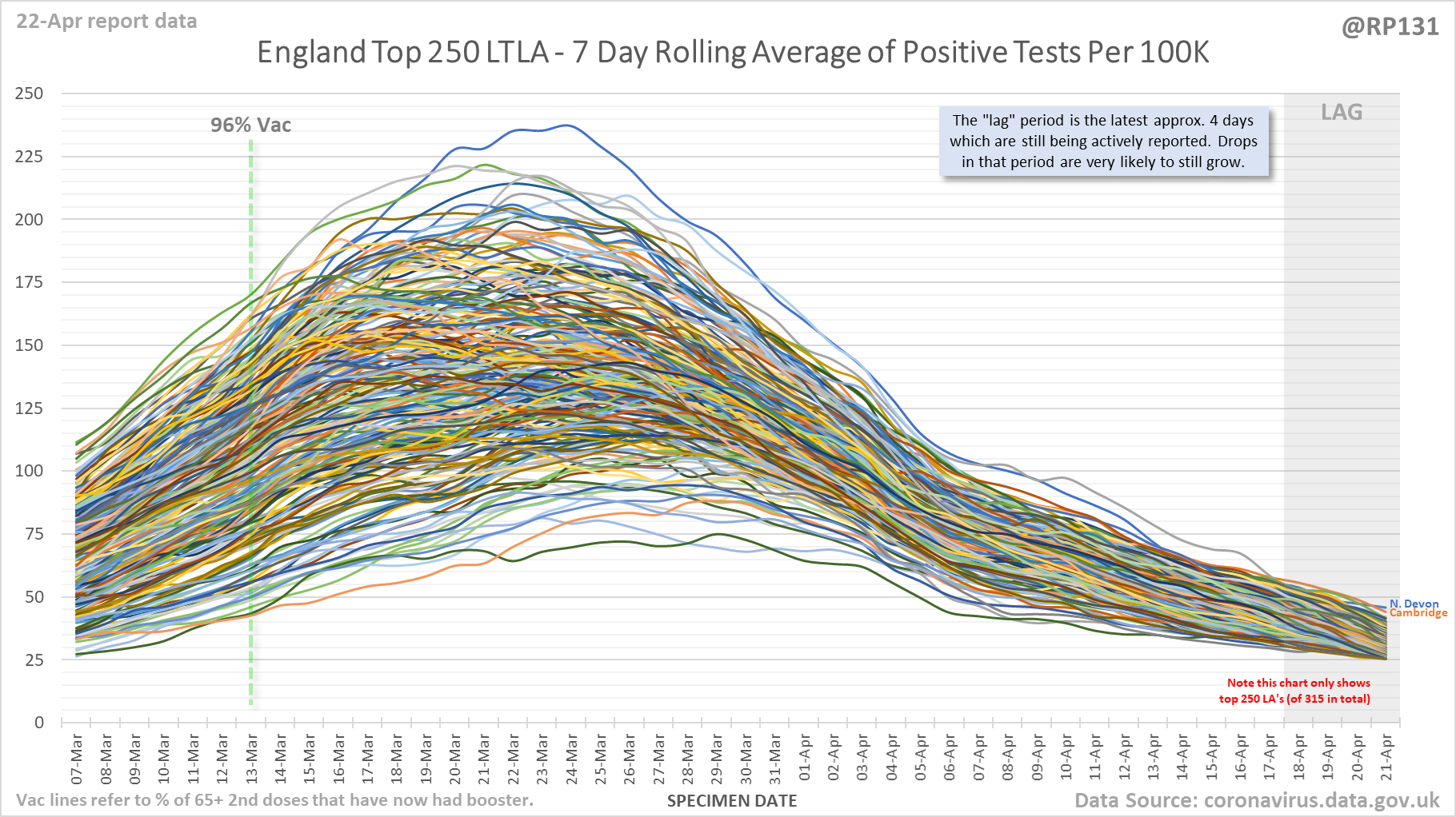 [1/9] England Local Authority "spaghetti" chart (22-Apr) which shows rolling average of positives by specimen date for the top 250 (of 315 total) lower tier local authorities in England.