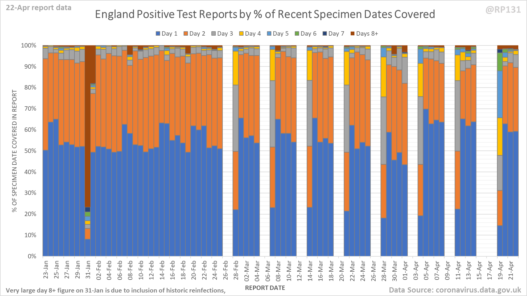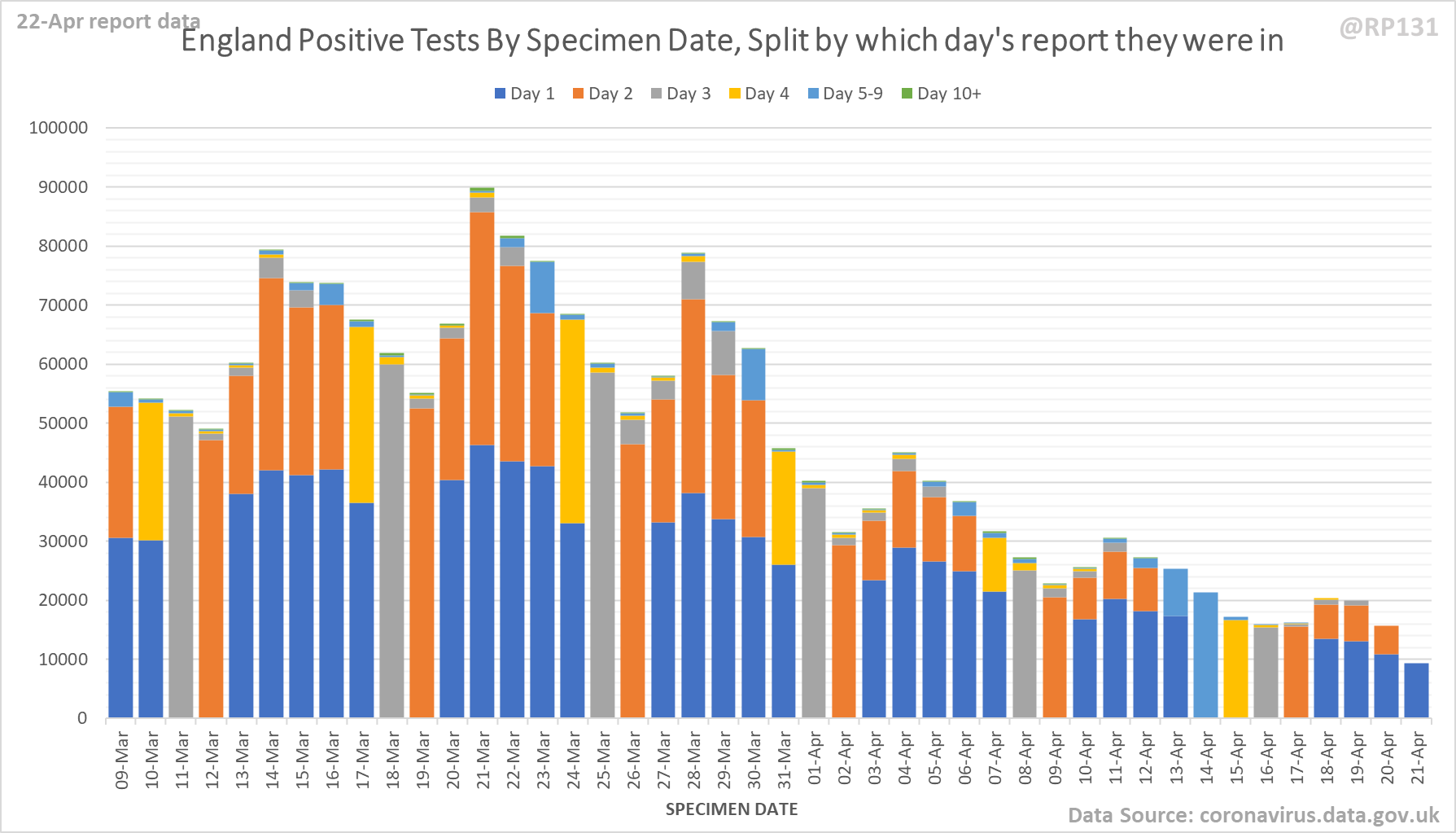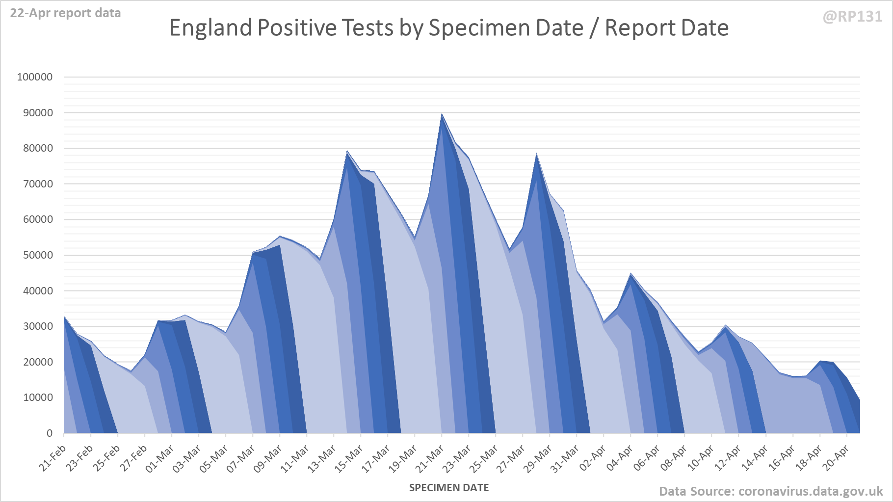 [4/9] Chart for monitoring lag in reporting of England positive test results. Each column represents a given day's report and shows which specimen dates it covers.