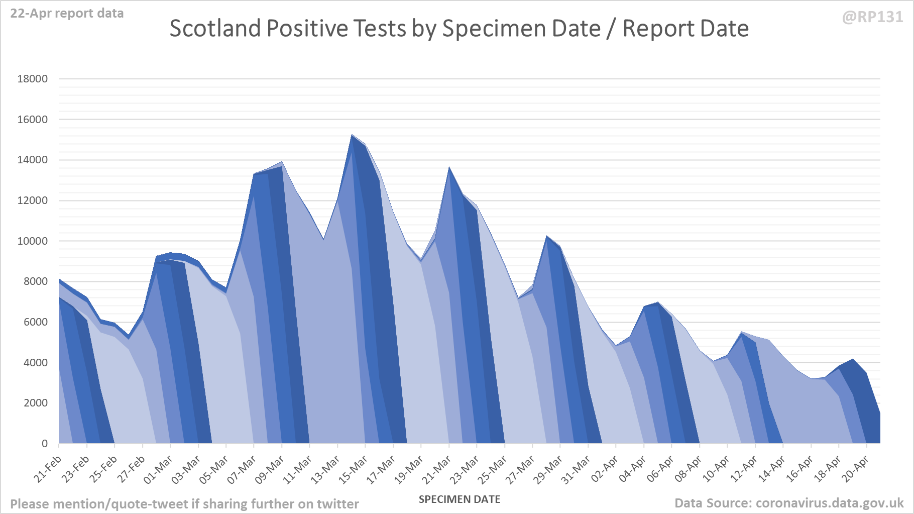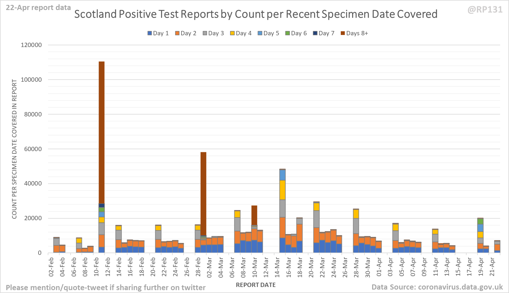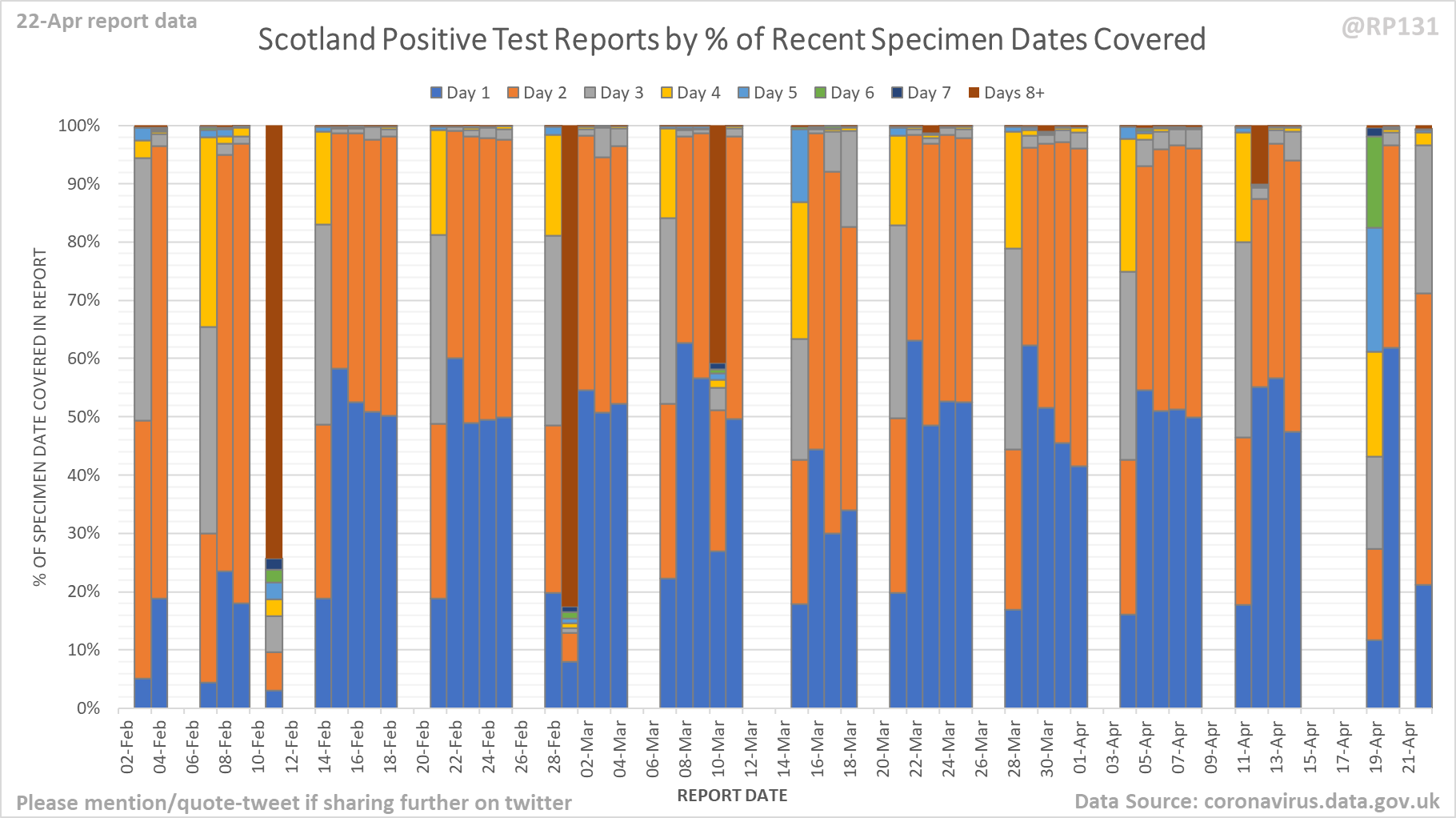 [4/9] Chart for monitoring lag in reporting of England positive test results. Each column represents a given day's report and shows which specimen dates it covers.