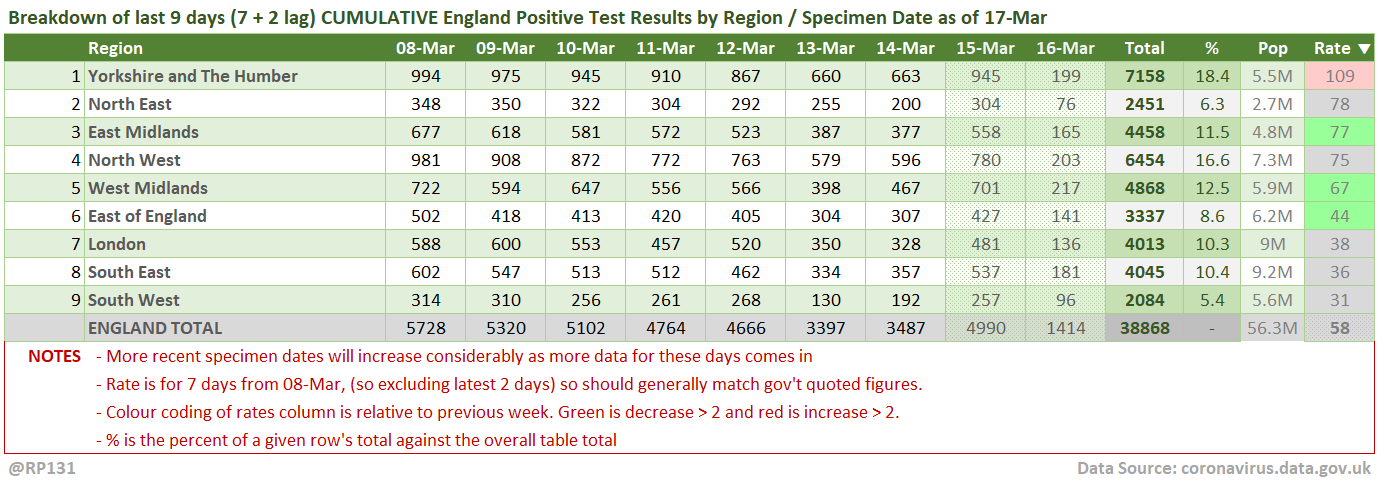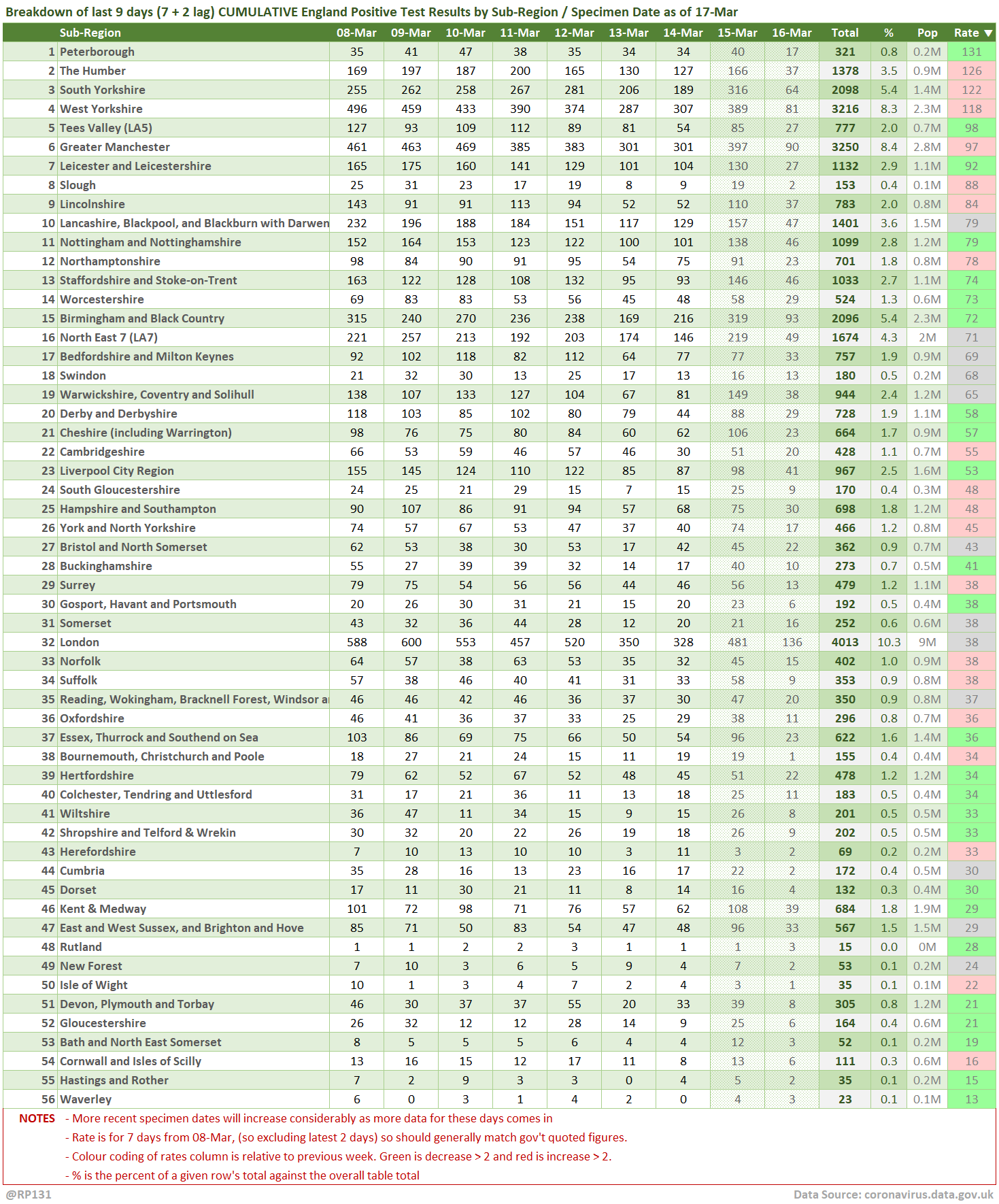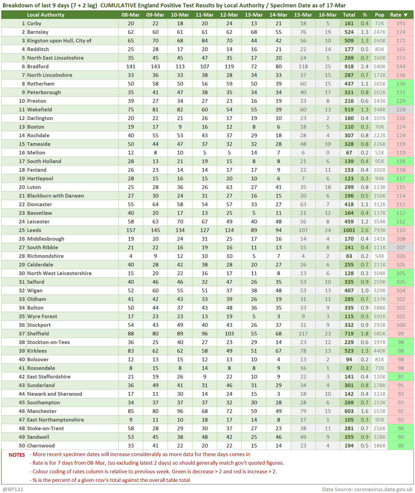 [1/15] #covid19uk - Tables thread. Re-ordered now to put the more popular rate sorted table at the top. So this is top 50 England Local Authorities by positives per 100K population in last 7 days, up to 3 days ago. Bright green means lower than previous period.