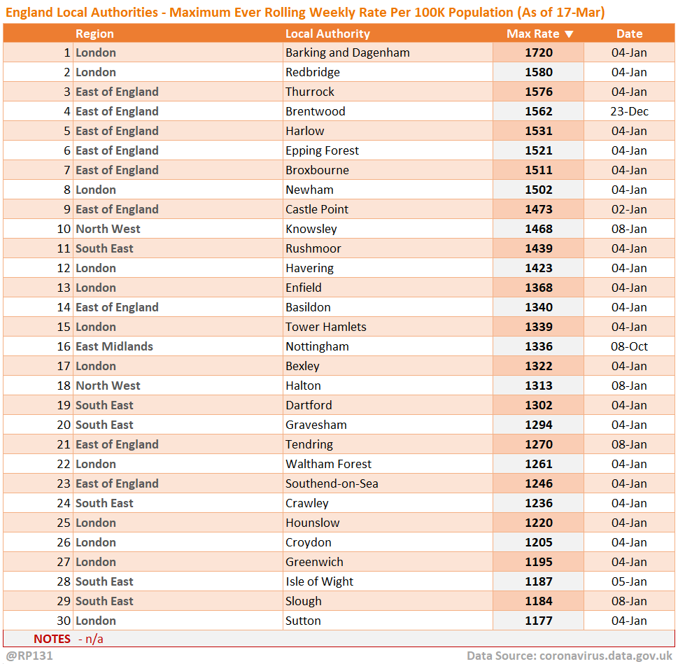 [11/15] Top 30 England local authorities by maximum weekly rate per 100K population recorded to date.