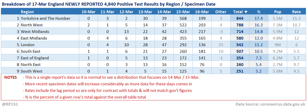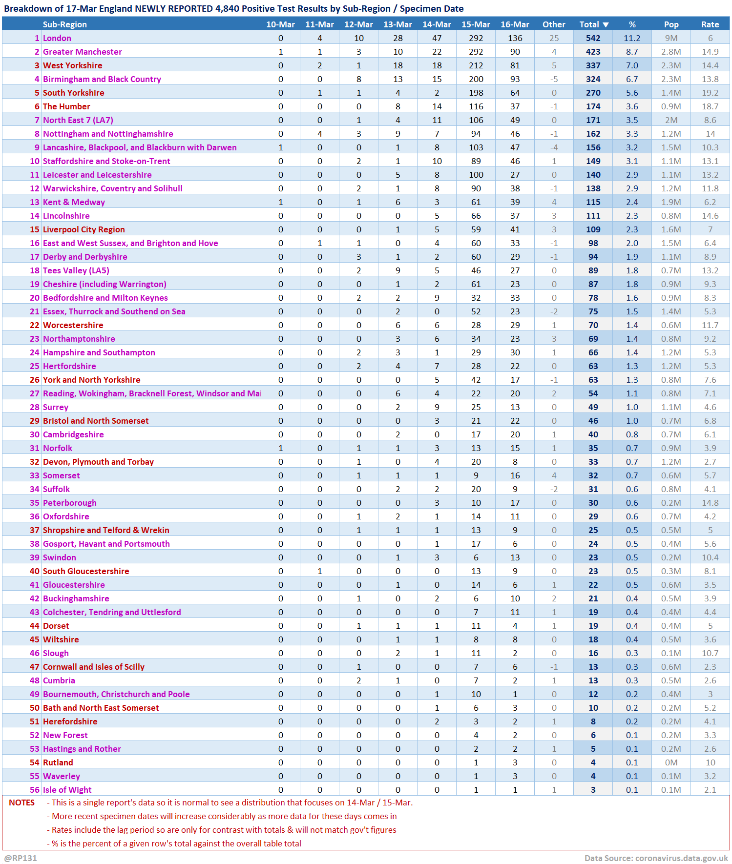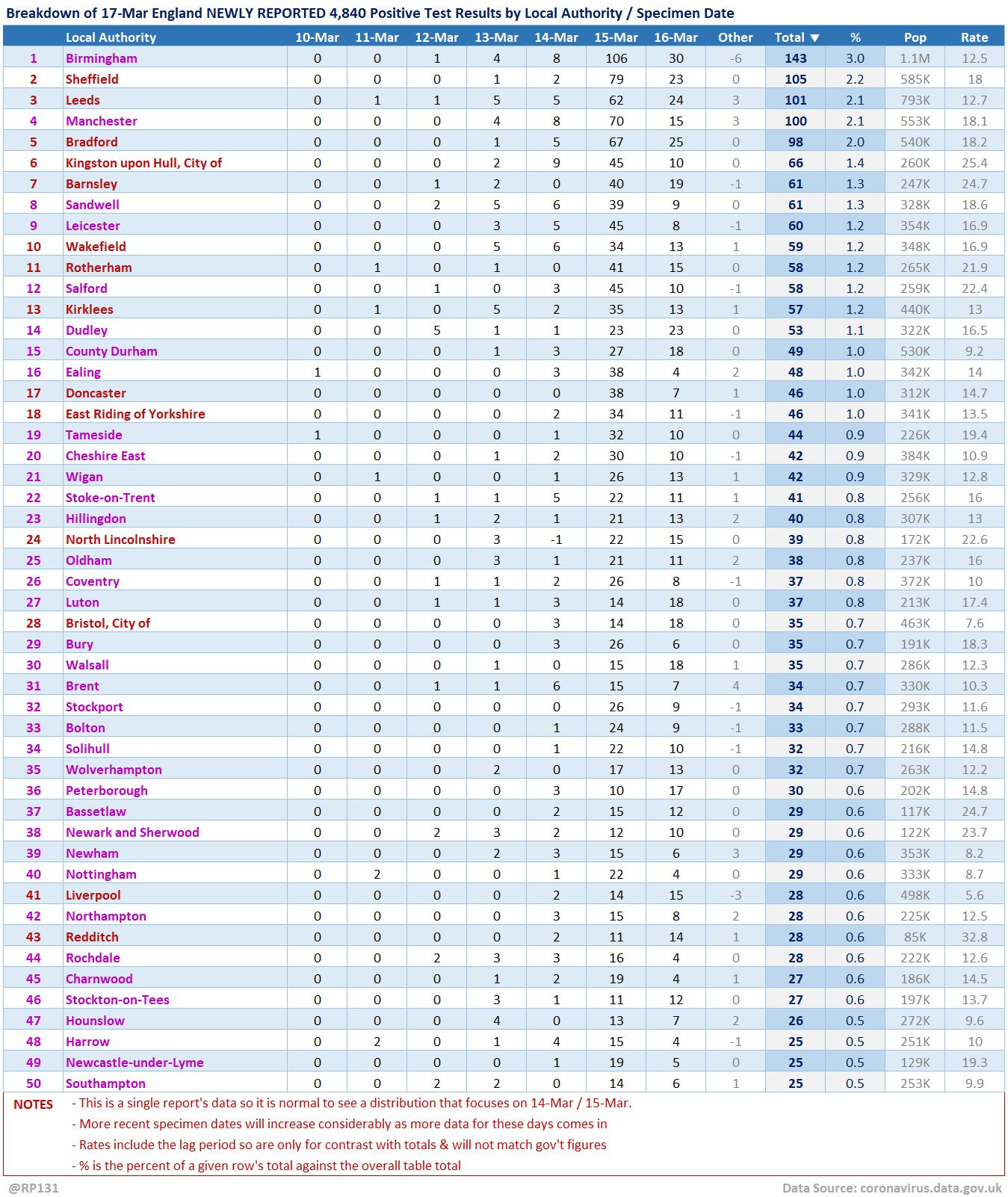 [5/15] Table view of today's 4,840 NEWLY REPORTED England positive test results by local authority and recent specimen dates. Here showing top 50 authorities which represent 48% of the population, but have 68% of the positives.