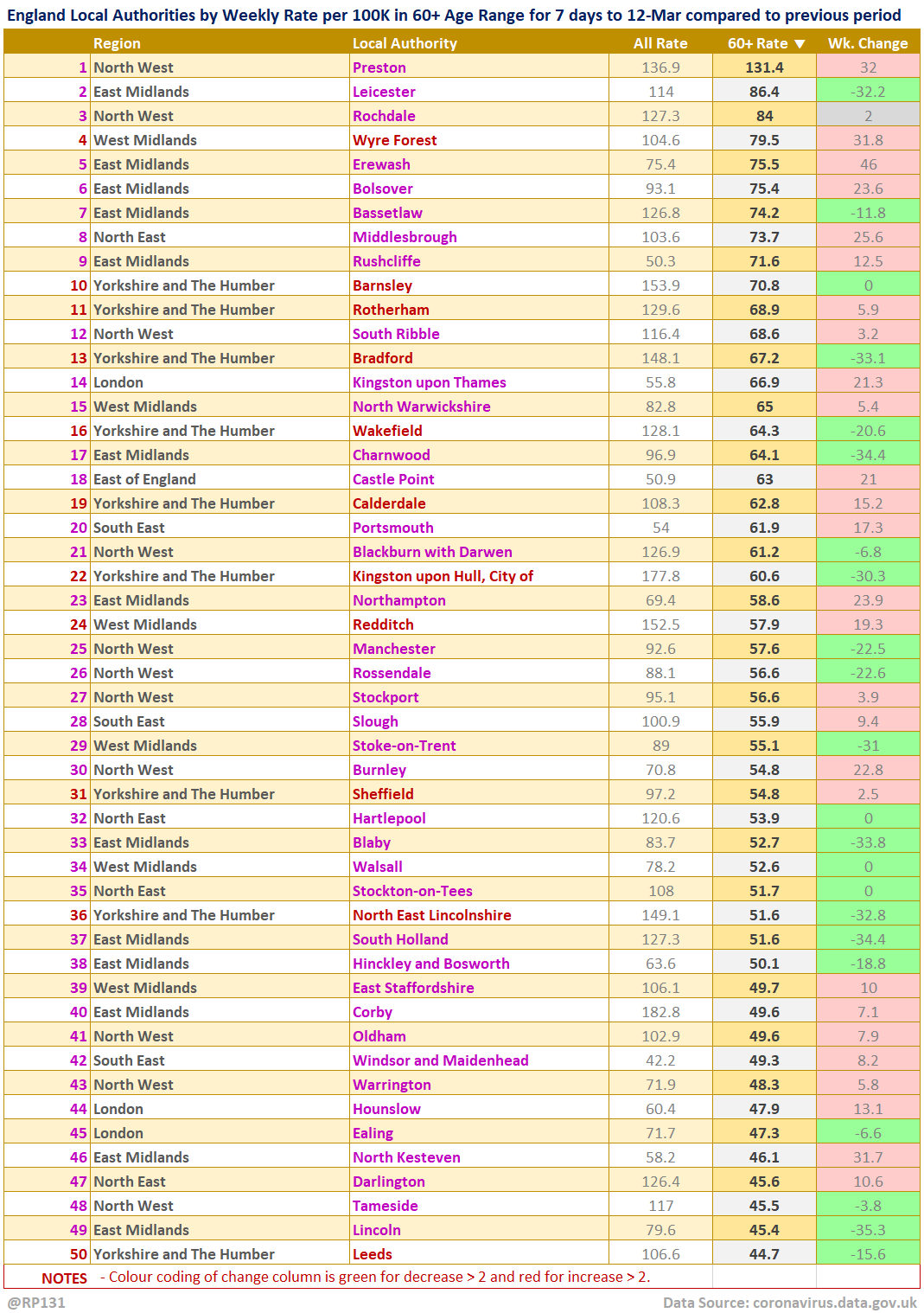 [9/15] Top 50 table view of latest availble Local Authority data for the 60+ age range for 7 days to 12-Mar sorted by descending rate per 100K population (of that age range). Change column is compared to previous week with red for increase and green for decrease.