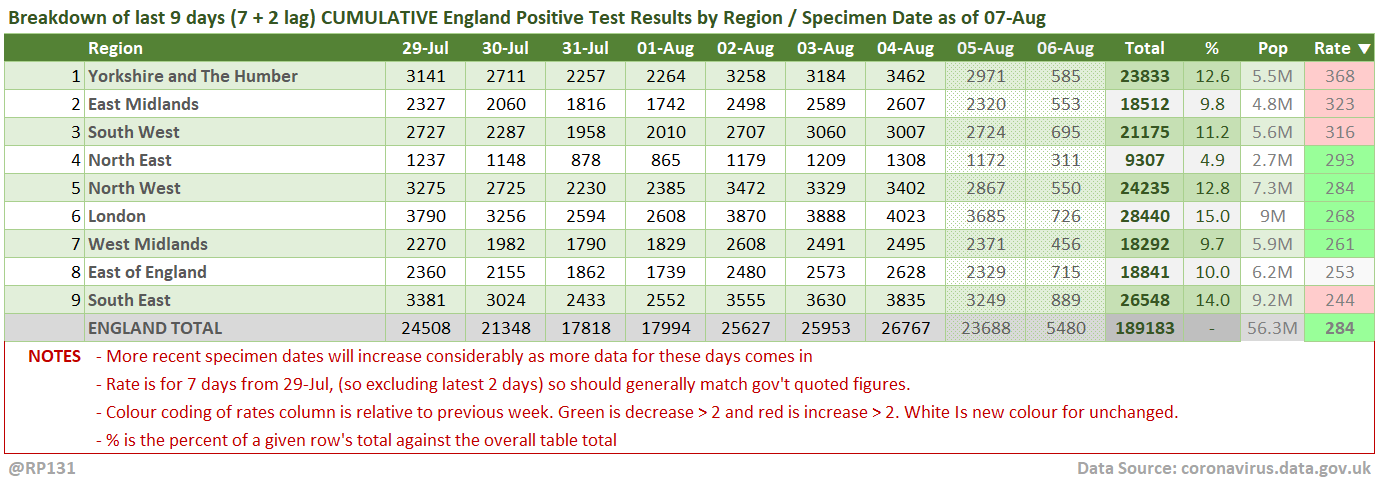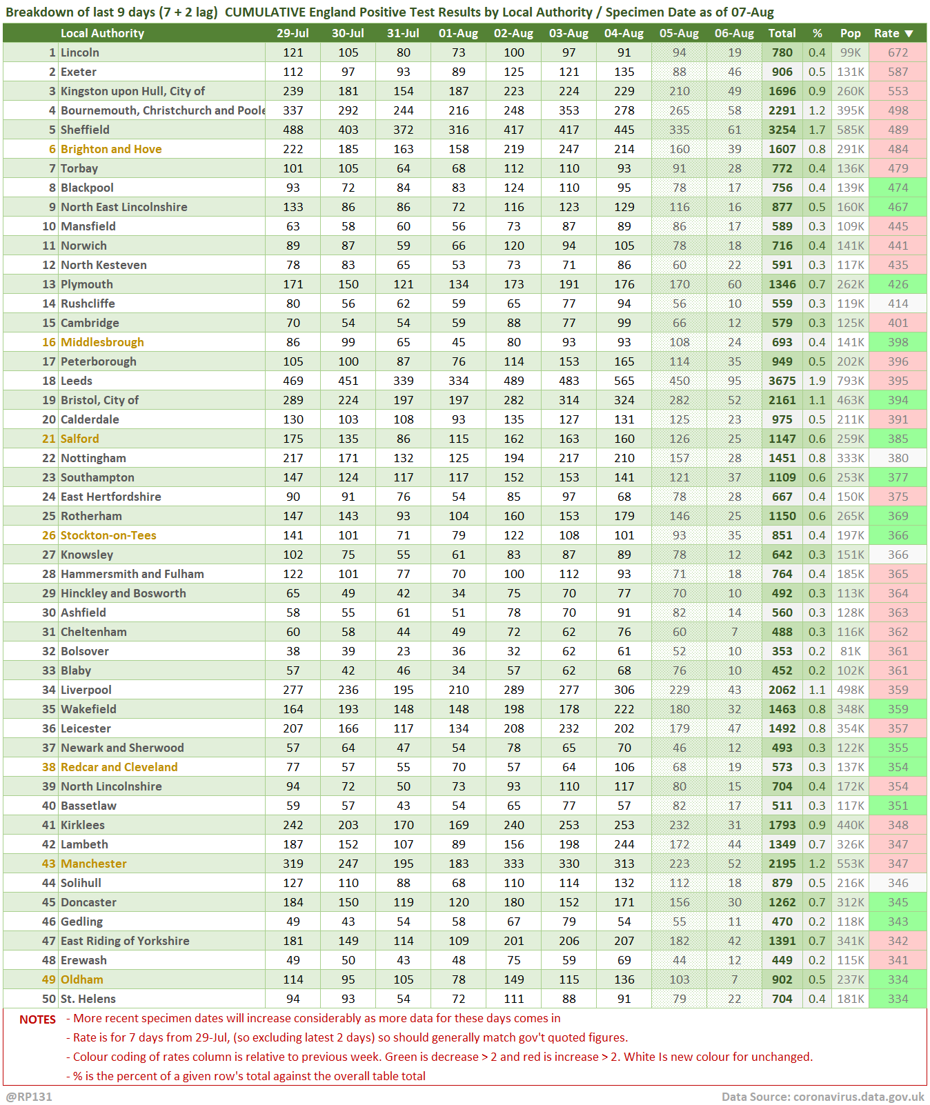 [1/13] #covid19uk - Tables thread. Starting with the top 50 England Local Authorities by positives per 100K population in last 7 days, up to 3 days ago. Bright green means lower than previous period.