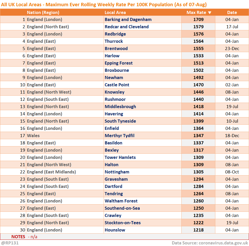[10/13] Top 30 UK-wide local areas by maximum weekly rate per 100K population recorded to date.