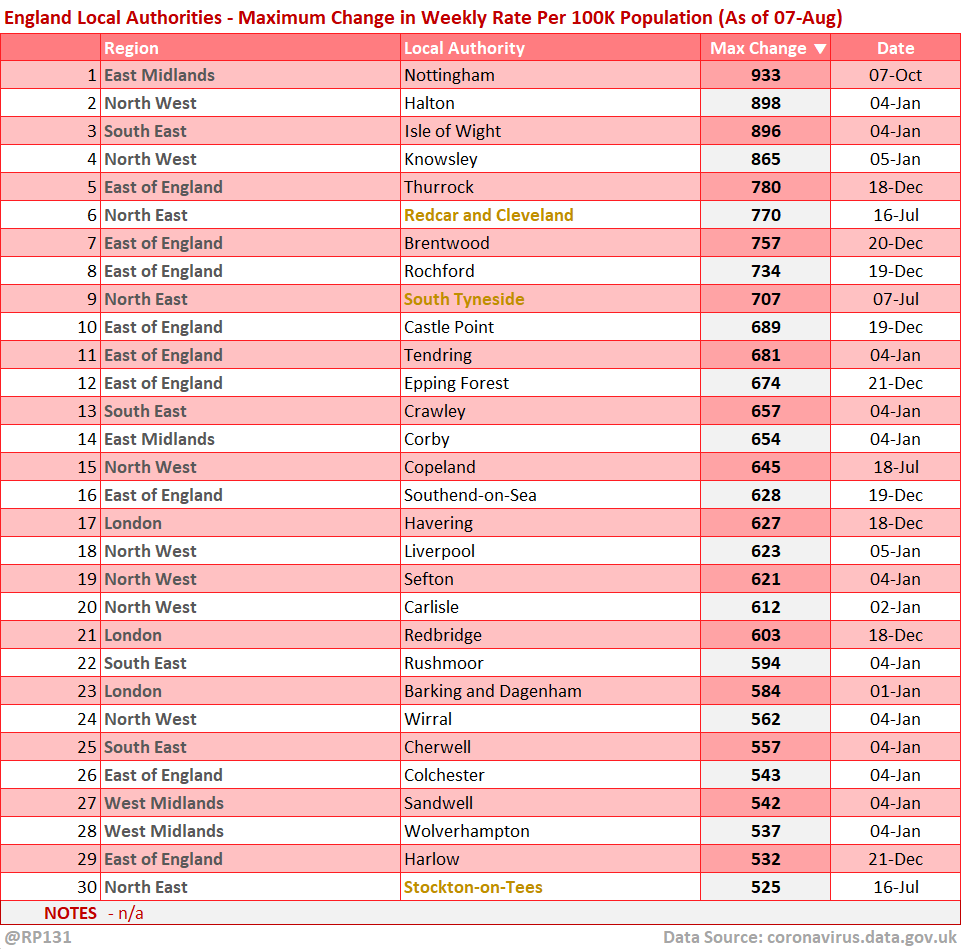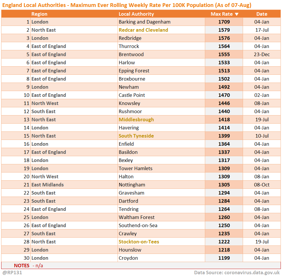 [9/13] Top 30 England local authorities by maximum weekly rate per 100K population recorded to date.