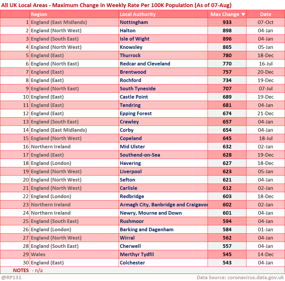 [12/13] Top 30 England/UK-wide local areas by maximum change in weekly rate per 100K population.