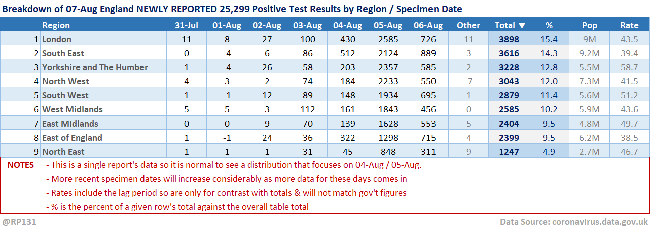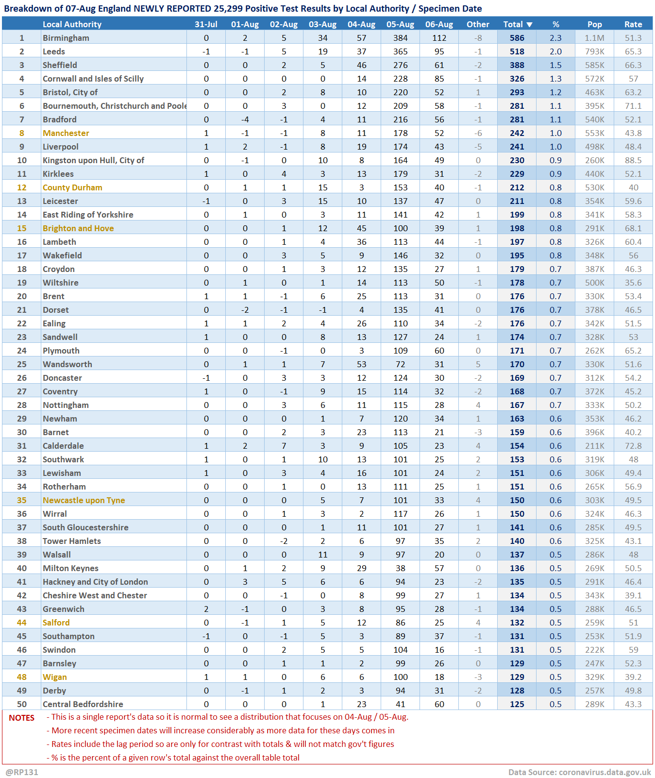 [4/13] Table view of today's 25,299 NEWLY REPORTED England positive test results by local authority and recent specimen dates. Here showing top 50 authorities which represent 54% of the population, but have 60% of the positives.