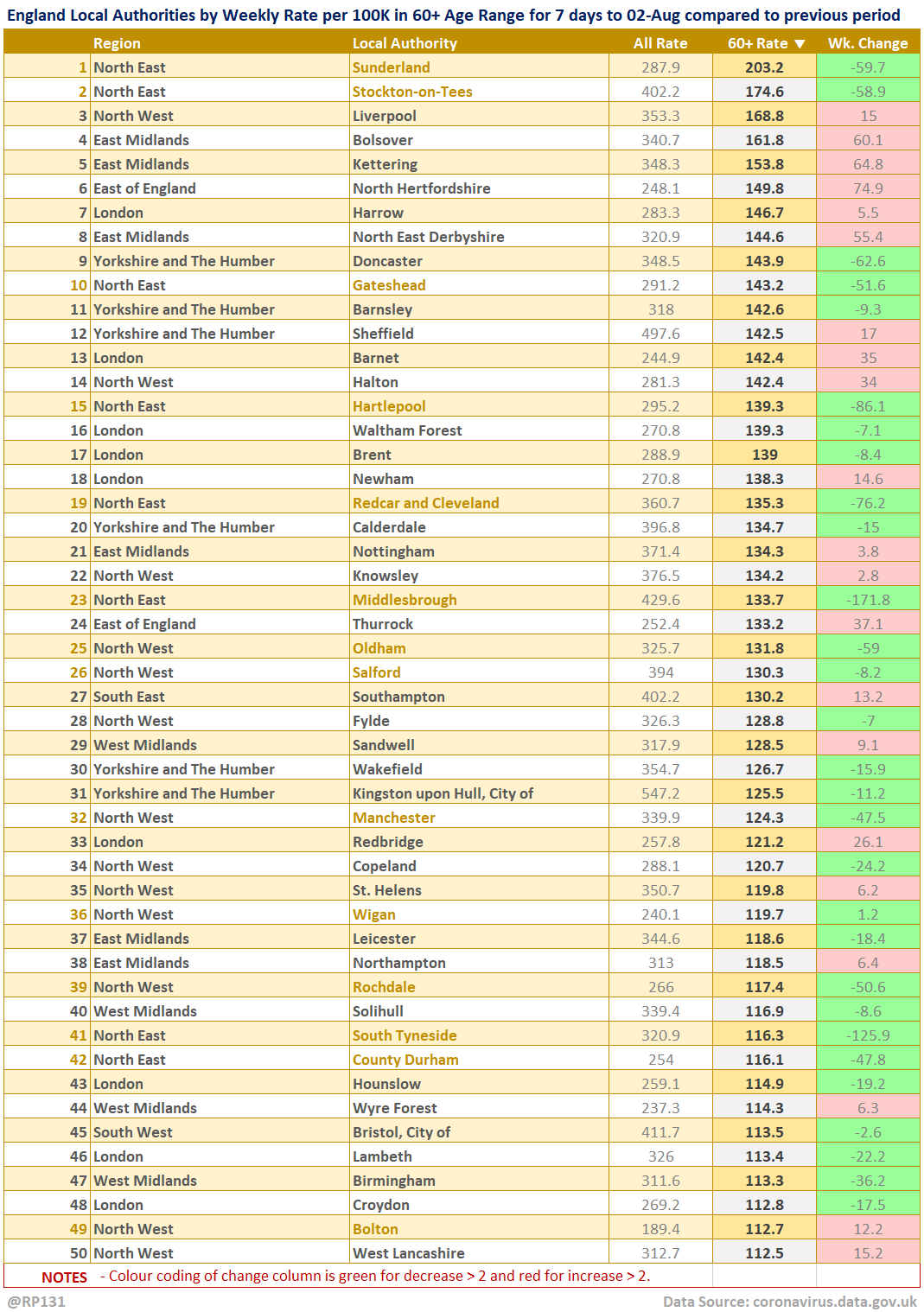[7/13] Top 50 table view of latest availble Local Authority data for the 60+ age range for 7 days to 02-Aug sorted by descending rate per 100K population (of that age range). Change column is compared to previous week with red for increase and green for decrease.