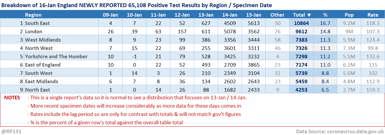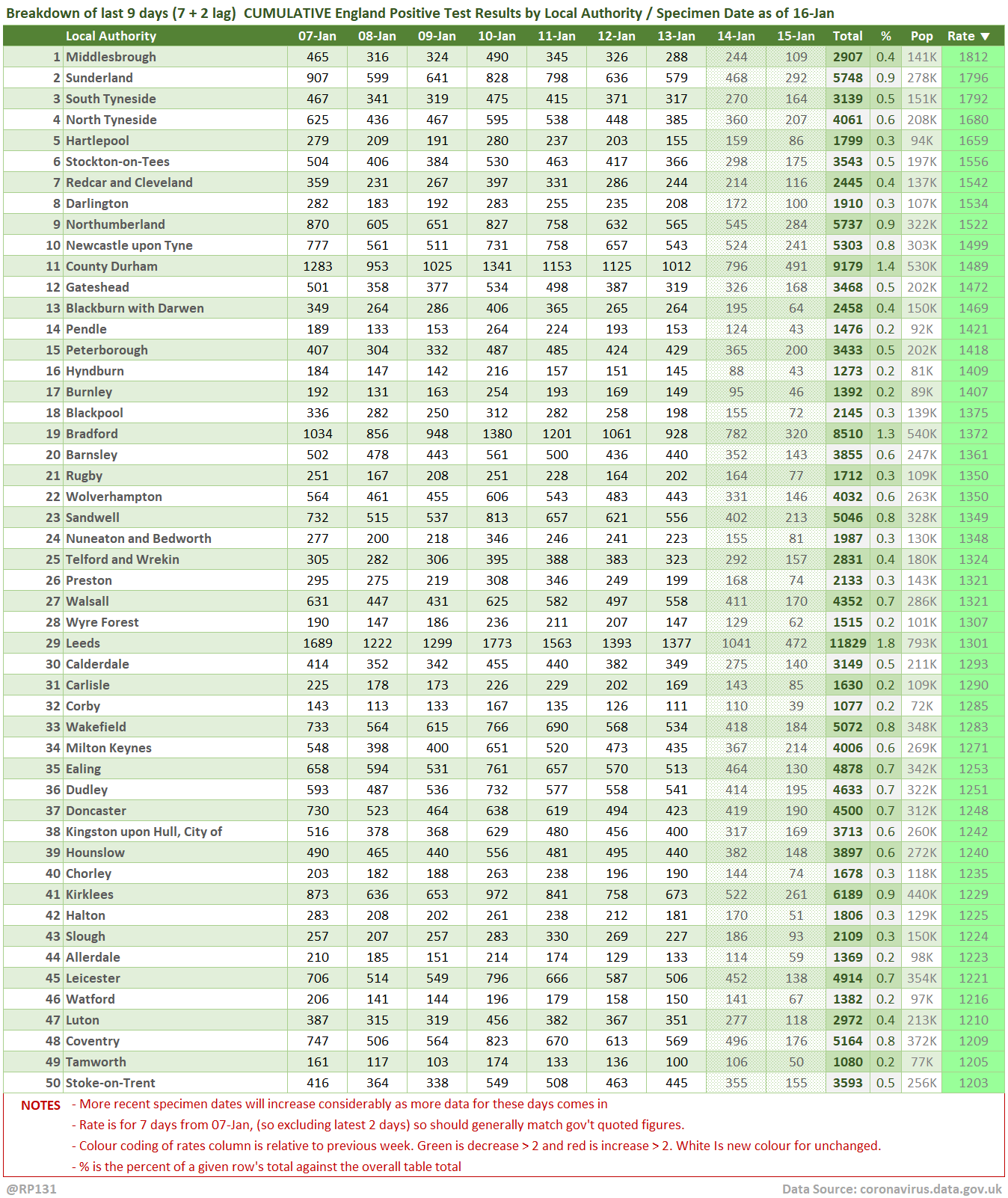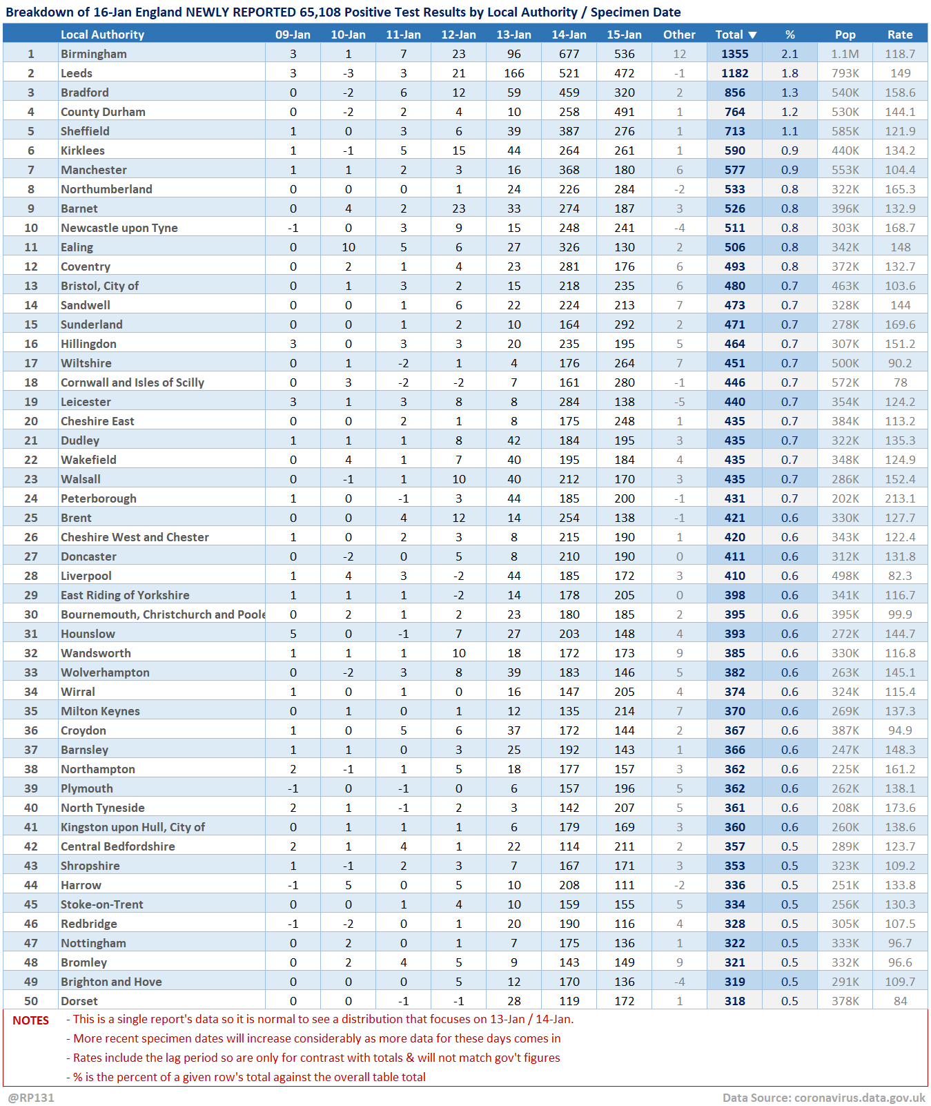 [4/13] Table view of today's 65,108 NEWLY REPORTED England positive test results by local authority and recent specimen dates. Here showing top 50 authorities which represent 54% of the population, but have 57% of the positives.