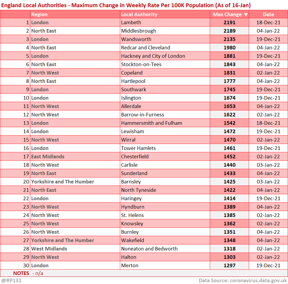 [12/13] Top 30 England/UK-wide local areas by maximum change in weekly rate per 100K population.