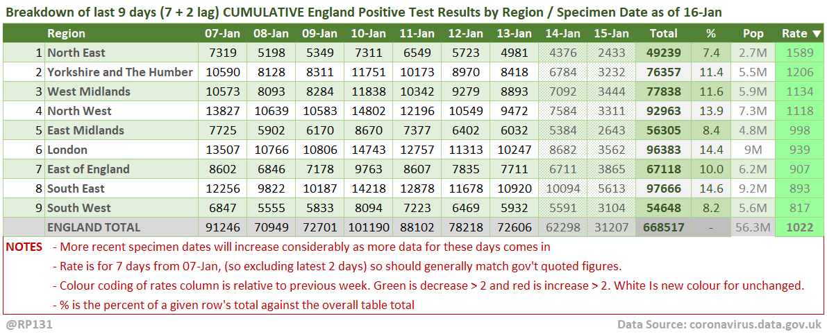 [1/13] #covid19uk - Tables thread. Starting with the top 50 England Local Authorities by positives per 100K population in last 7 days, up to 3 days ago. Bright green means lower than previous period.