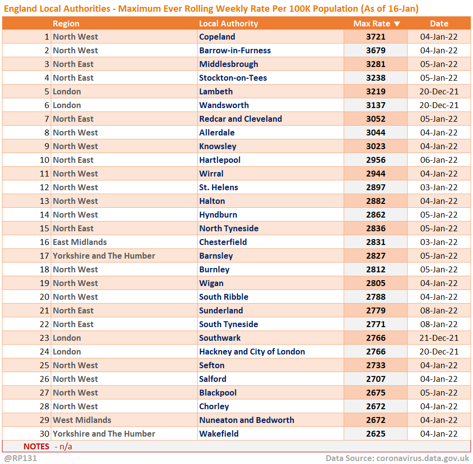 [9/13] Top 30 England local authorities by maximum weekly rate per 100K population recorded to date.