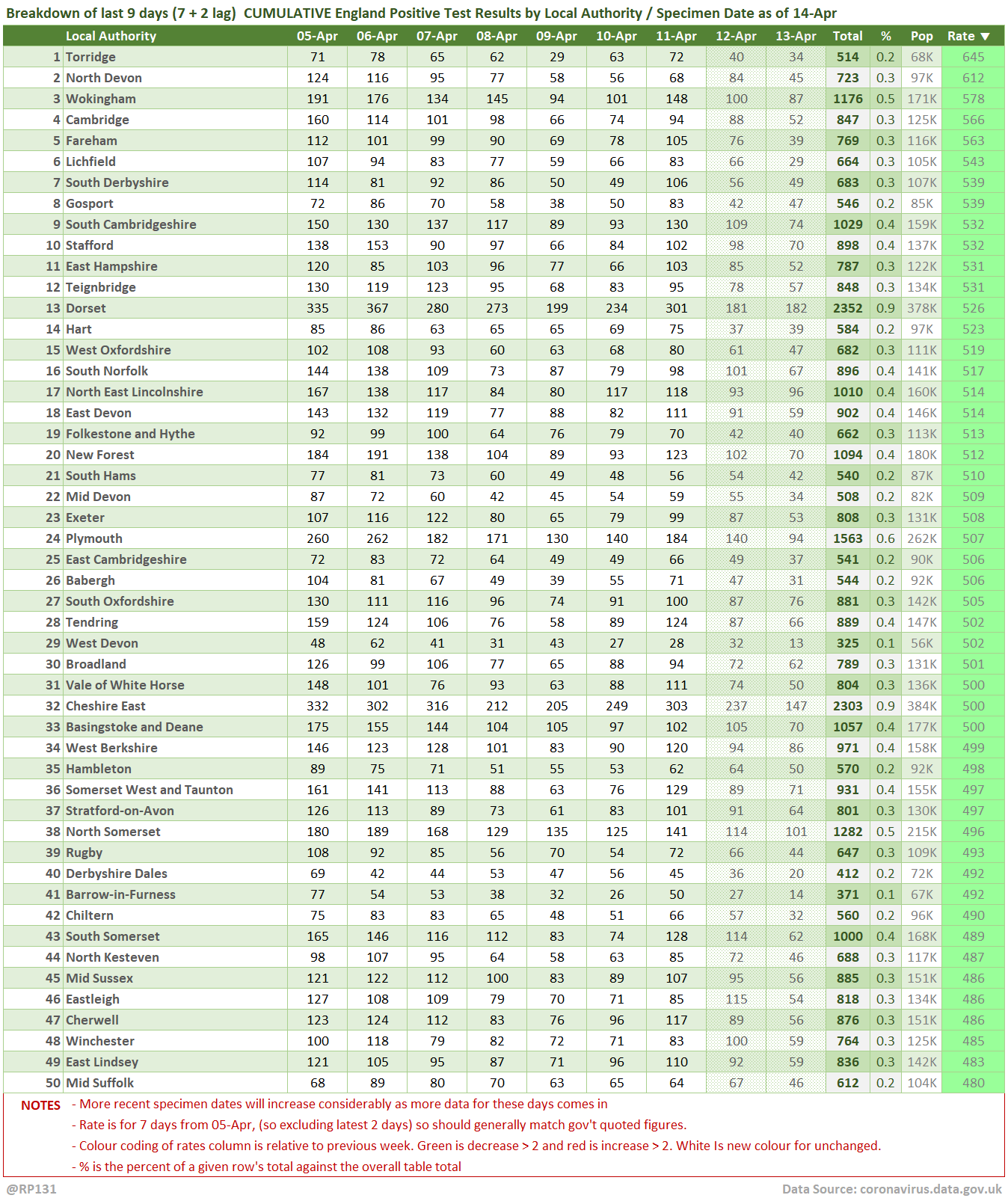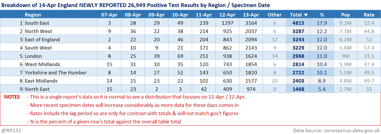 [4/13] Table view of today's 26,949 NEWLY REPORTED England positive test results by local authority and recent specimen dates. Here showing top 50 authorities which represent 51% of the population, but have 53% of the positives.