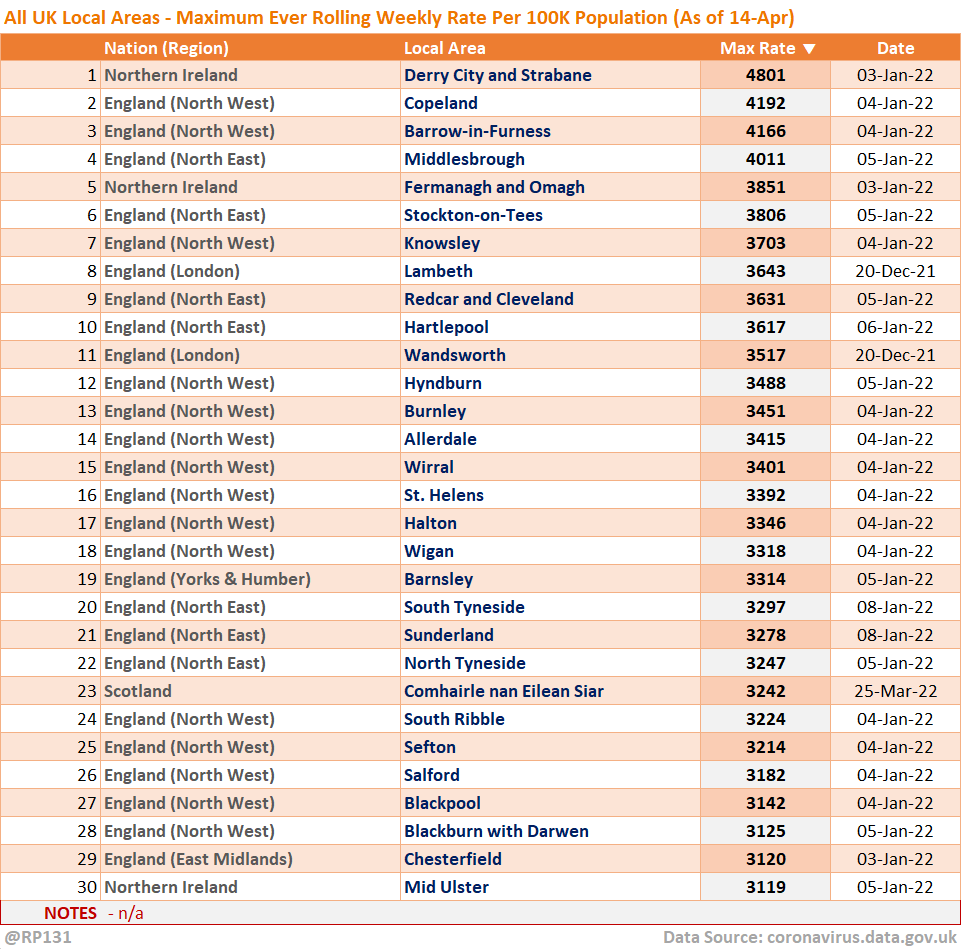 [10/13] Top 30 UK-wide local areas by maximum weekly rate per 100K population recorded to date.