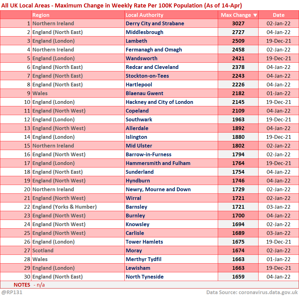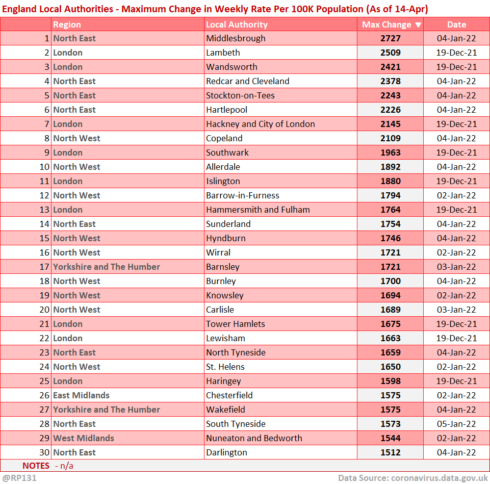 [12/13] Top 30 England/UK-wide local areas by maximum change in weekly rate per 100K population.