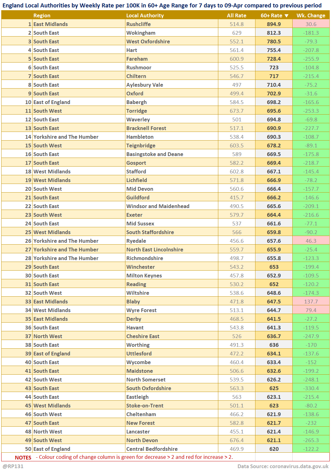 [7/13] Top 50 table view of latest availble Local Authority data for the 60+ age range for 7 days to 09-Apr sorted by descending rate per 100K population (of that age range). Change column is compared to previous week with red for increase and green for decrease.