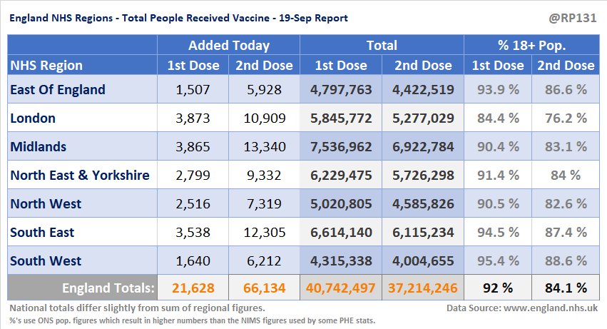 [6/6] Table view of today's (19-Sep) updated England NHS region vaccination data.